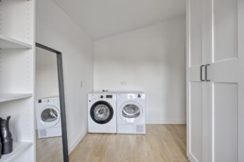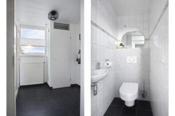 Aan de entree van deze woning zijn gelegen de moderne meterkast, garderobe, toegang tot de woonkamer met open keuken en de toiletruimte welke voorzien is van strak tegelwerk, een wandcloset en een fonteintje.
