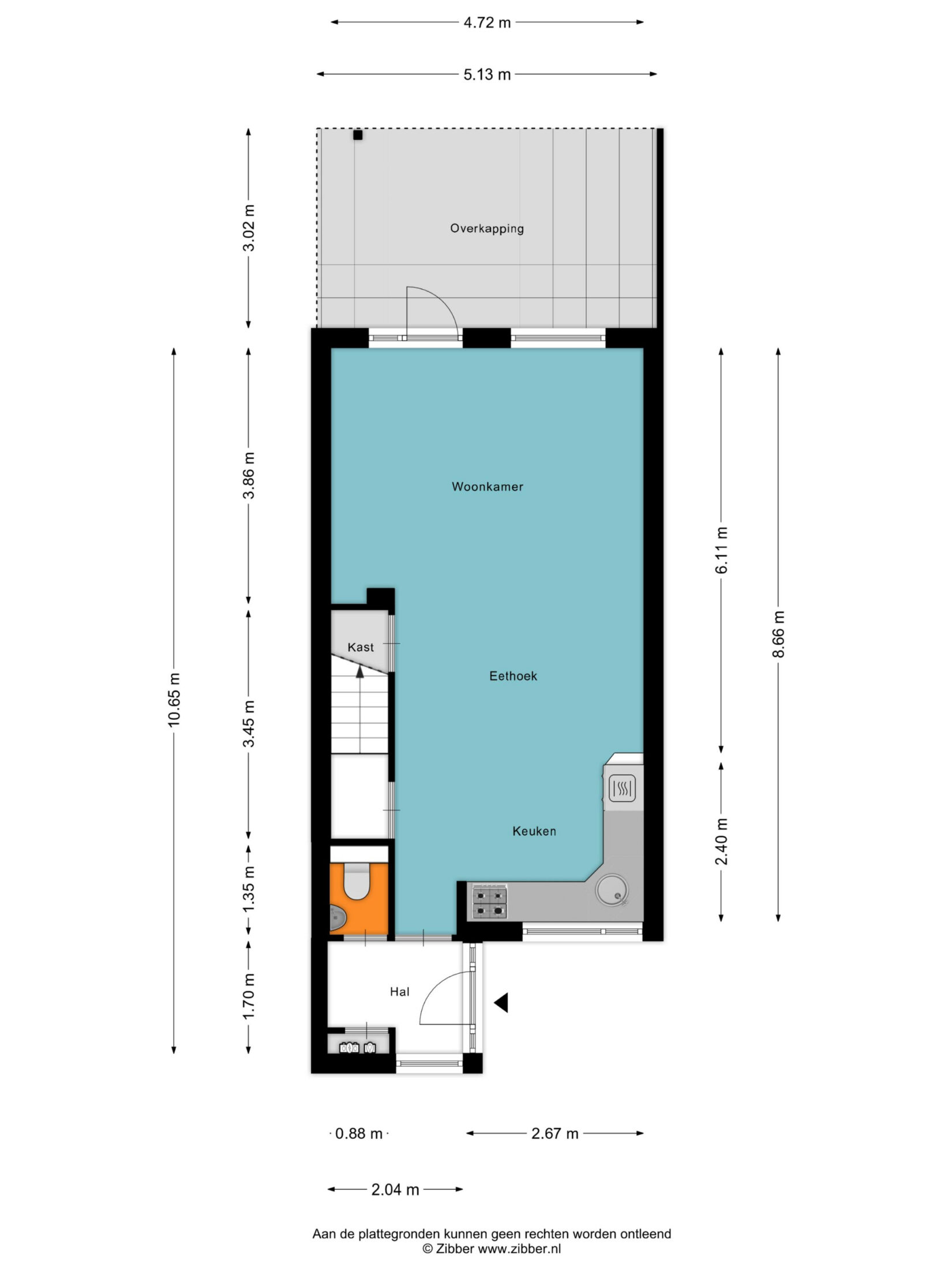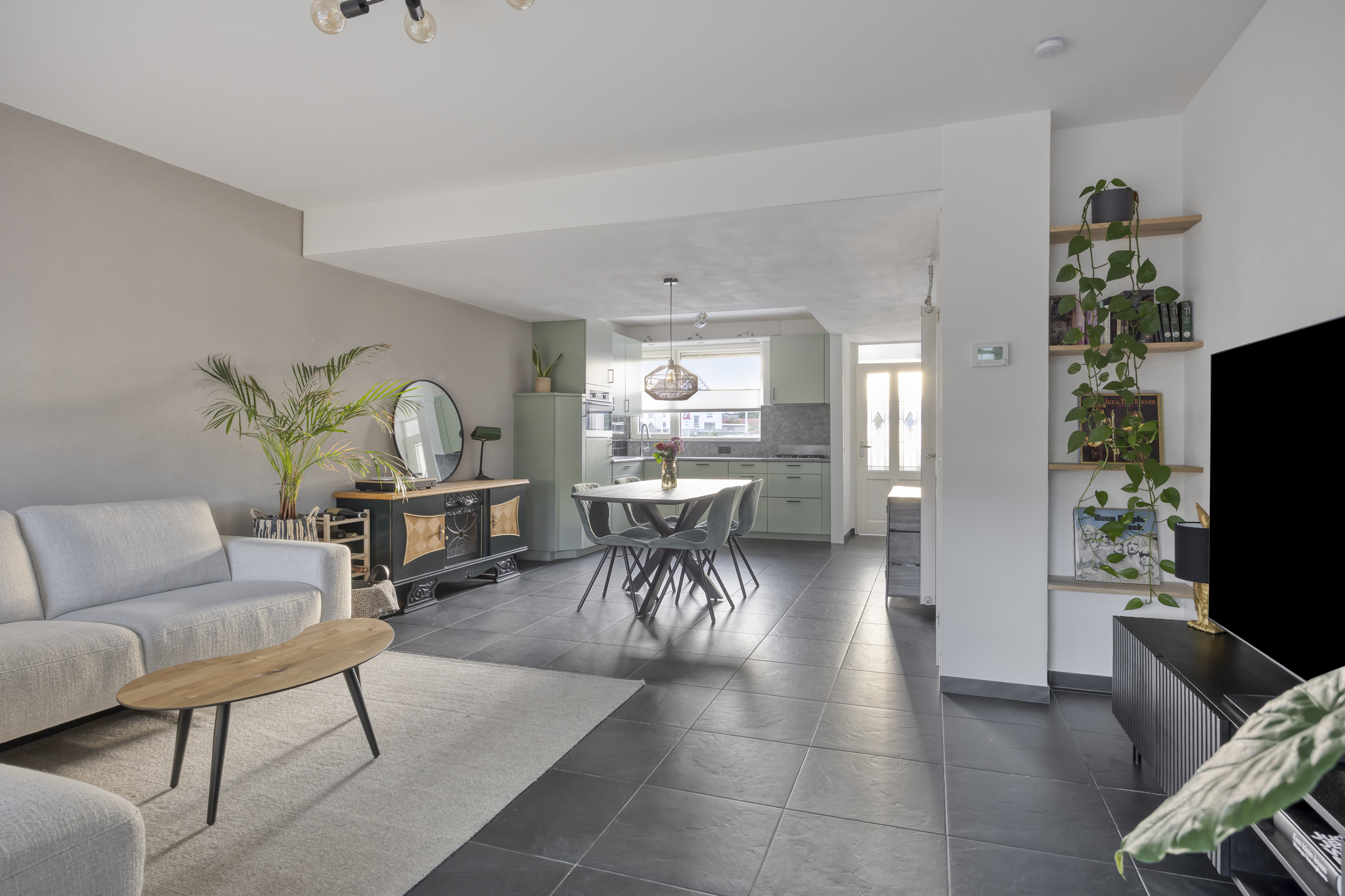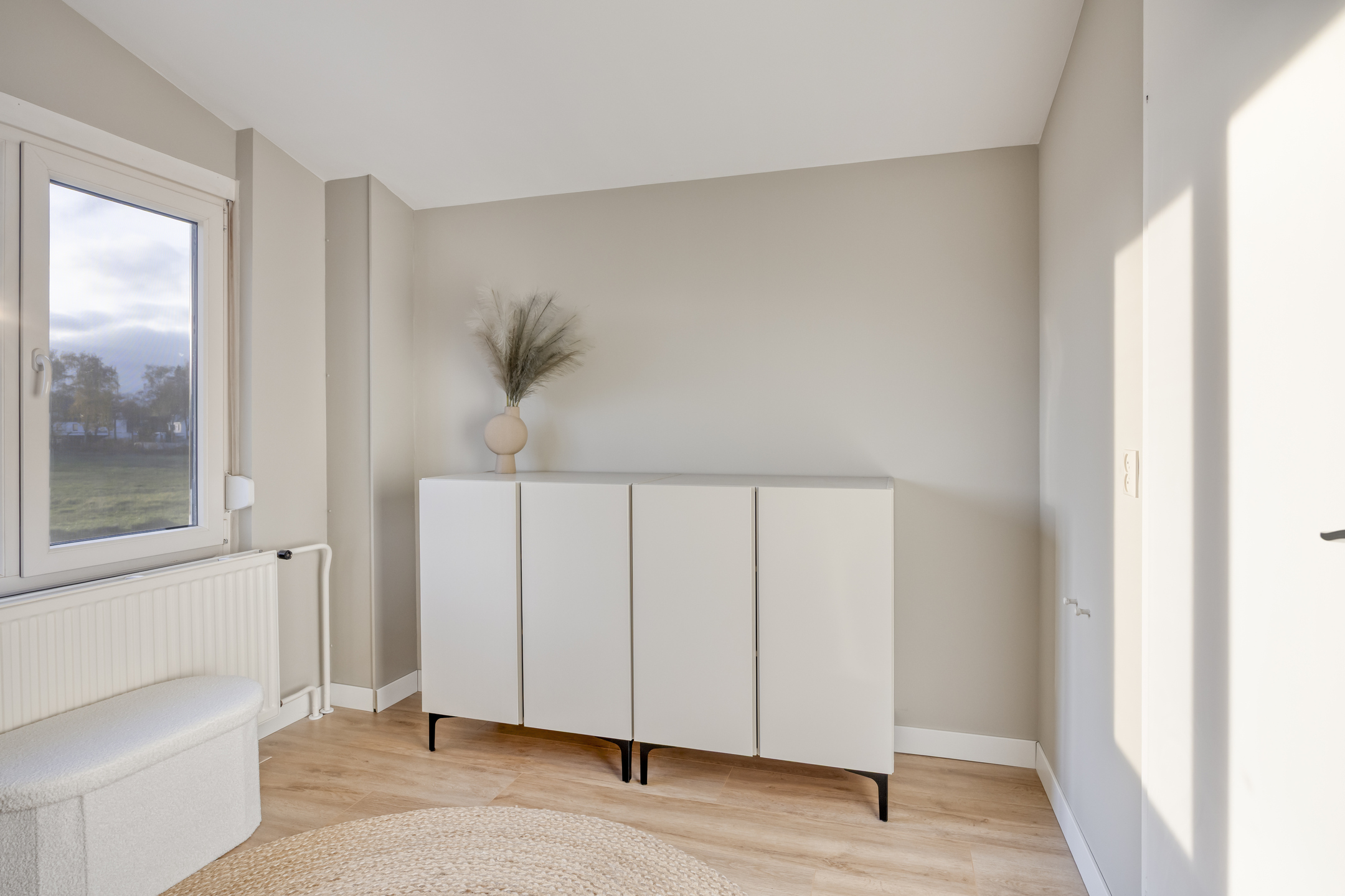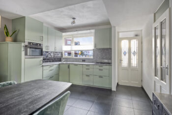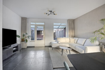 Aan de achterzijde heeft u ruimte een grote en ruime bank op te stellen. De achtergevel is voorzien van grote raamkozijnen en vanuit hier krijgt u toegang tot de achtertuin. Ook beschikt deze zithoek over een fraai nisje met diverse wandplanken om uw interieur sfeervol aan te kleden. De deuren aan de linkerzijde van de woonkamer geven toegang tot respectievelijk de trapopgang en de bergingskast.