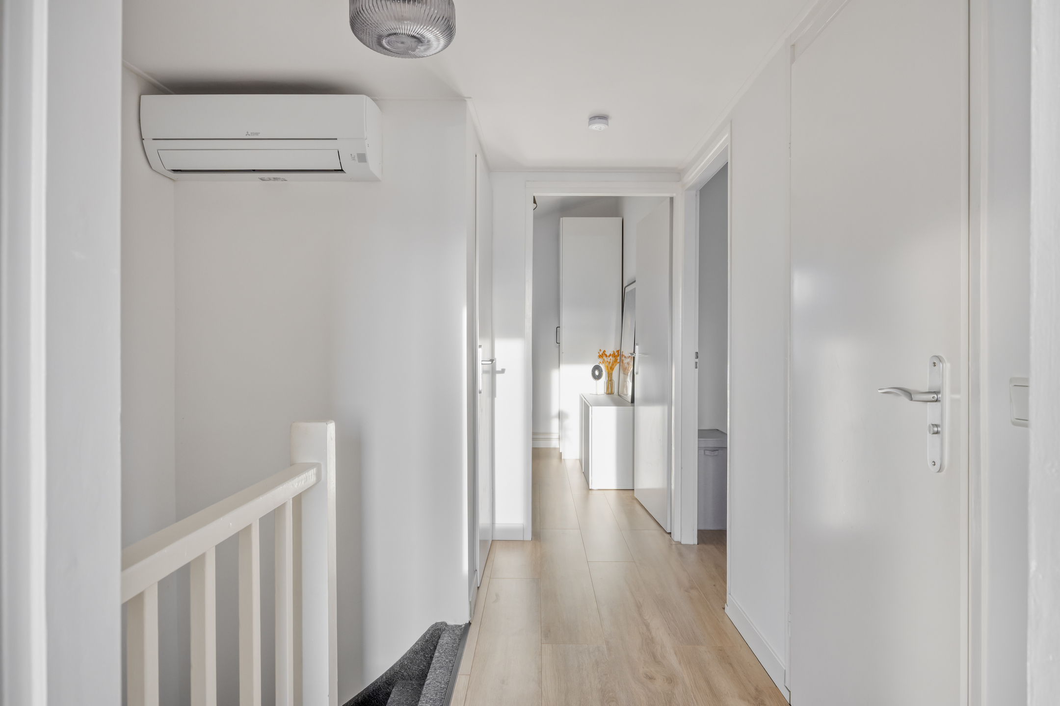 Via de trapopgang bereikt u de overloop van de eerste verdieping. Aan deze overloop zijn gelegen de drie slaapkamers, de badkamer en de inbouwkast waar de C.V.-ketel gesitueerd is. De overloop beschikt over een airconditioningssysteem om het gewenste binnenklimaat te verzorgen!