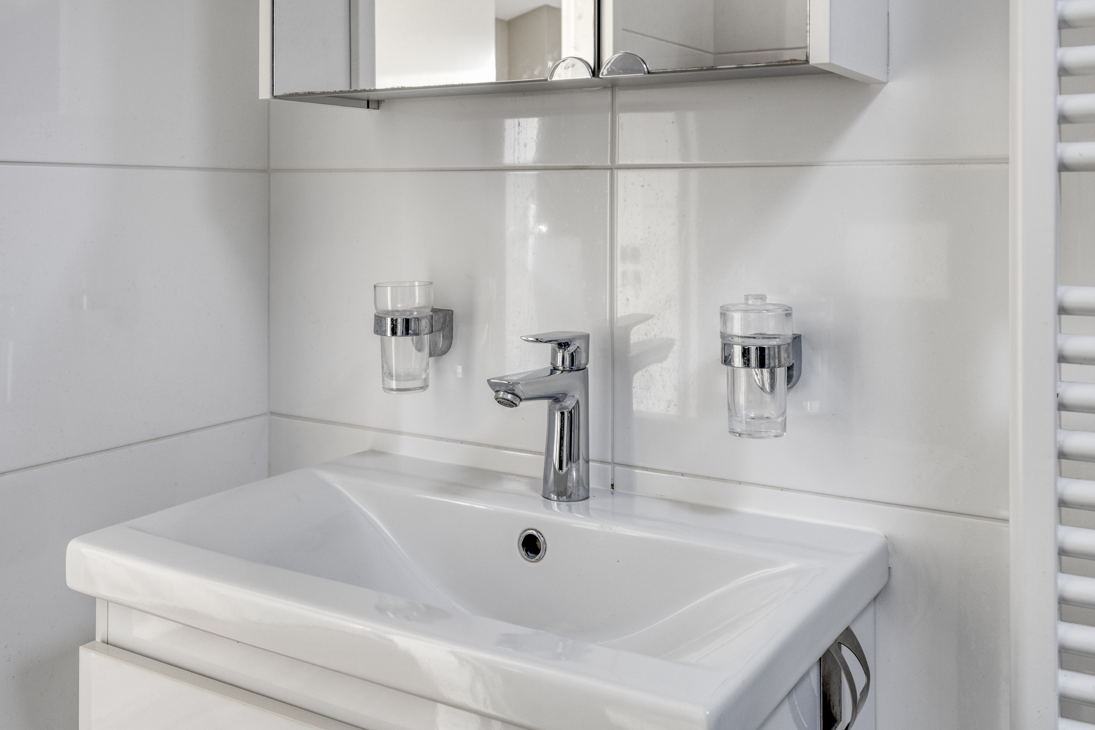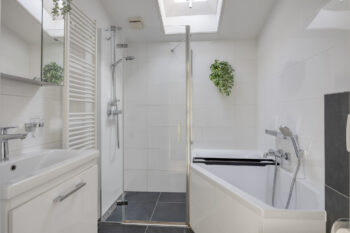 Zeer nette, moderne en goed onderhouden badkamer voorzien van strak tegelwerk en ventilatie zowel natuurlijk als mechanisch. Verder beschikt deze fraaie badkamer over een inloopdouche met glazen wanden en deur, een ligbad met handkraan, wandcloset en wastafelmeubel.