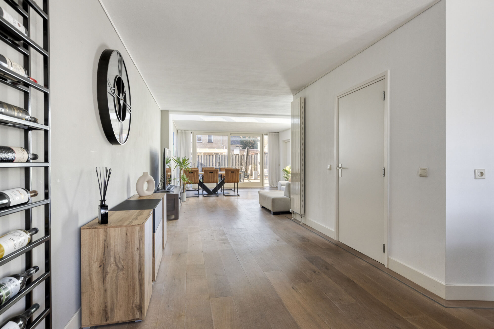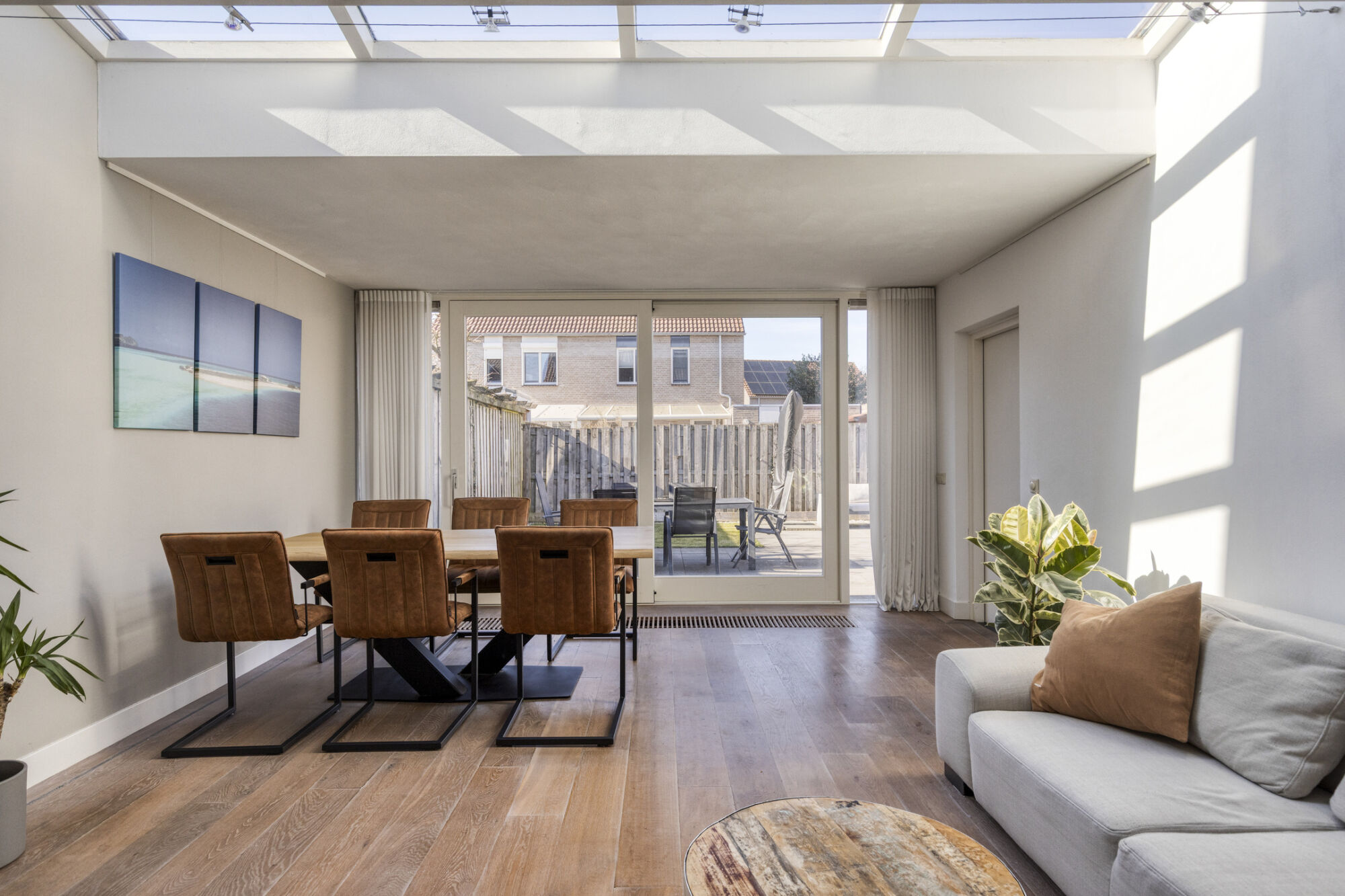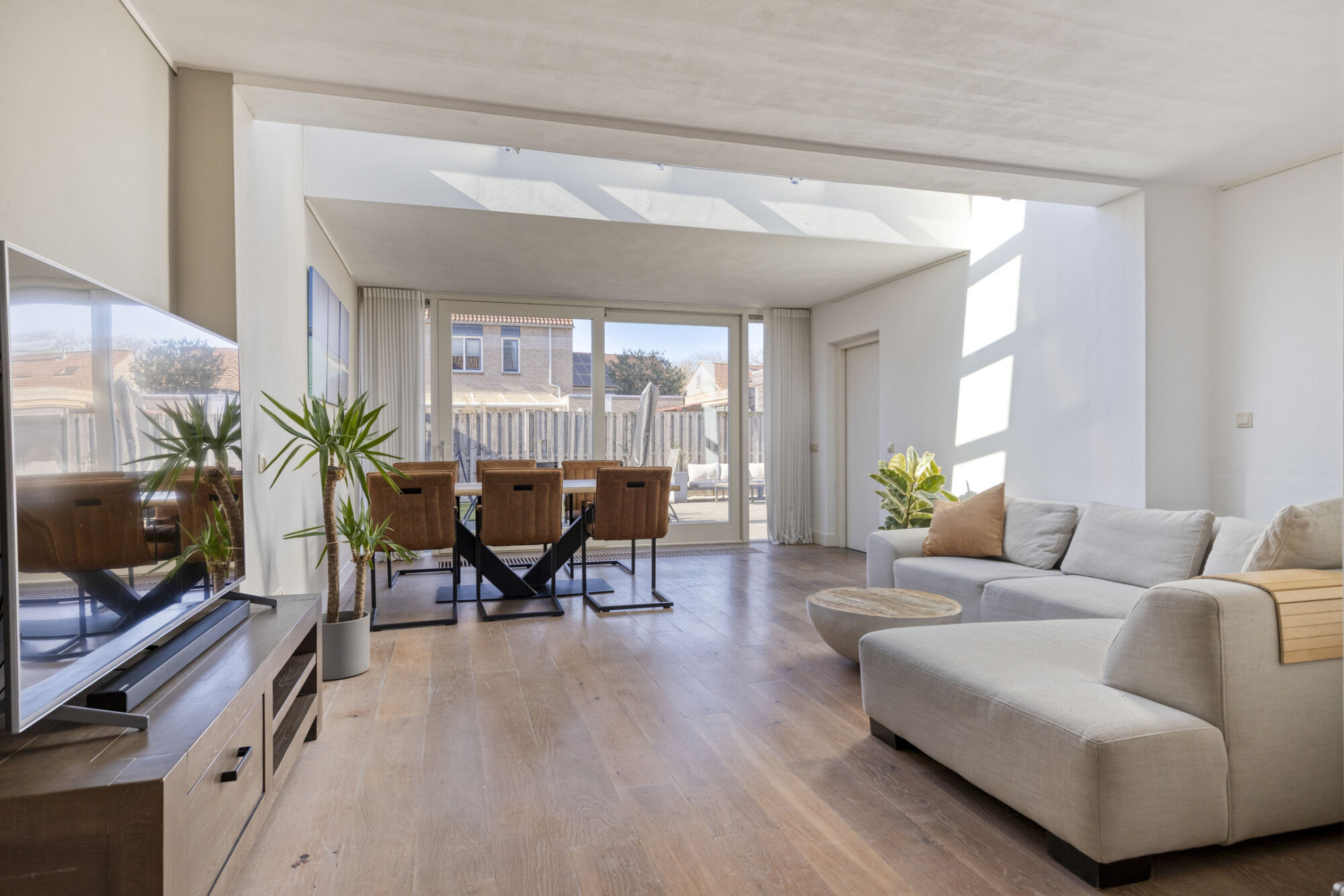 Door de aanwezigheid van een schuifpui heeft u vanuit hier een prettig contact met de achtertuin. Middels de grote raampartijen en de lichtstraat in de aanbouw is zowel het zit- als eetgedeelte voorzien van veel natuurlijke lichtinval, waardoor het huis heel prettig aanvoelt. De vloer in de woonkamer is belegd met een fraaie parketvloer.