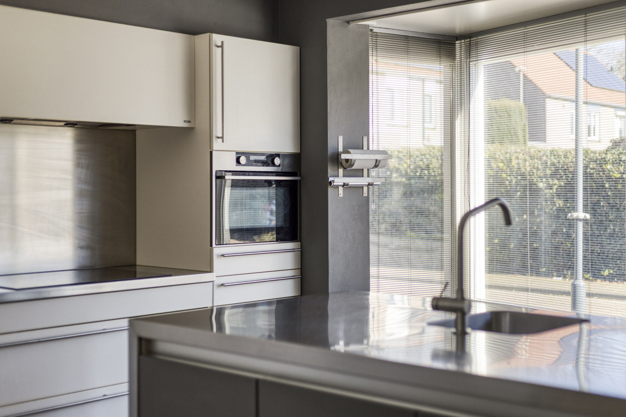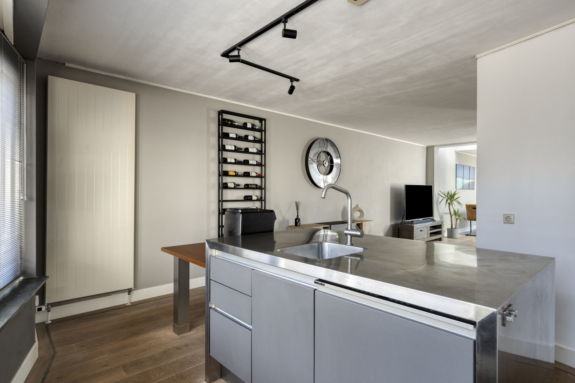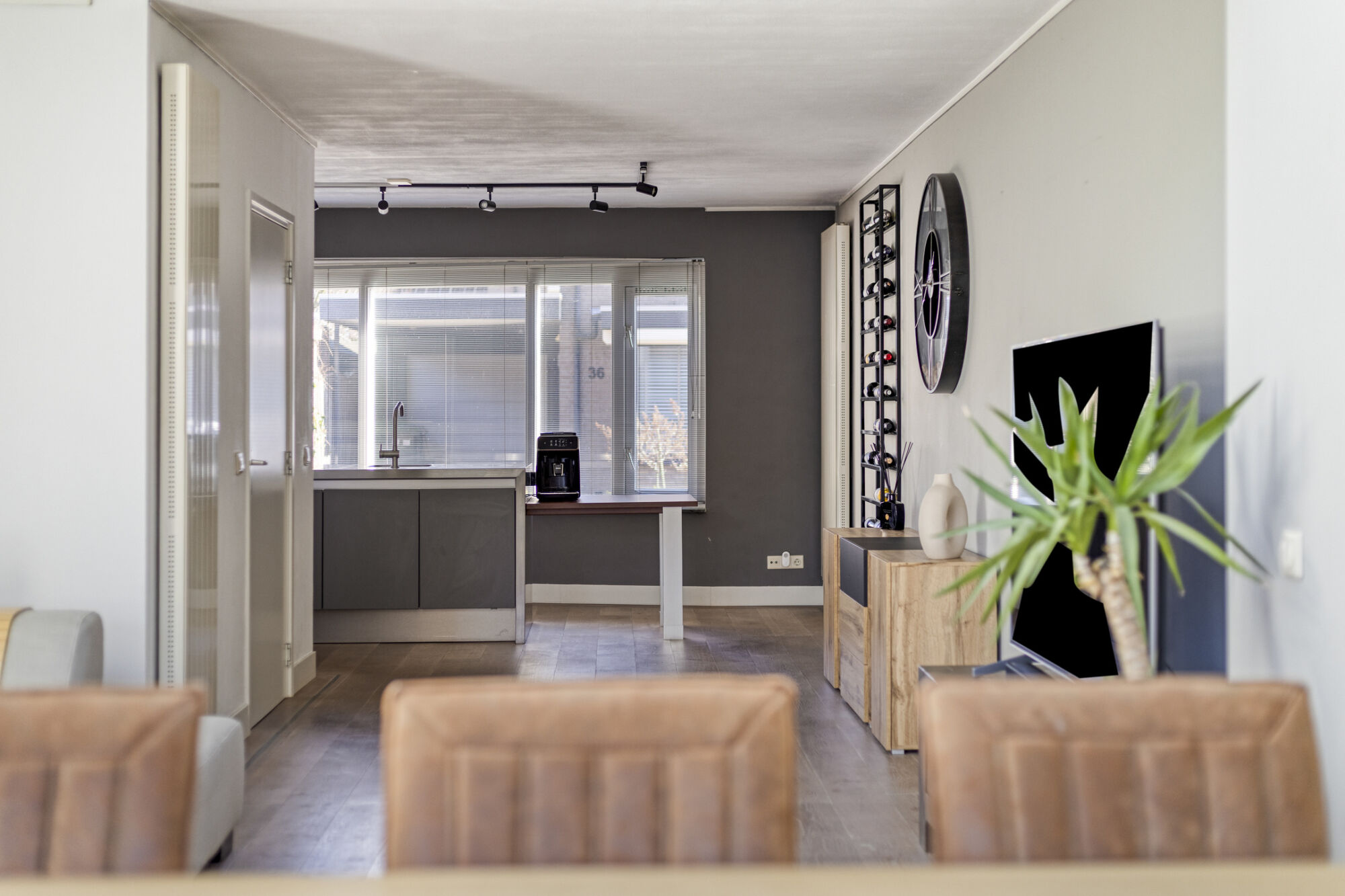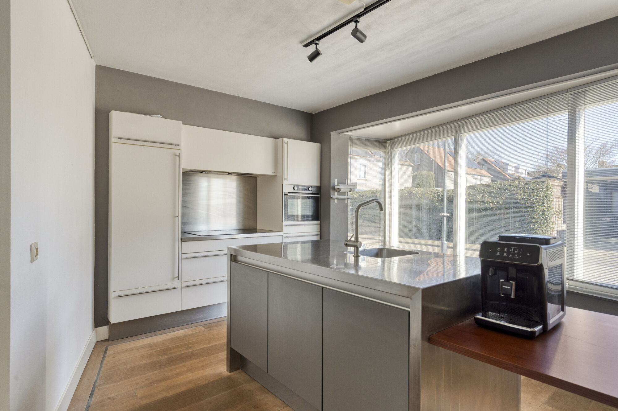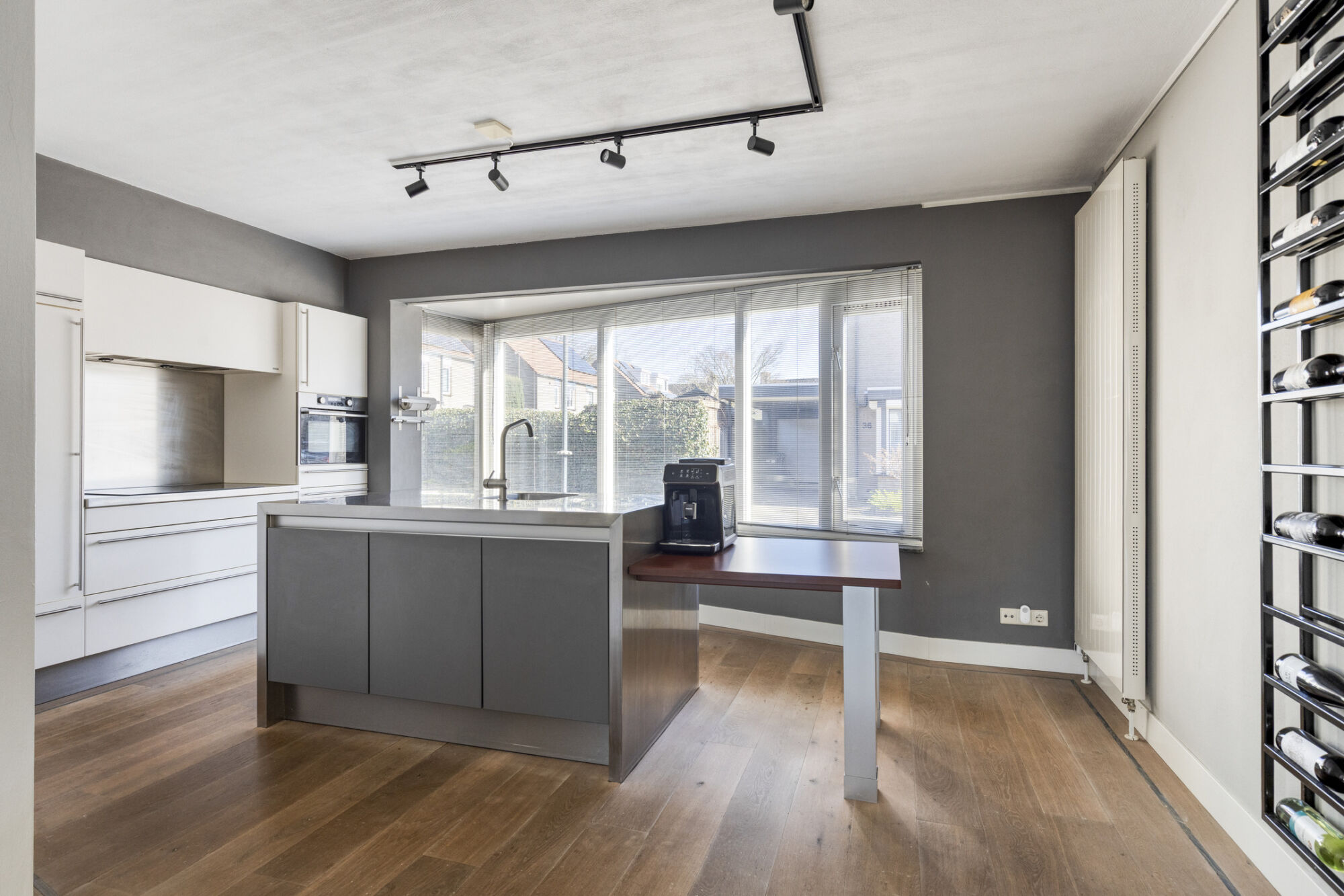 Gelegen aan de voorzijde treffen we de ruime keuken. De open keuken is door middel van de vele raampartijen voorzien van veel lichtinval, daarnaast kijkt u hierdoor fijn weg over de straat. De luxe keukeninrichting met kookeiland is uitgerust met veel kastruimte, een vaatwasser, een combi-oven, een inductiekookplaat, een afzuigkap en een koelkast.
