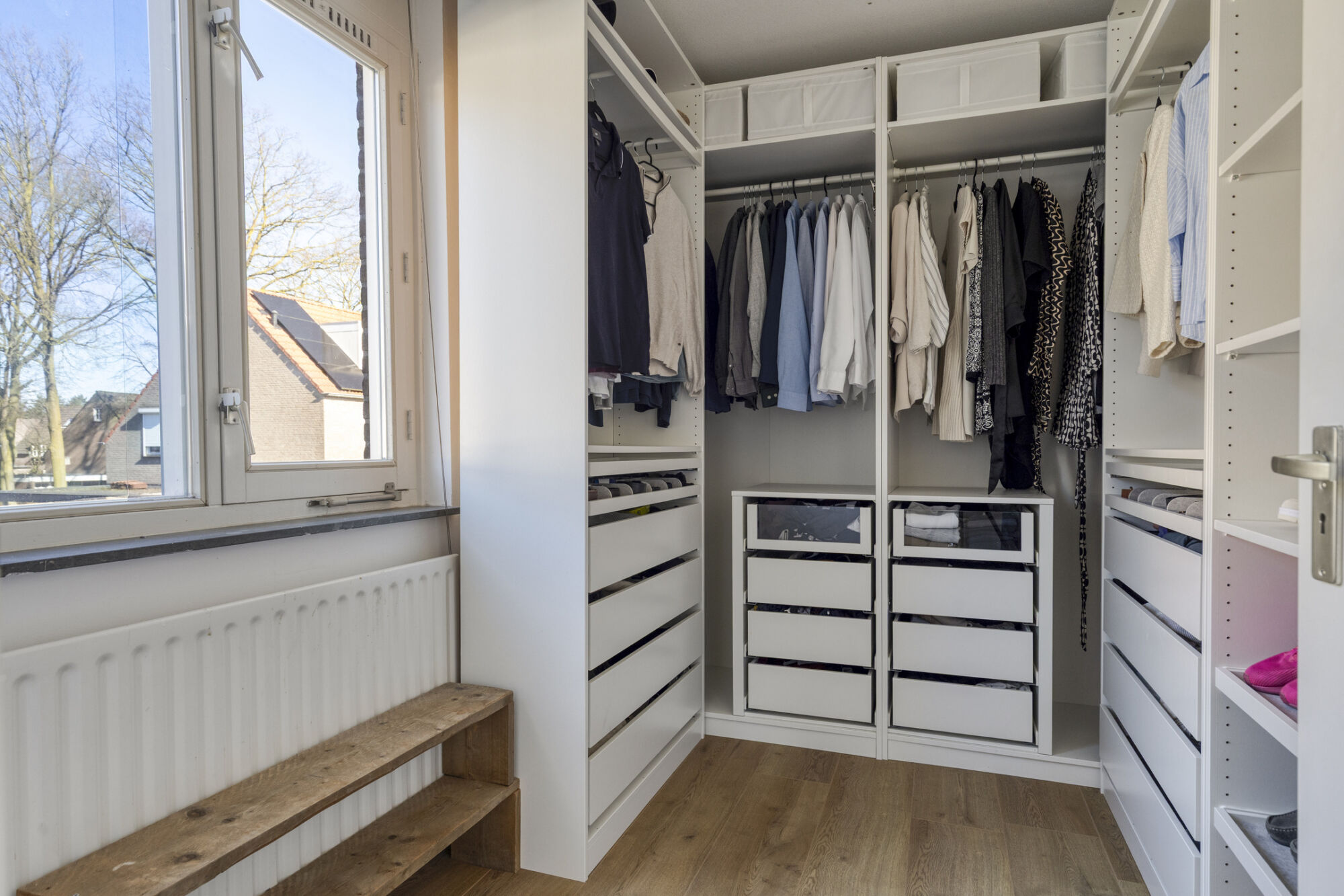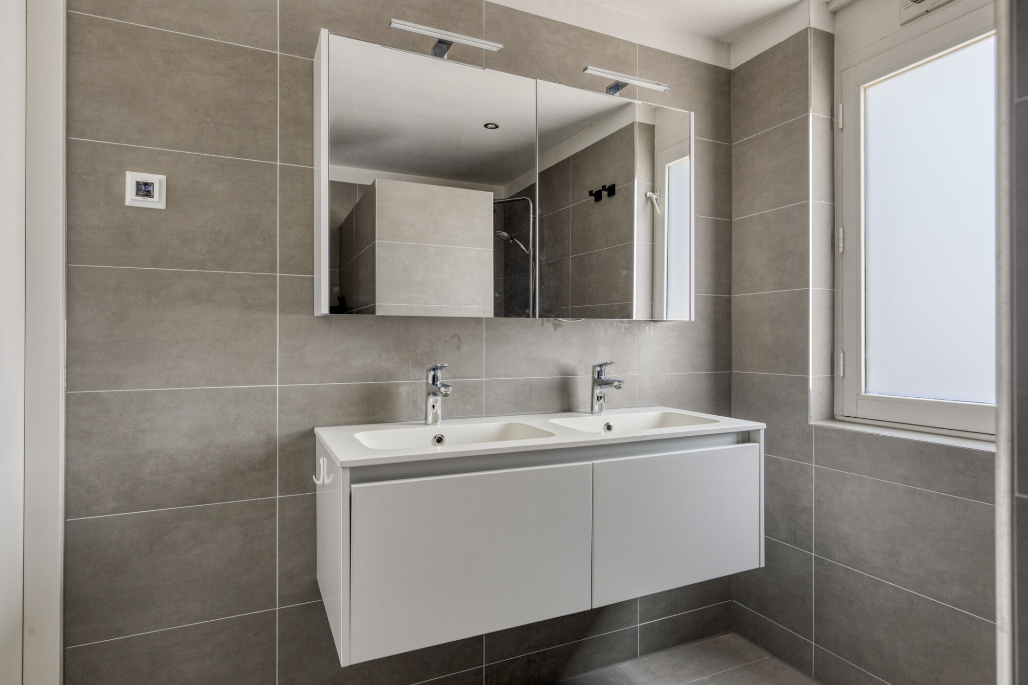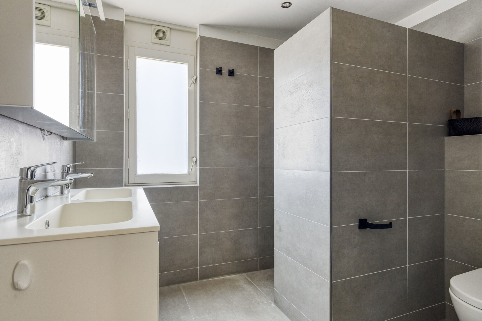De gemoderniseerde badkamer is voorzien van een inloopdouche, een wandcloset, een dubbele wastafel met meubel, een luxe spiegelkast met verlichting, elektrische vloerverwarming en mechanische ventilatie. Hier komt u niks tekort.