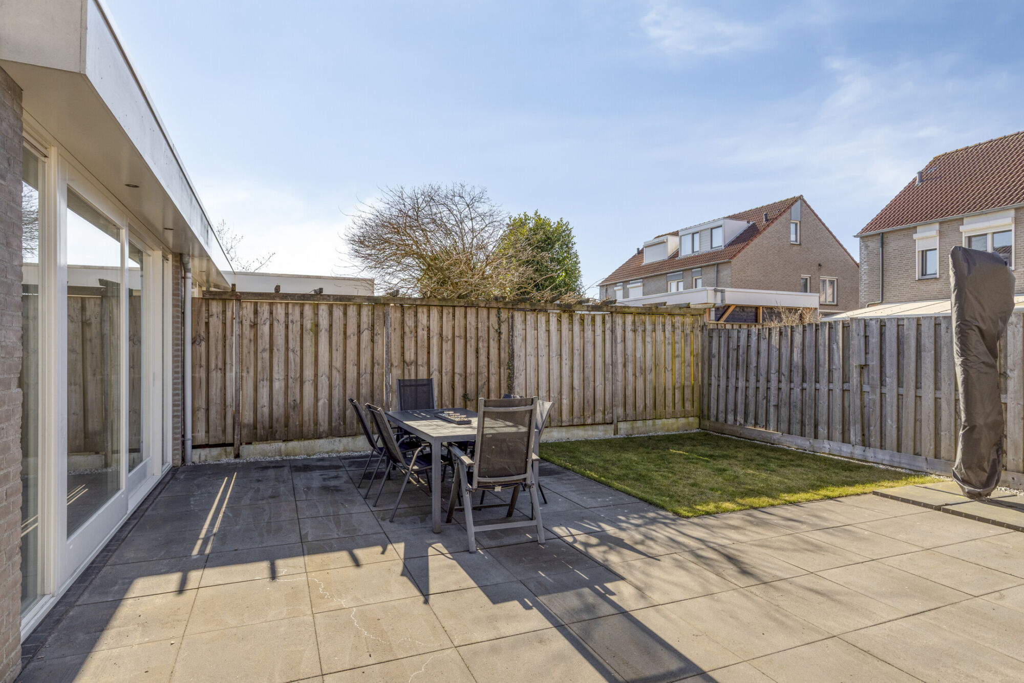 Terug naar de begane grond waar u vanuit de woonkamer en de bijkeuken toegang heeft tot de tuin. De tuin op het westen is lekker zonnig en heeft een betegeld terras en een kunstgras gazon. Vanwege de ligging op het westen heeft u heerlijk de middag- en avondzon. Het geheel is uitermate onderhoudsvriendelijk aangelegd.