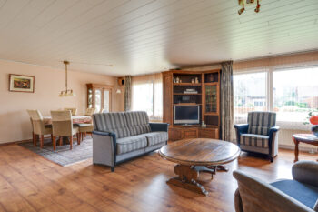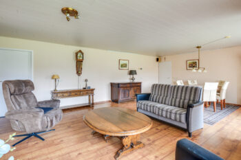 De royale woonkamer van ca. 47 m² vormt samen met de ruime keuken van ca. 21 m² het hart van de woning en biedt alle ruimte voor gezellig samenzijn, met een prachtig uitzicht op het omliggende groen.