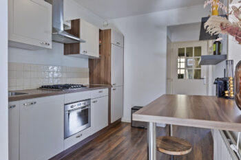 In de uitbouw bevindt zich een zeer praktische bijkeuken, deze bijkeuken is voorzien van de witgoedaansluitingen en de achterdeur richting de tuin.