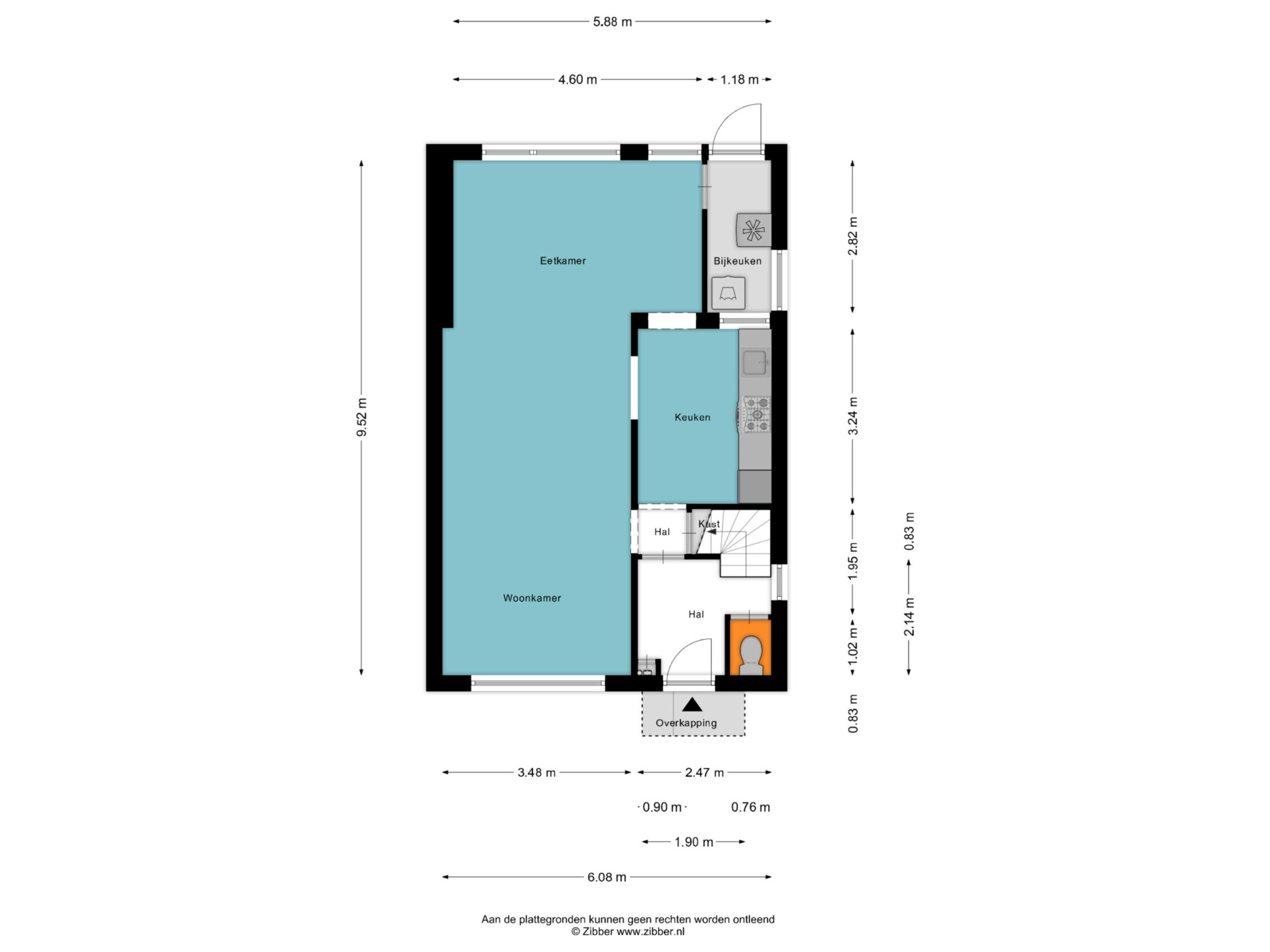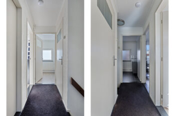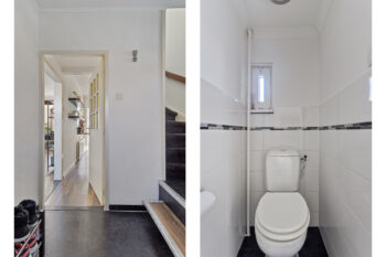 Via de overdekte entree bereiken we de hal van de woning waaraan gelegen zijn de toiletruimte voorzien van strak tegel- en stucwerk, de trapopgang, meterkast en de toegang richting de woonkamer en keuken.