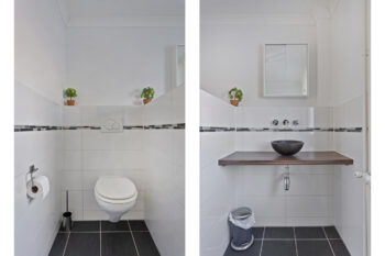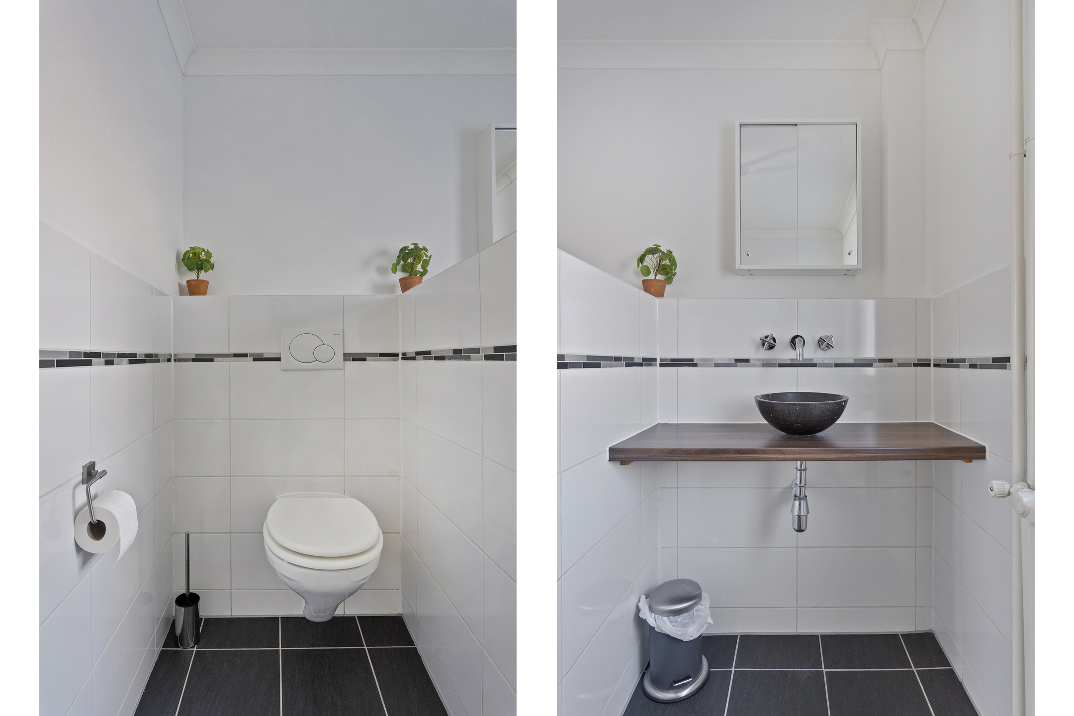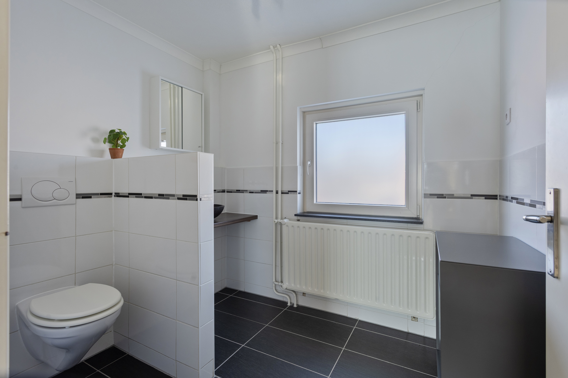Aan de voorzijde bevindt zich de badkamer, voorzien van strak tegelwerk, een wandcloset en een moderne wastafeluitvoering. Tevens bevindt zich een raamkozijn in deze badkamer ten behoeve van ventilatie en daglichttoetreding. Aan de overloop bevindt zich ook de doucheruimte, wederom voorzien van strak tegelwerk en een nette uitvoering.