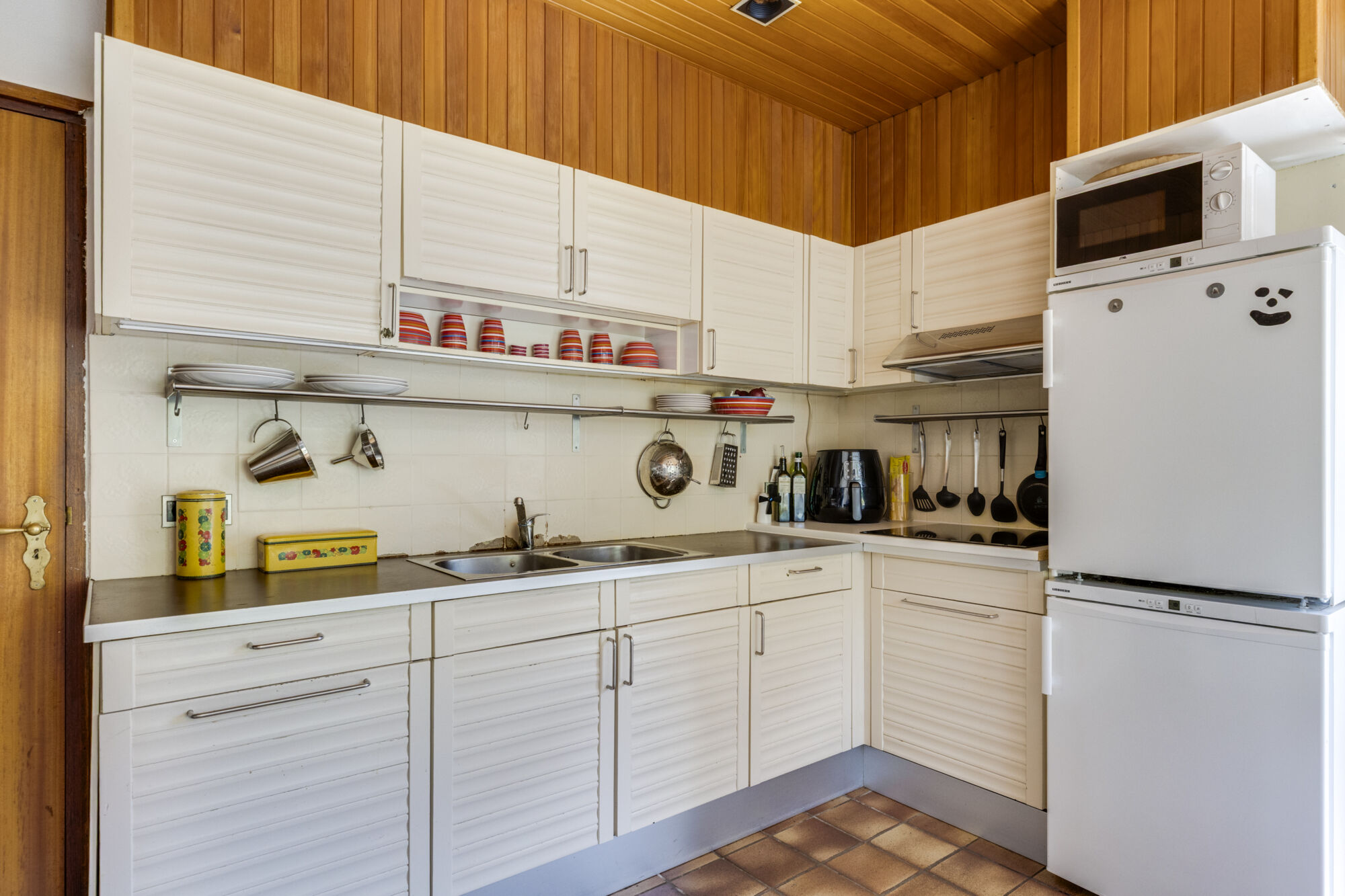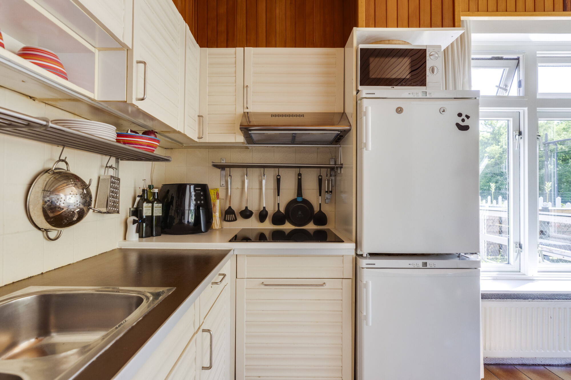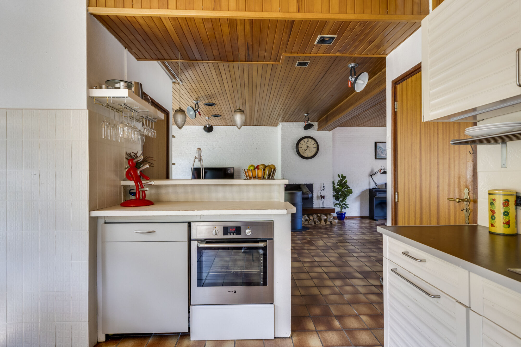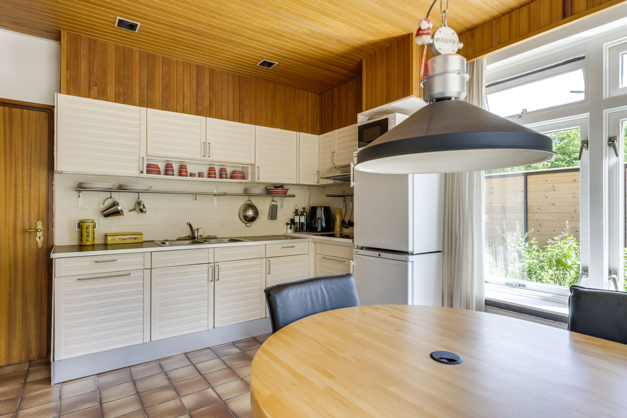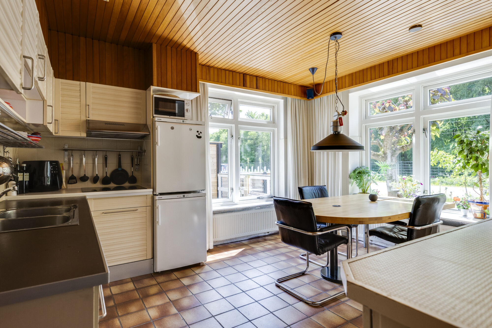 De keuken bestaat uit een hoekopstelling en een gezellige bar met ingebouwde oven. Volop berg- en werkruimte. Ook hier kun je een grote eettafel plaatsen. Een gezellige hoek met uitzicht op de zijtuin en de voortuin met bomen op de achtergrond.