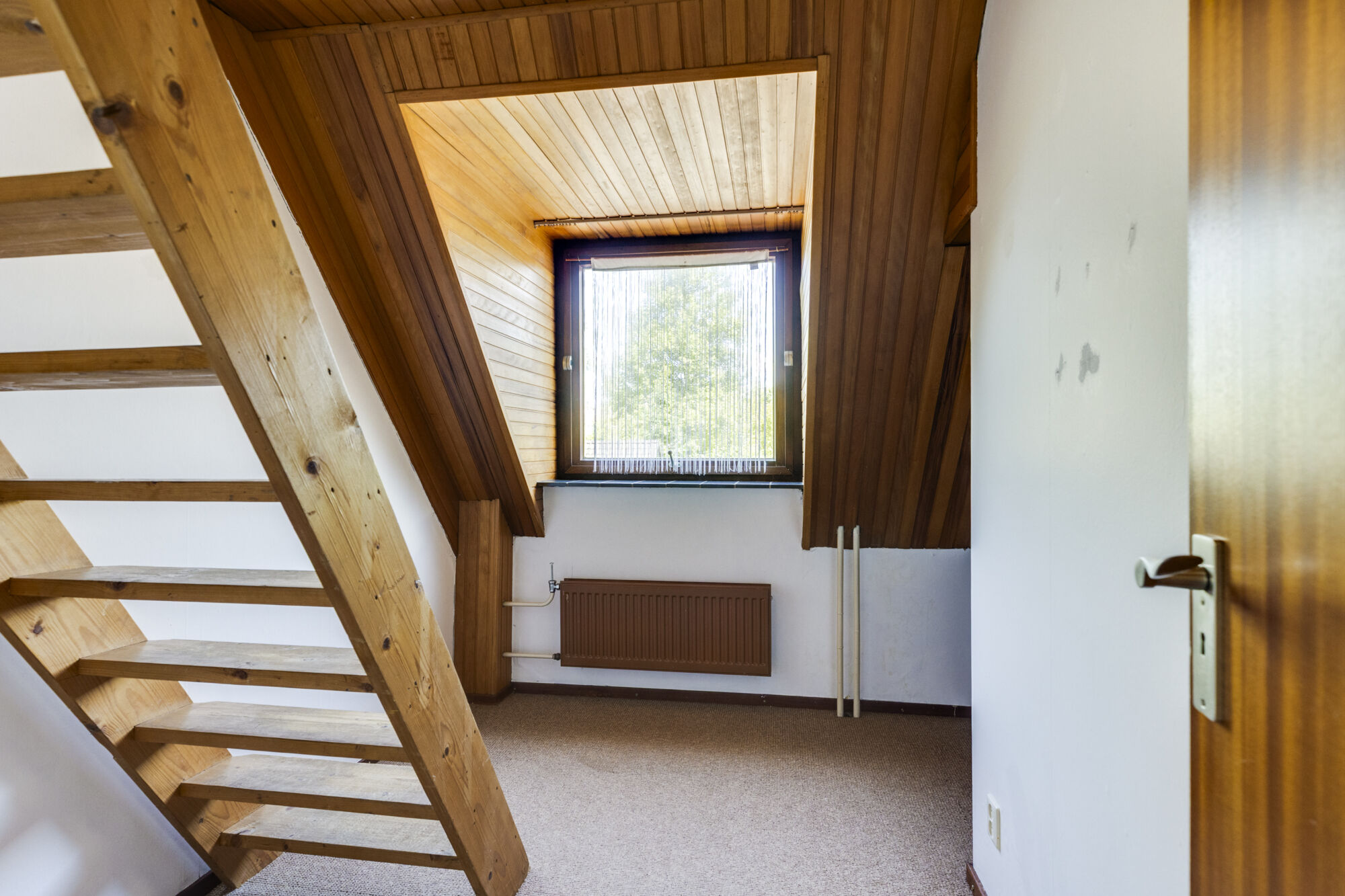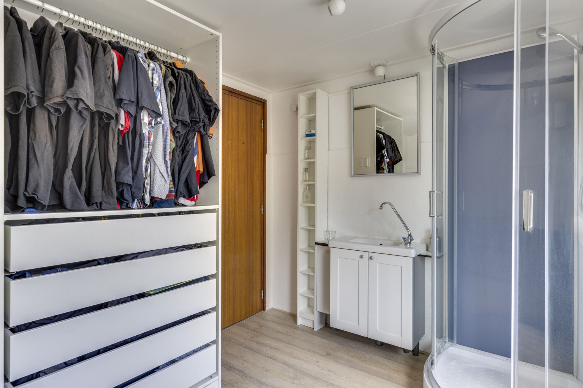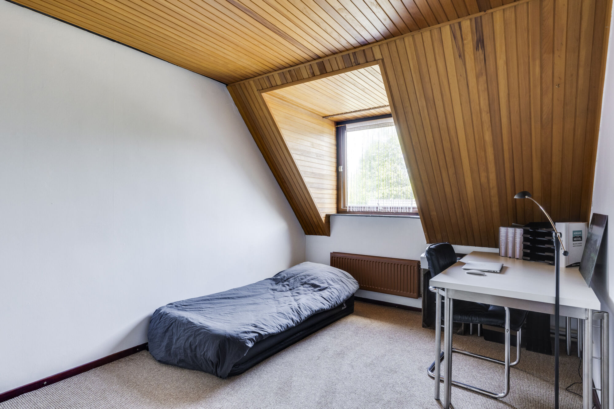 Vanuit de woonkamer is de trap naar boven en de opkamer met een wastafel en een douche. Heel fijn als je je slaapkamer op de benedenverdieping wil hebben of heel geschikt als logeerkamer. Het plafond is gemaakt van isolerende gipsplaten. Een raam geeft uitzicht op de zijtuin.