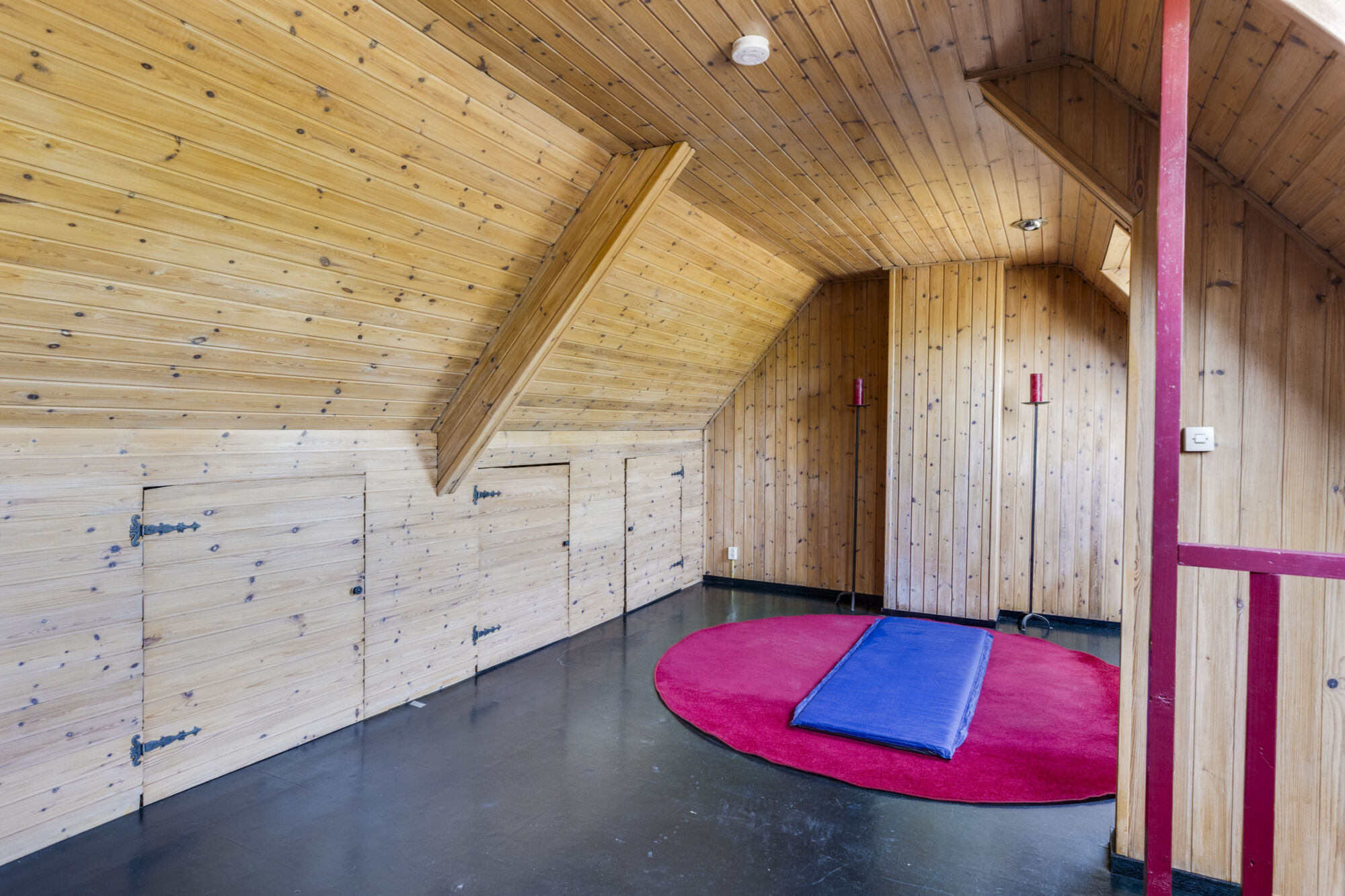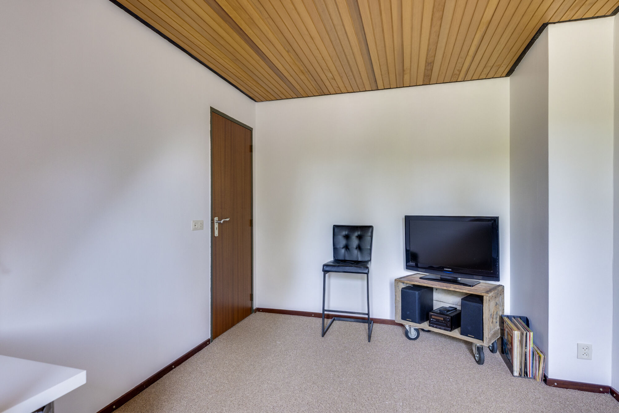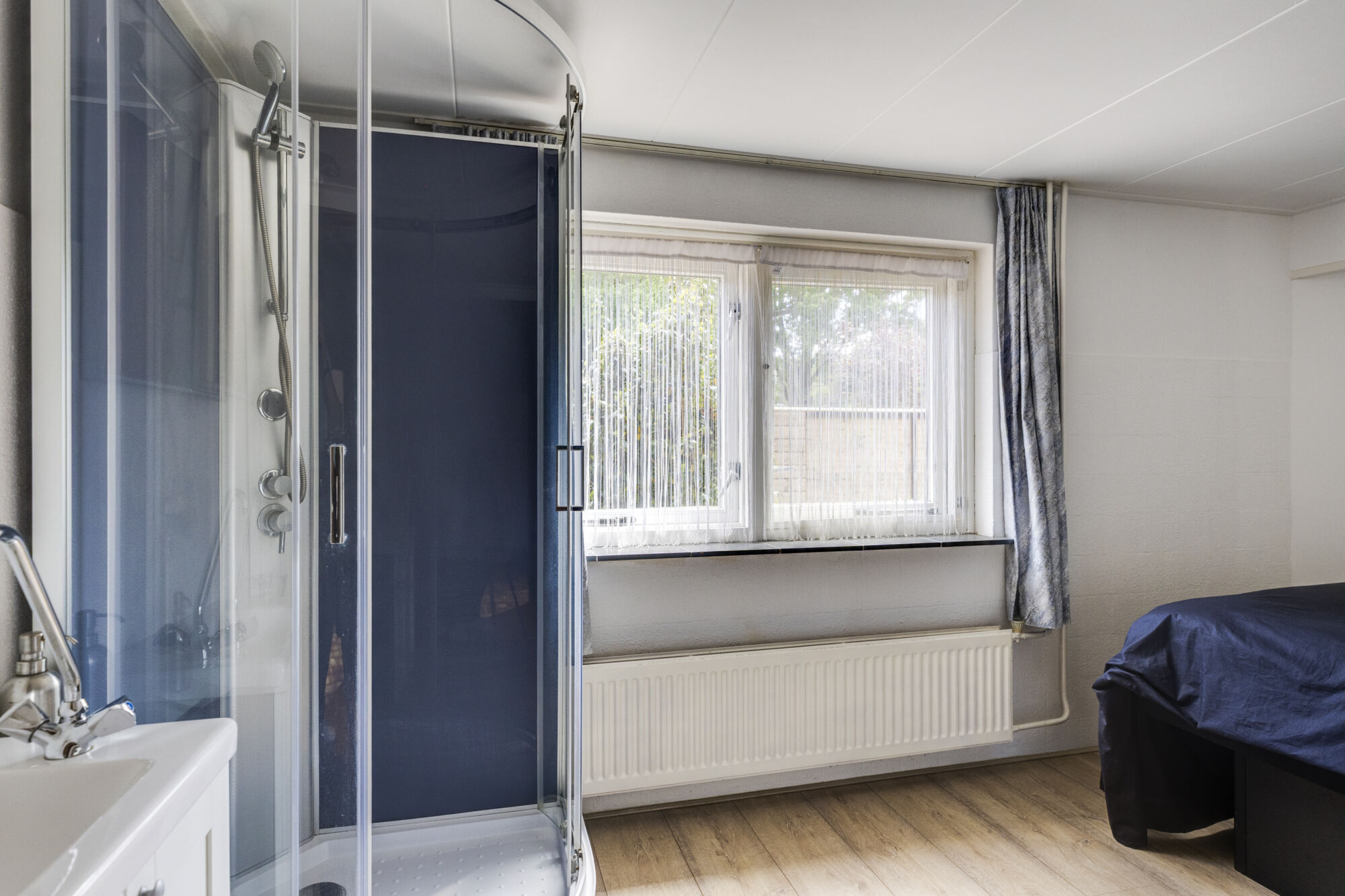 Vanuit de woonkamer is de trap naar boven en de opkamer met een wastafel en een douche. Heel fijn als je je slaapkamer op de benedenverdieping wil hebben of heel geschikt als logeerkamer. Het plafond is gemaakt van isolerende gipsplaten. Een raam geeft uitzicht op de zijtuin.