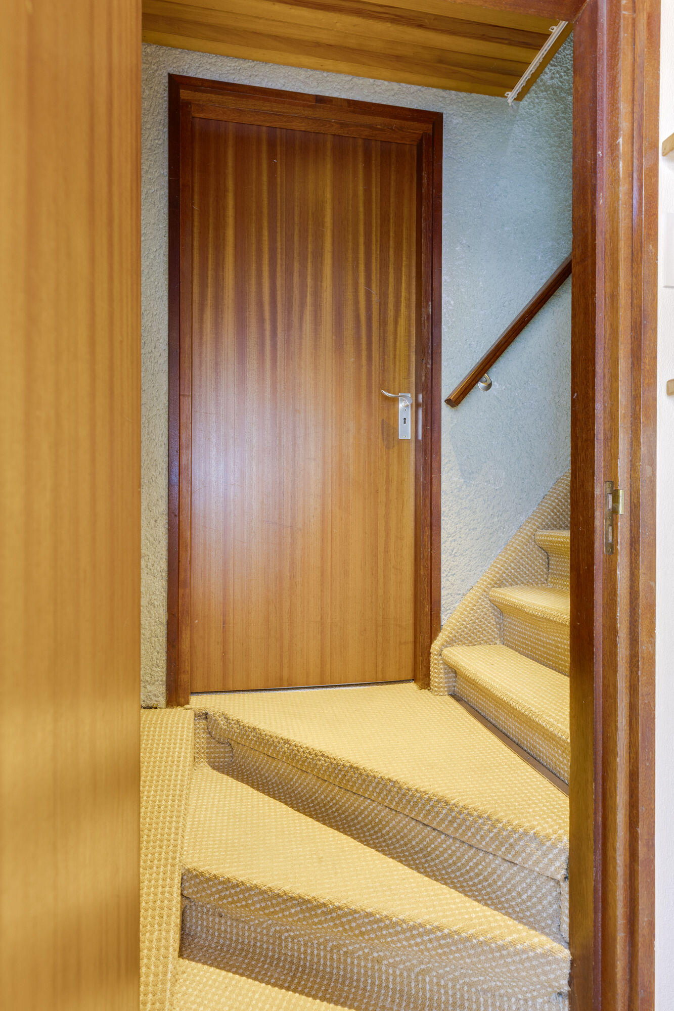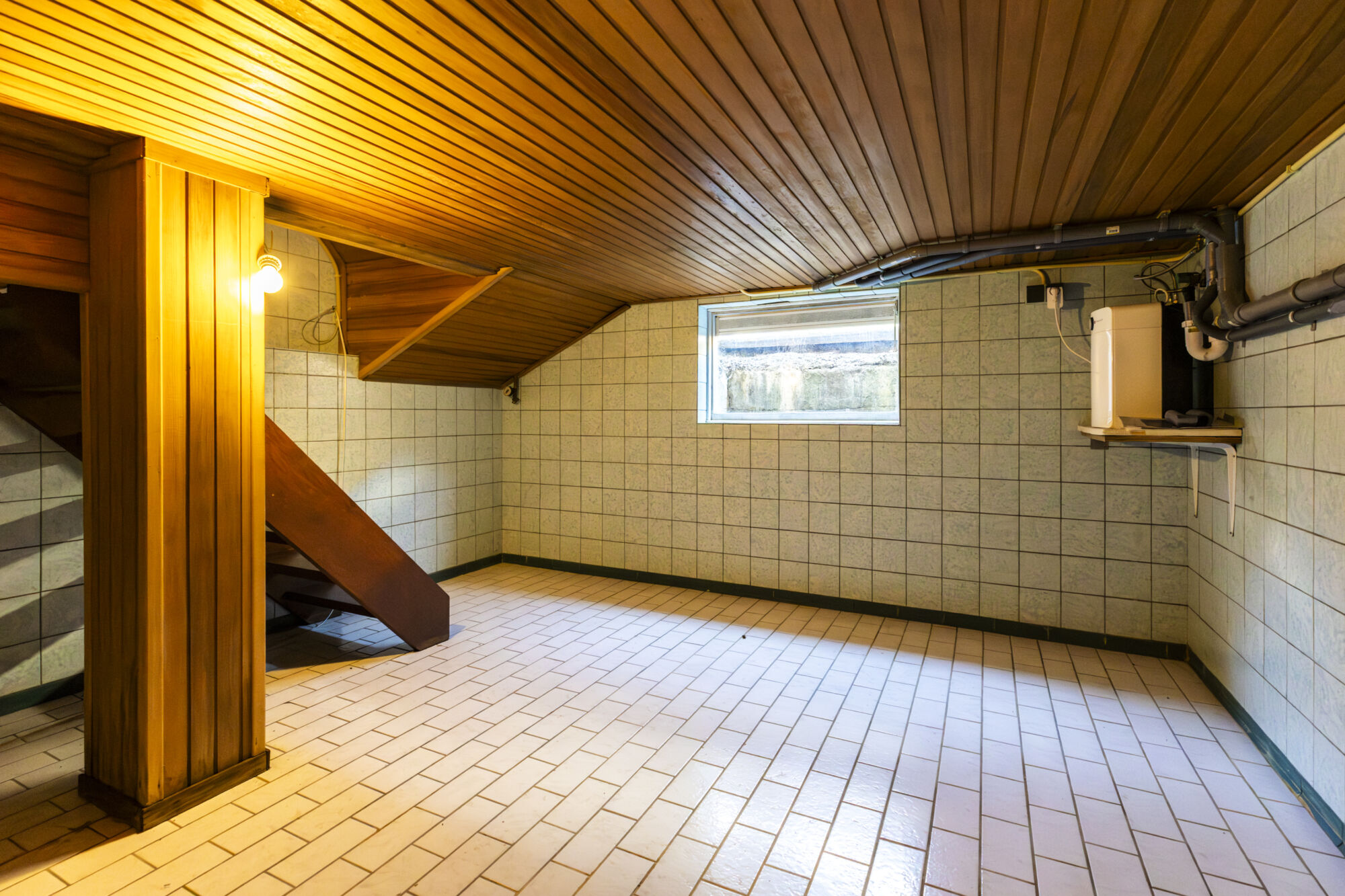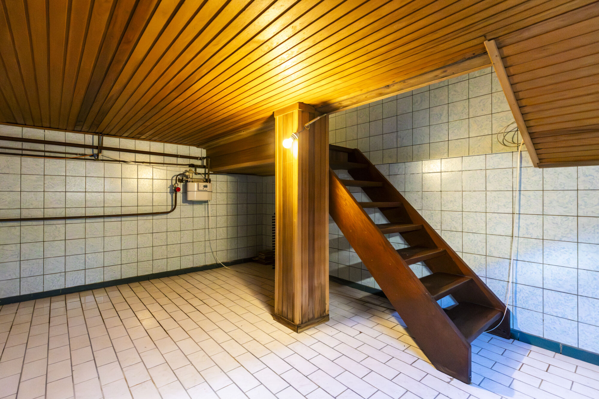 Tussen de woonkamer en keuken is de deur naar de grote, volledig betegelde kelder. Een raam zorgt voor daglichttoetreding. In de kelder is tevens de elektrische boiler.