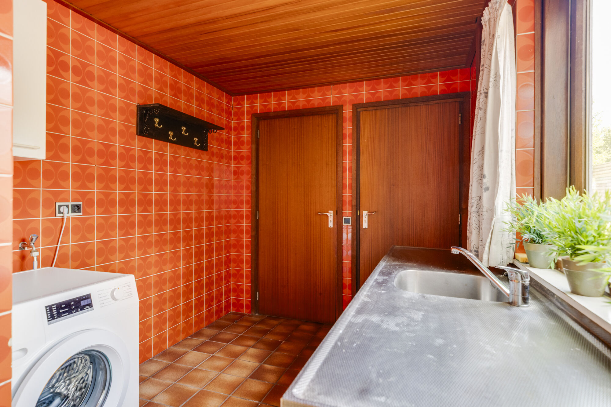 Dit brengt je terug naar de seventies! Aansluitend op de woonkamer is de bijkeuken met een ingebouwde kast, aansluitingen voor de wasmachine en droger. Heel handig is de keukenblok met bergruimte en warm/koud water. Vanuit de bijkeuken heb je toegang tot de tuin en aansluitend op de bijkeuken is de stenen schuur met een overkapping.