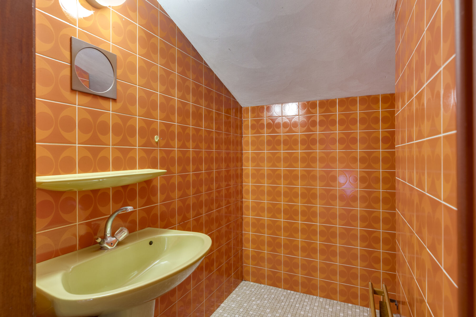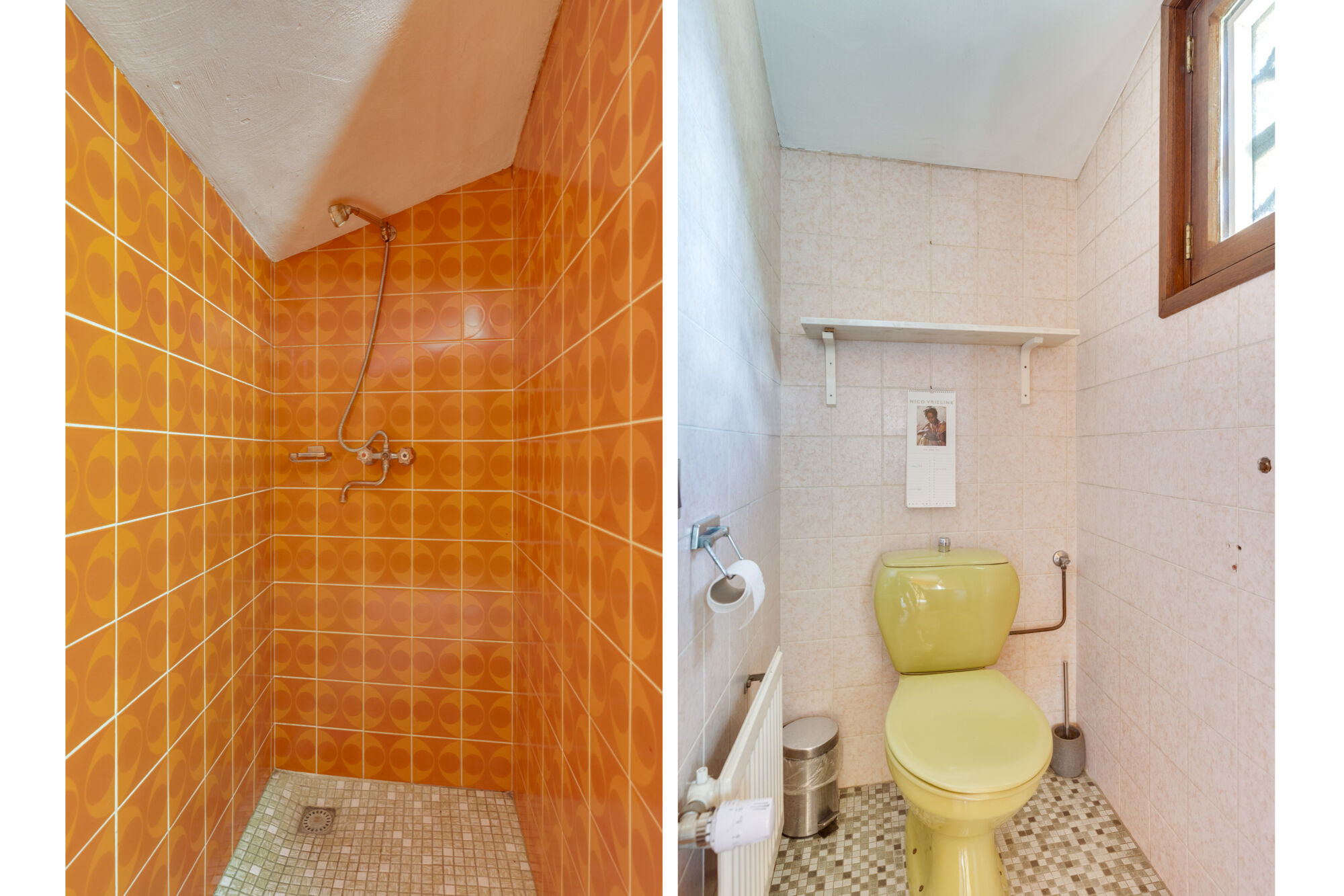 De bijkeuken geeft tevens toegang tot het volledig betegelde toilet en badkamer met een wastafel en een inloopdouche. De toiletruimte heeft een staand toilet. Een raampje zorgt voor natuurlijke ventilatie.