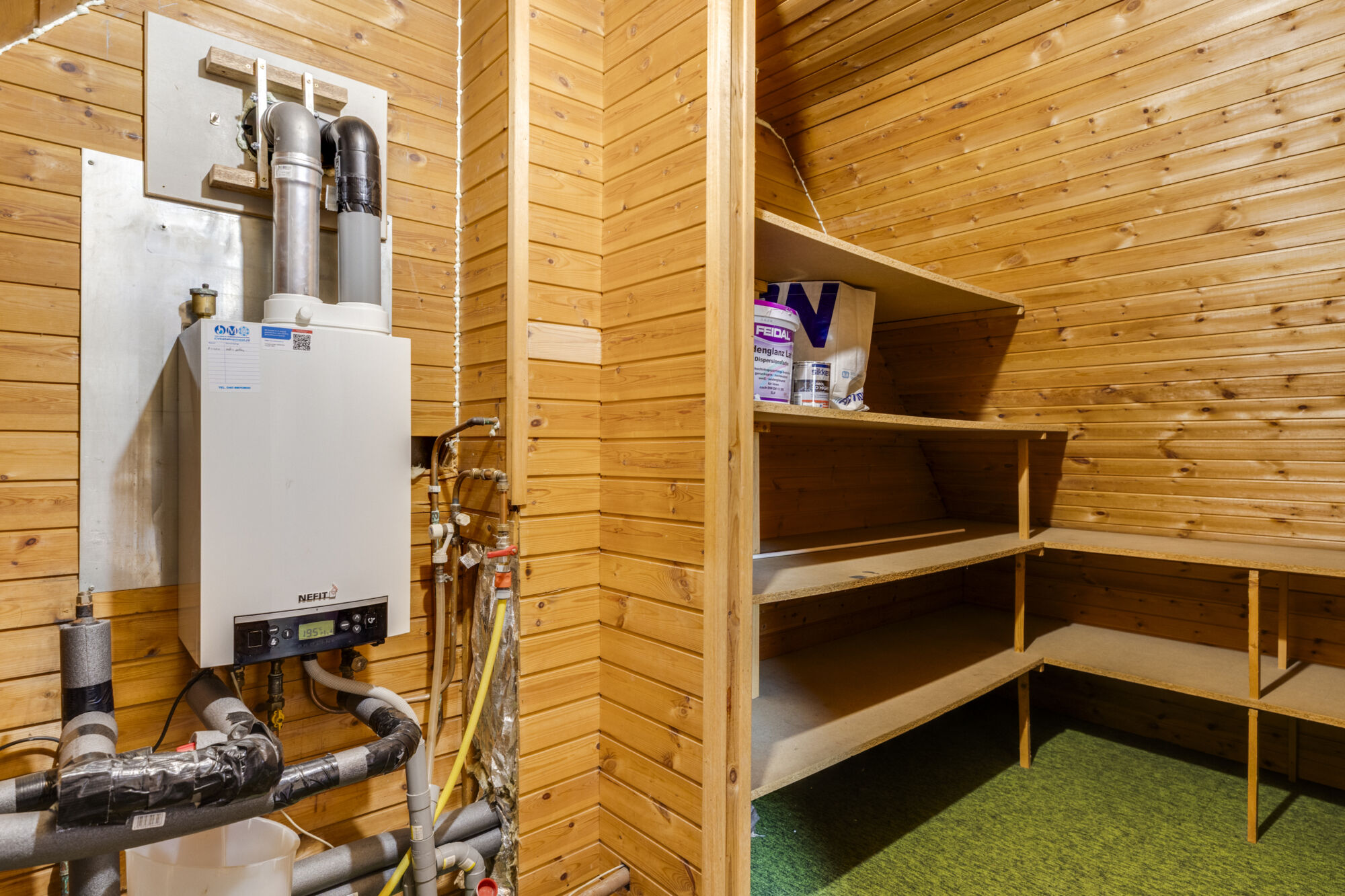 Aansluitend is de berging/stookruimte met de cv en veel bergruimte. Het is mogelijk om de cv naar beneden te verplaatsen en op deze verdieping nóg een extra (slaap- of bad)kamer te maken.