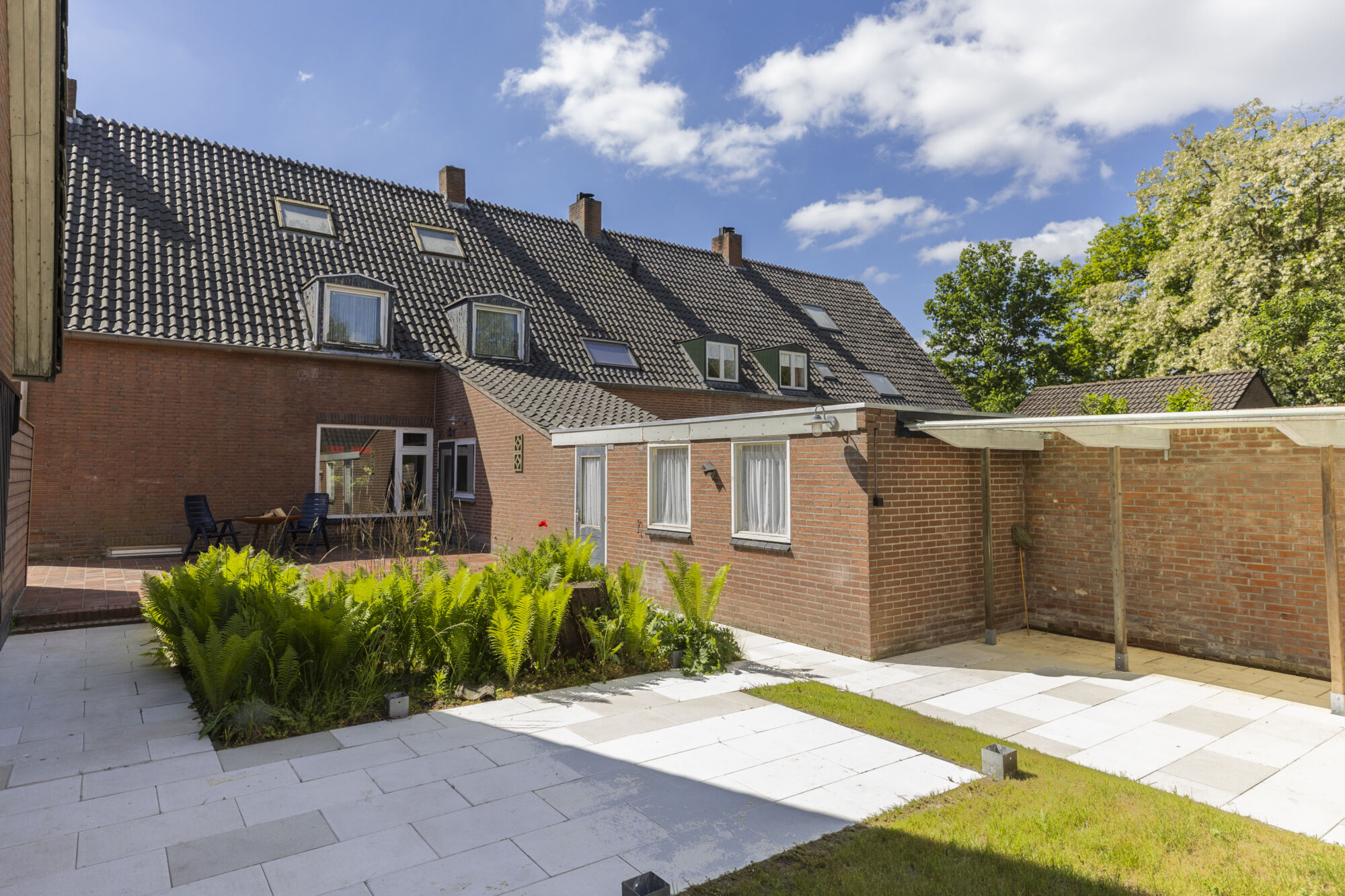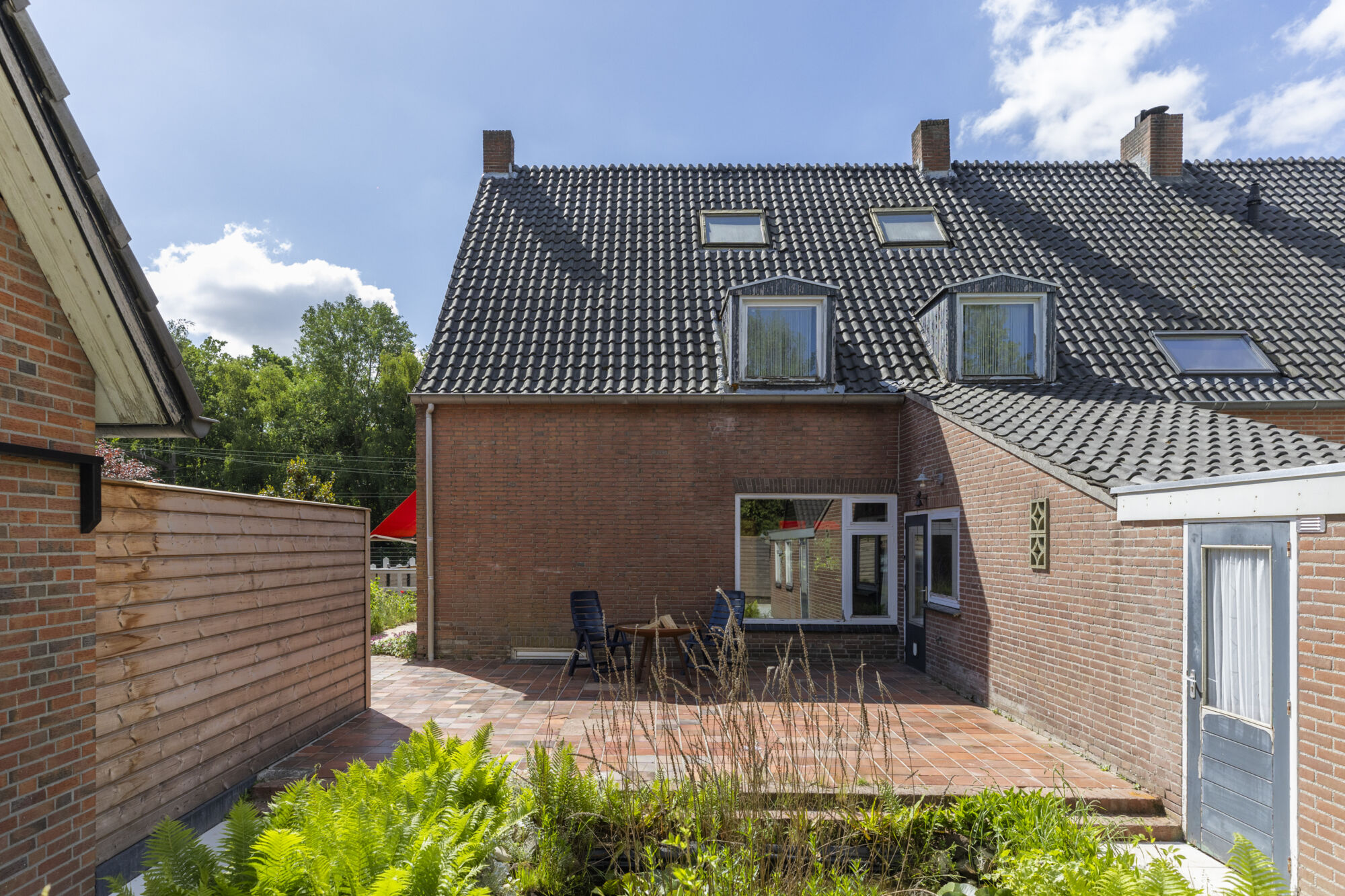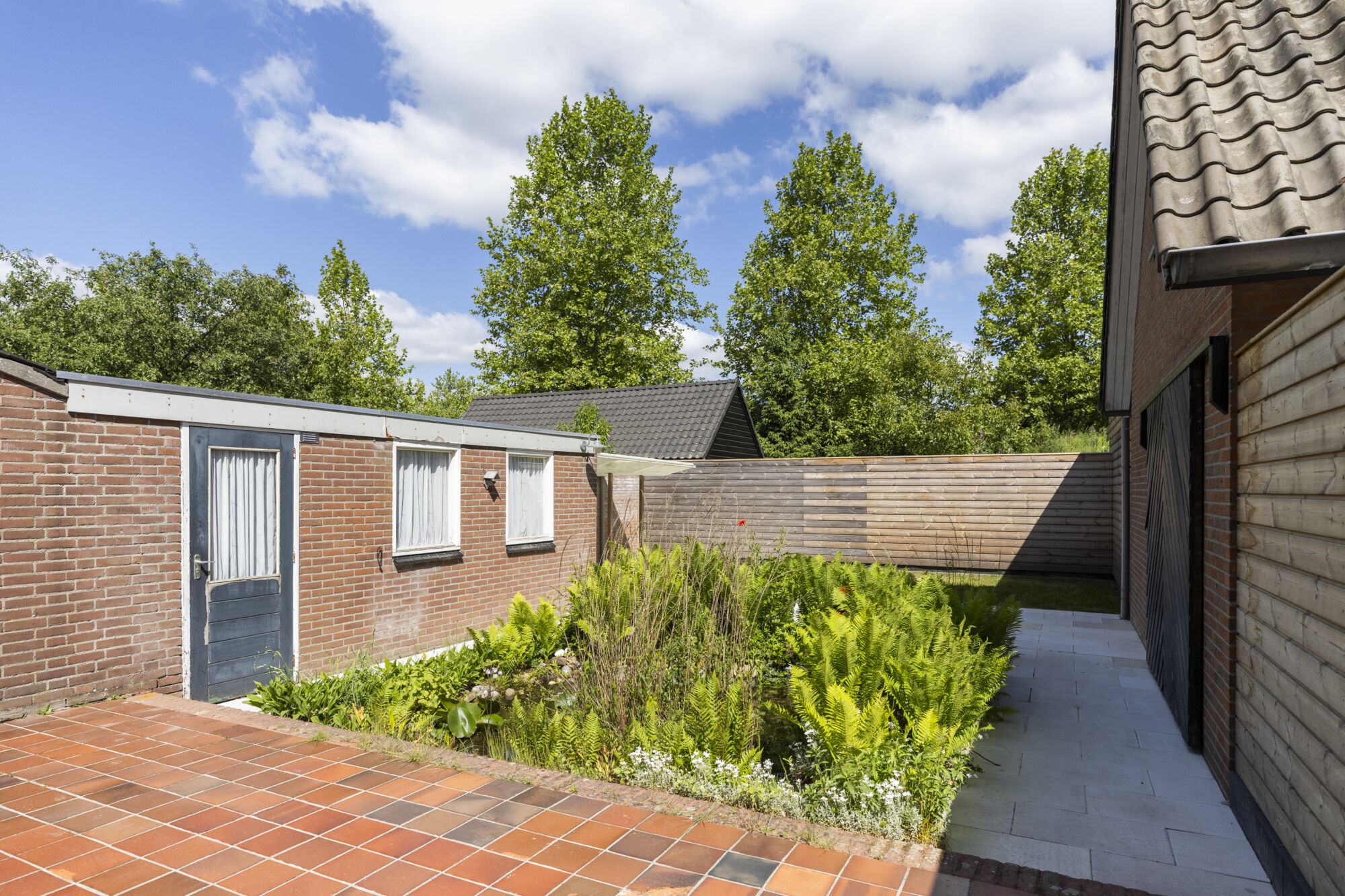 Aansluitend op het huis is een groot terras van tegels in cement op een gewapende betonvloer. De tuin ligt op het noordwesten en is groot genoeg zodat je altijd wel ergens zon of schaduw hebt. De tuin biedt veel privacy doordat je geen directe achterburen hebt. Aansluitend op de berging is de stenen schuur met een overkapping. De schuur is voorzien van elektra zodat je daar fijn kunt klussen of je fiets opladen bijvoorbeeld. Het terras wordt afgewisseld met vaste beplanting. Achter en aan de zijkant wordt de tuin begrensd door een houten schutting. Aan de rechterzijde vormt de gevel van de buren een fraaie combinatie met de houten schutting. De ‘deur’ in de gevel van de buren is geen deur, maar een paneel en heeft dus geen functie. Het raam aan die zijde is geblindeerd zodat je geen inkijk hebt. Volop privacy dus.