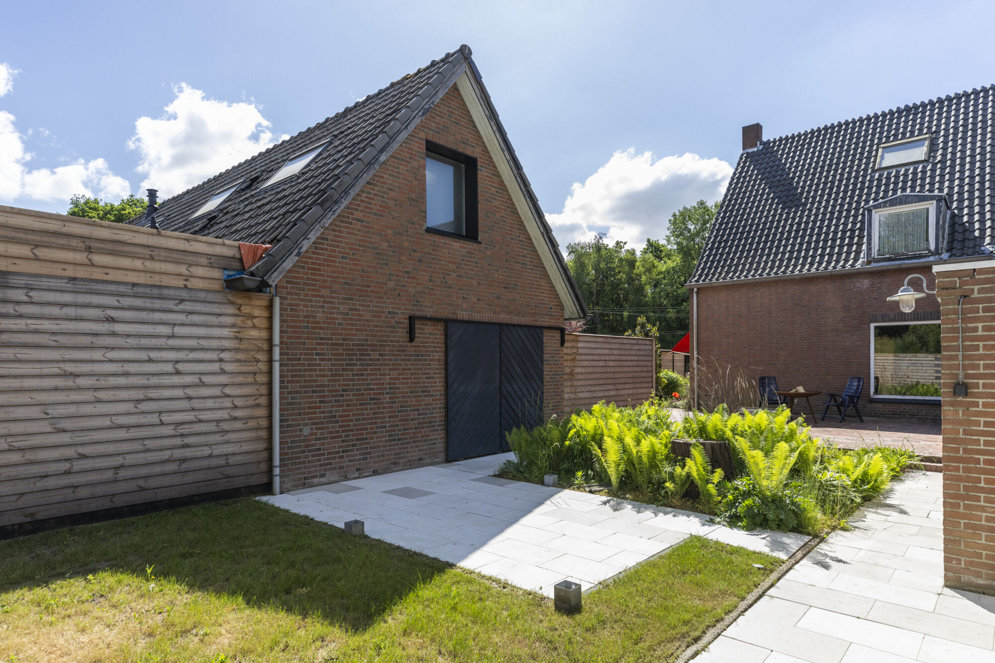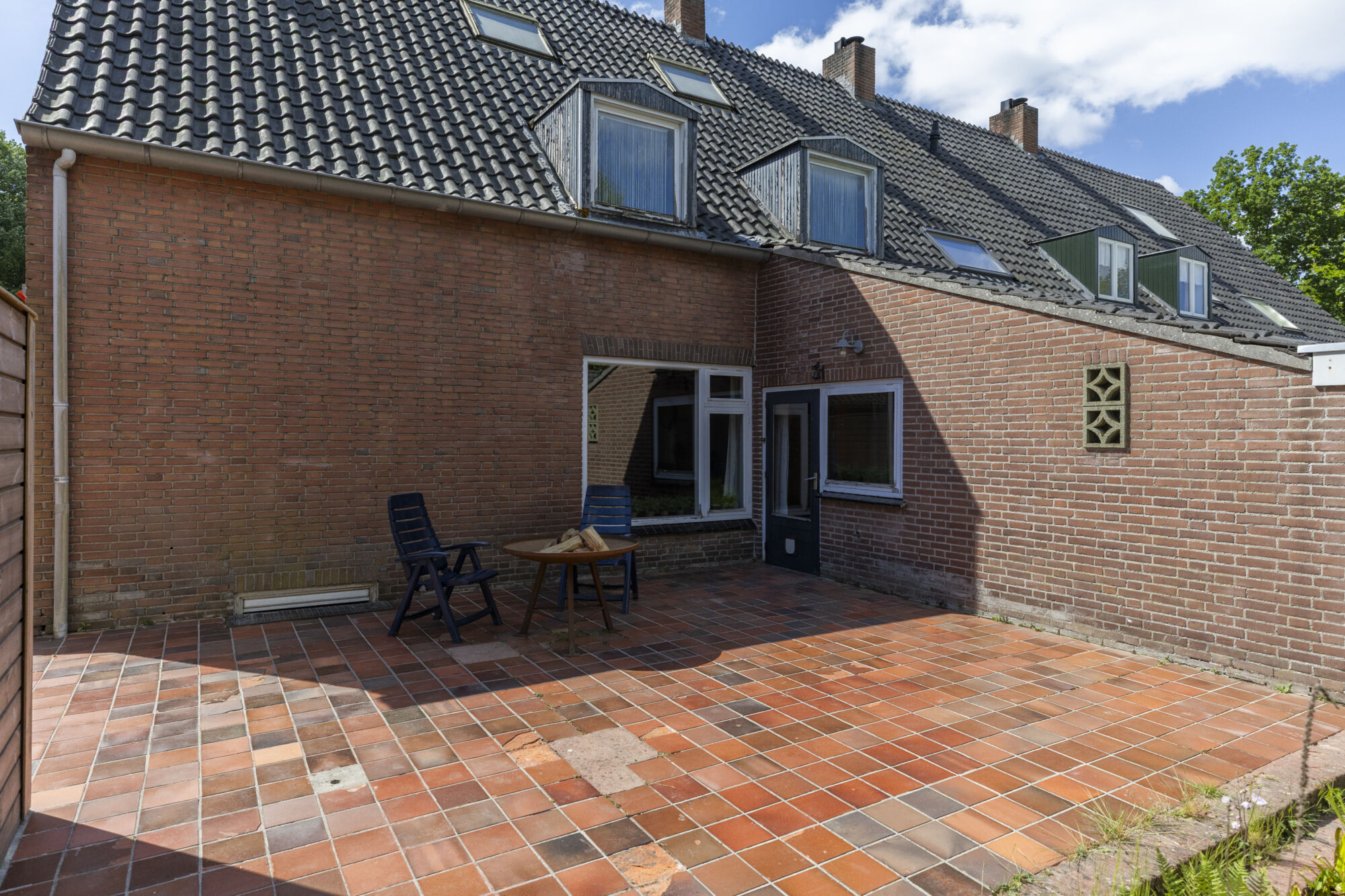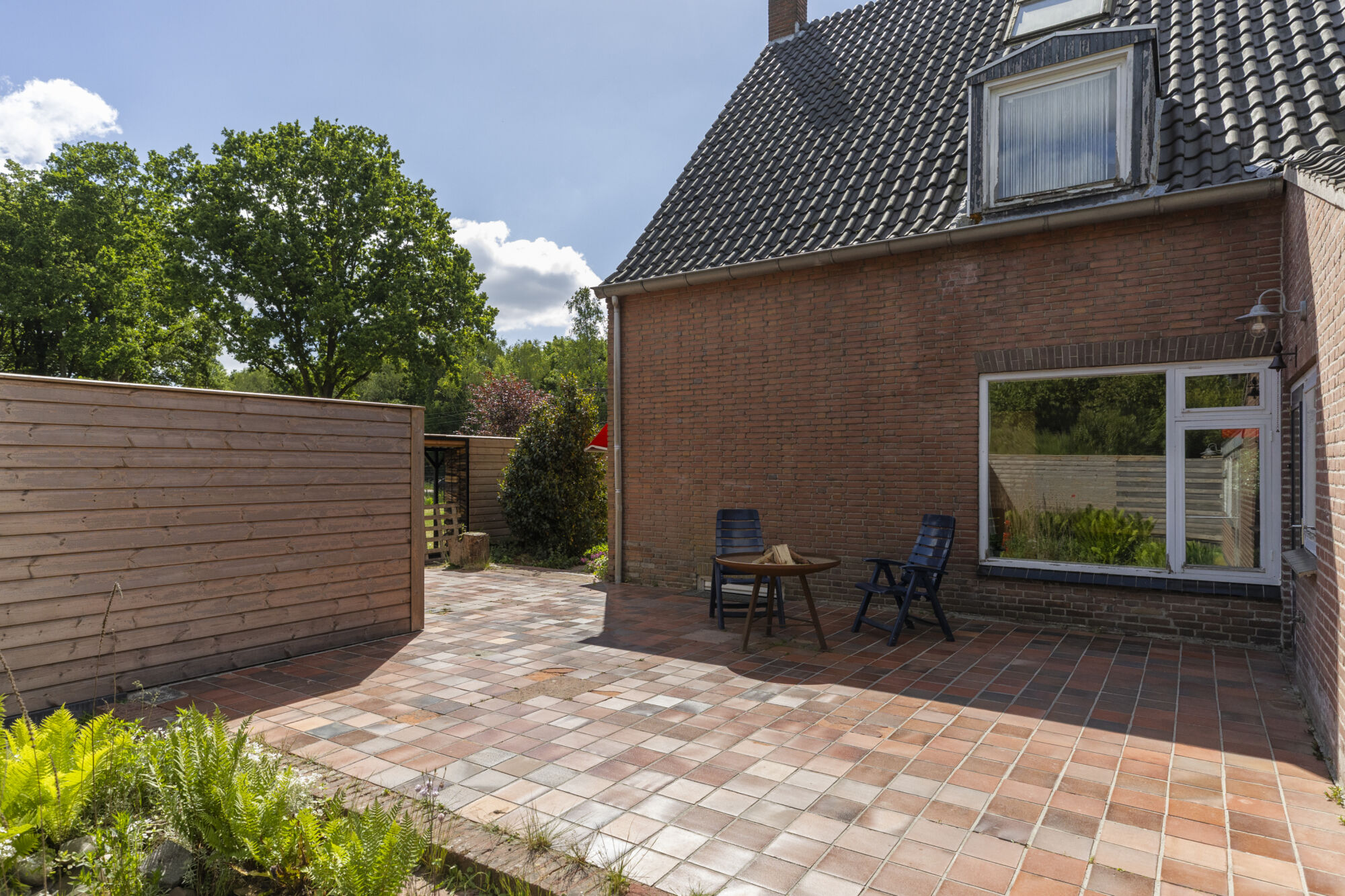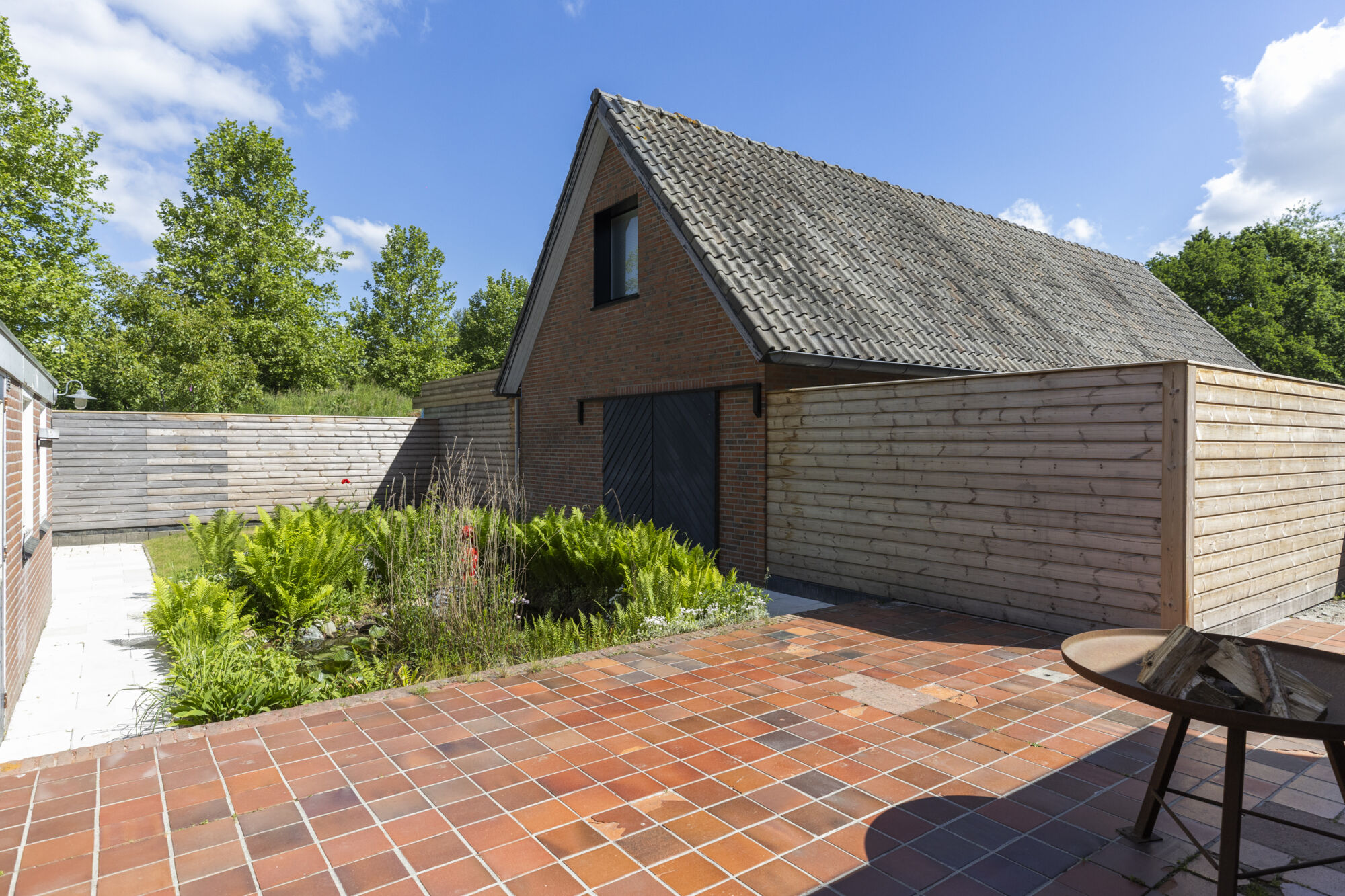 Aansluitend op het huis is een groot terras van tegels in cement op een gewapende betonvloer. De tuin ligt op het noordwesten en is groot genoeg zodat je altijd wel ergens zon of schaduw hebt. De tuin biedt veel privacy doordat je geen directe achterburen hebt. Aansluitend op de berging is de stenen schuur met een overkapping. De schuur is voorzien van elektra zodat je daar fijn kunt klussen of je fiets opladen bijvoorbeeld. Het terras wordt afgewisseld met vaste beplanting. Achter en aan de zijkant wordt de tuin begrensd door een houten schutting. Aan de rechterzijde vormt de gevel van de buren een fraaie combinatie met de houten schutting. De ‘deur’ in de gevel van de buren is geen deur, maar een paneel en heeft dus geen functie. Het raam aan die zijde is geblindeerd zodat je geen inkijk hebt. Volop privacy dus.