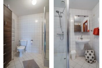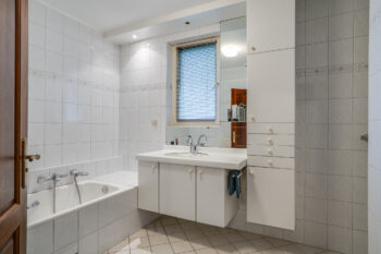 Via het portaal is de eerste badkamer en de separate toiletruimte bereikbaar. De badkamer is voorzien van een ligbad, wastafelmeubel, inloopdouche en raam. De toiletruimte is deels voorzien van tegel- en stucwerk en beschikt verder over een wandcloset en fonteintje.