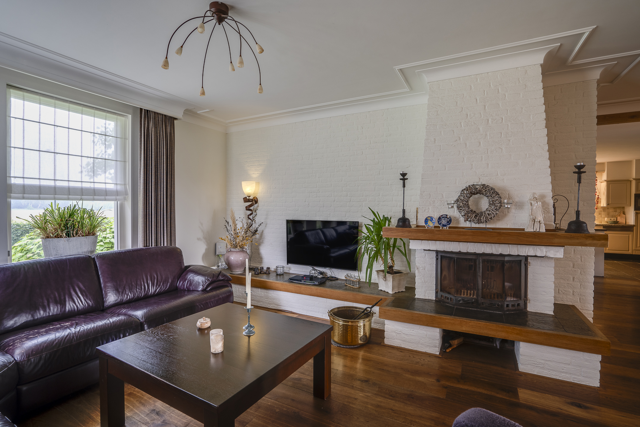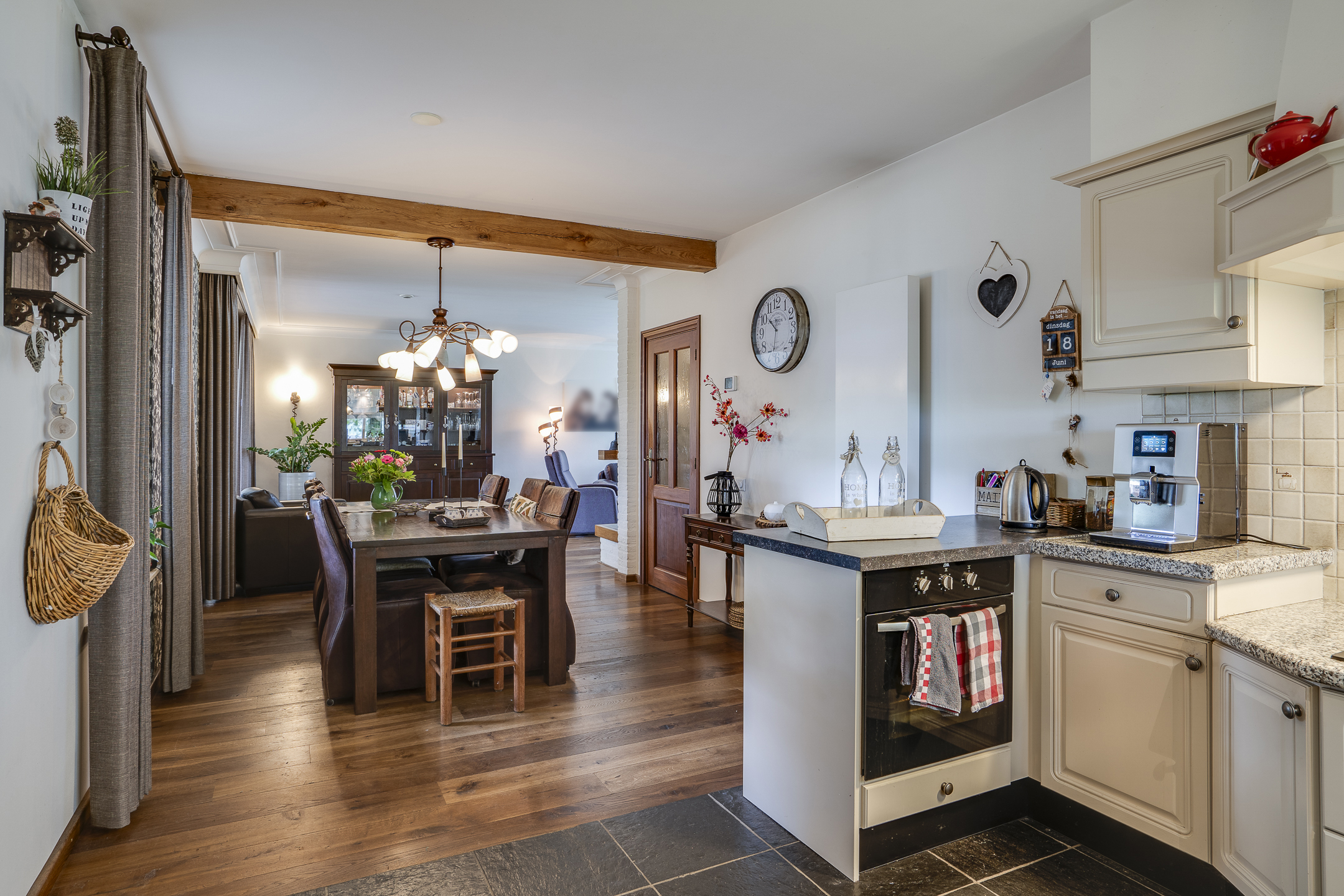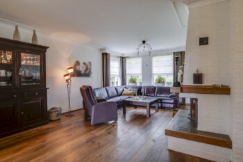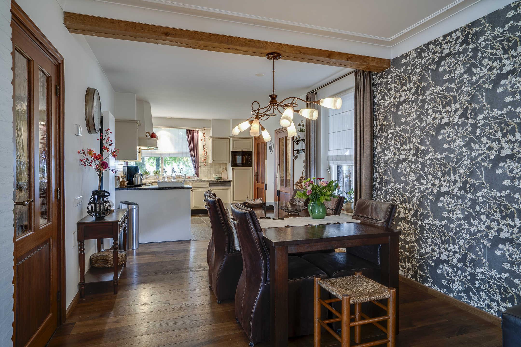 Vanuit de entree bereiken we de prachtige living. Deze living beschikt over een zithoek aan de voorzijde van de woning waar tevens een sfeervolle schouw aanwezig is. Deze zithoek biedt uitzicht over de weg waaraan de woning gelegen is. Tussen de zithoek en de open keuken bevindt zich de dinerruimte. Deze is voorzien van een fraaie houten (draag)balk waarin de elektra voor verlichting verwerkt is!