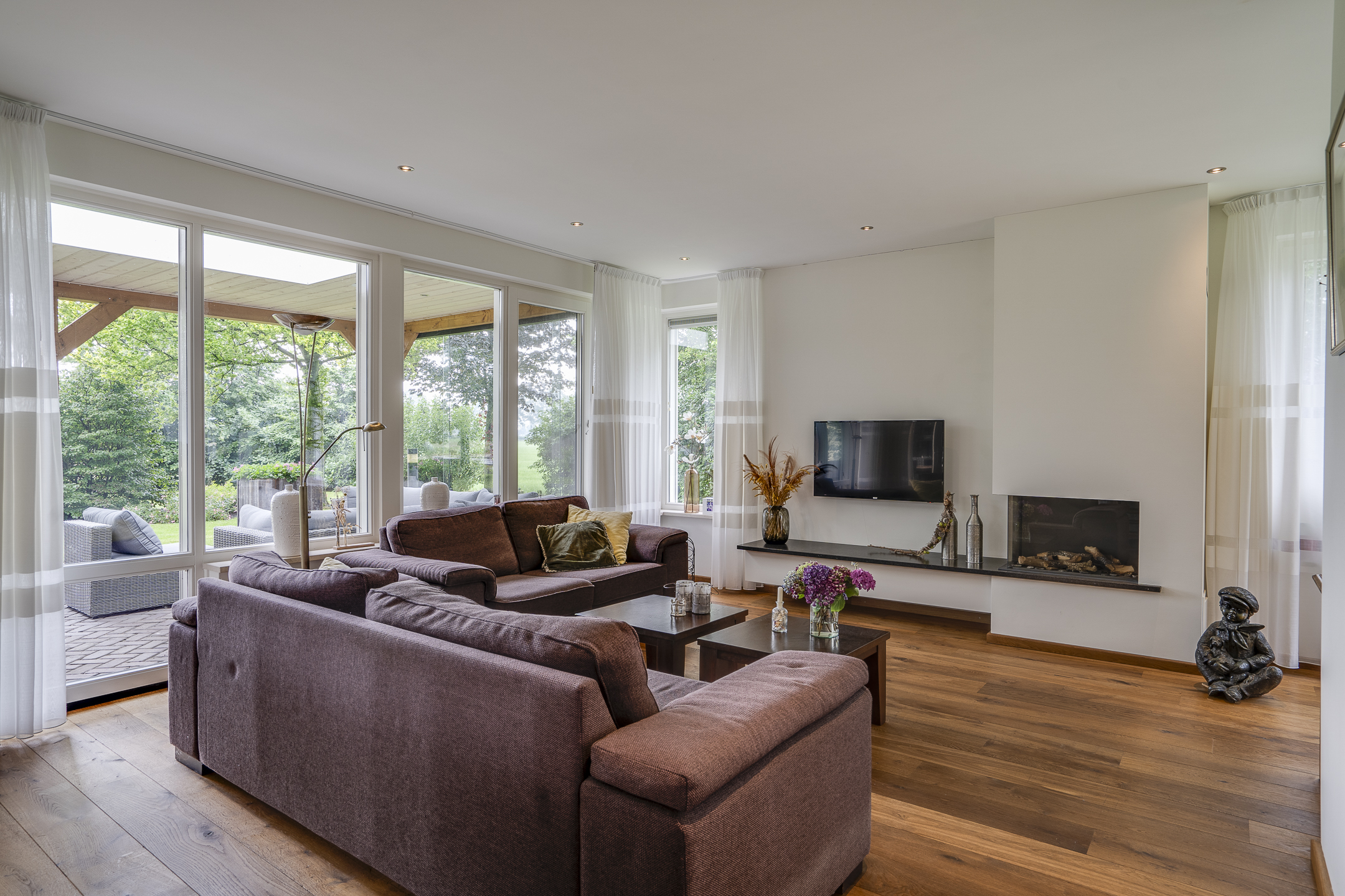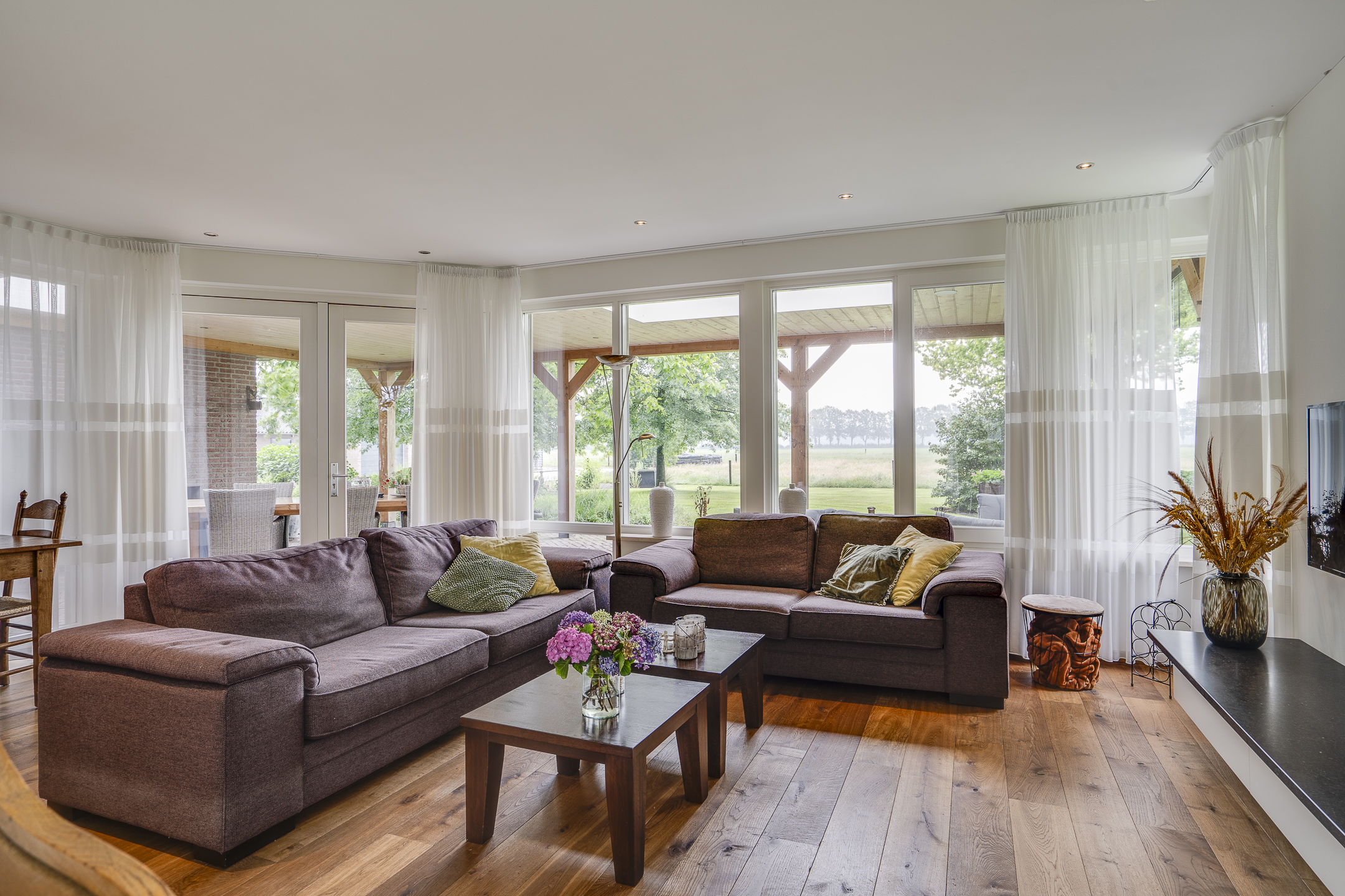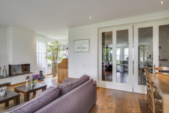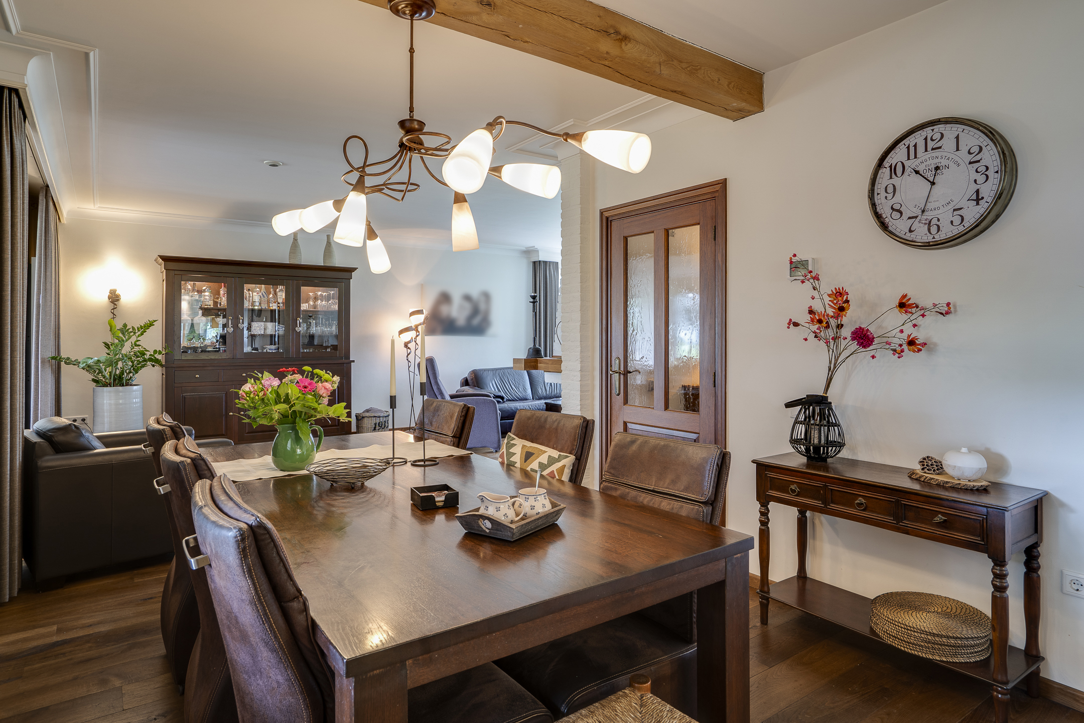 Vanuit de entree bereiken we de prachtige living. Deze living beschikt over een zithoek aan de voorzijde van de woning waar tevens een sfeervolle schouw aanwezig is. Deze zithoek biedt uitzicht over de weg waaraan de woning gelegen is. Tussen de zithoek en de open keuken bevindt zich de dinerruimte. Deze is voorzien van een fraaie houten (draag)balk waarin de elektra voor verlichting verwerkt is!