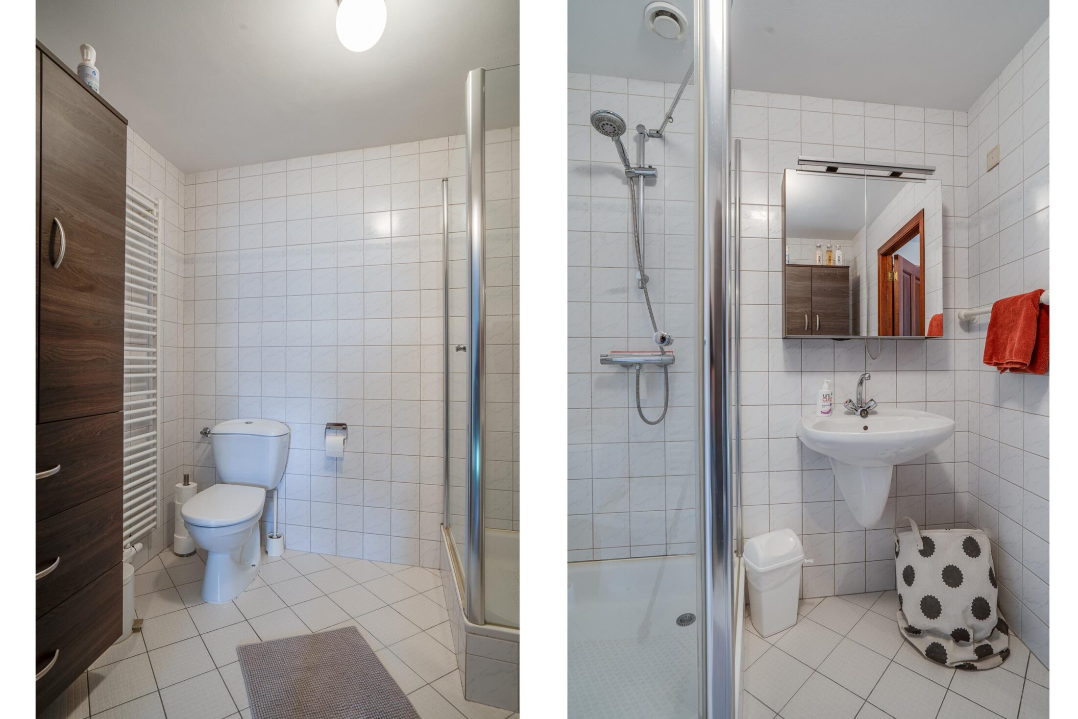 Tussen de slaapkamers bevindt zich de badkamer. Deze badkamer is geheel voorzien van tegelwerk en beschikt over een wastafel, een bergkast, toilet en inloopdouche (type cabine).