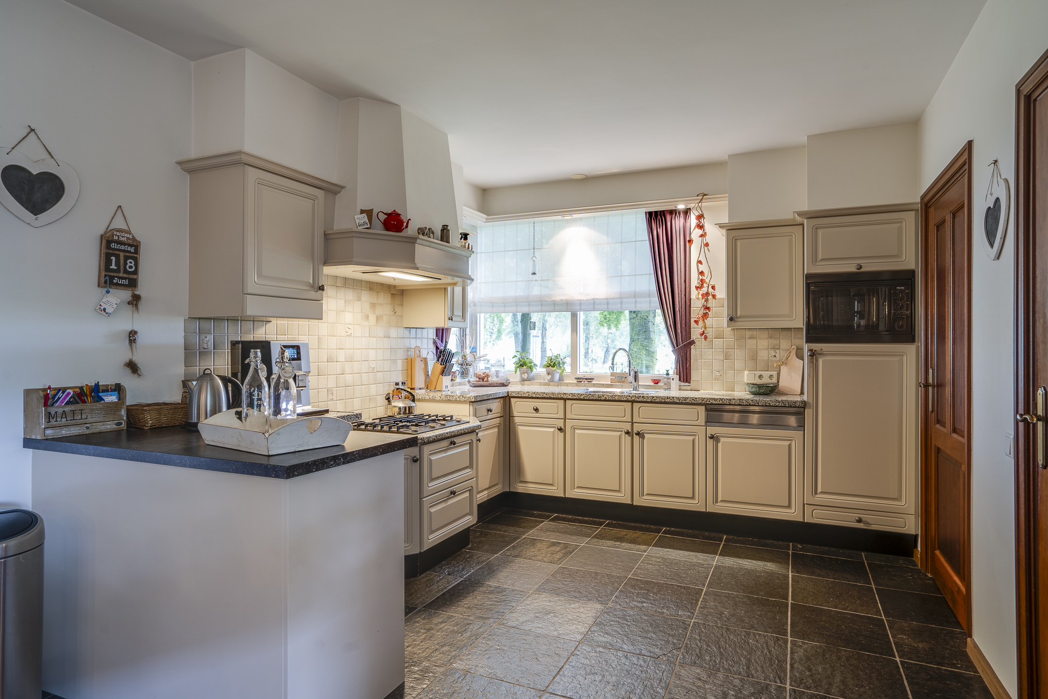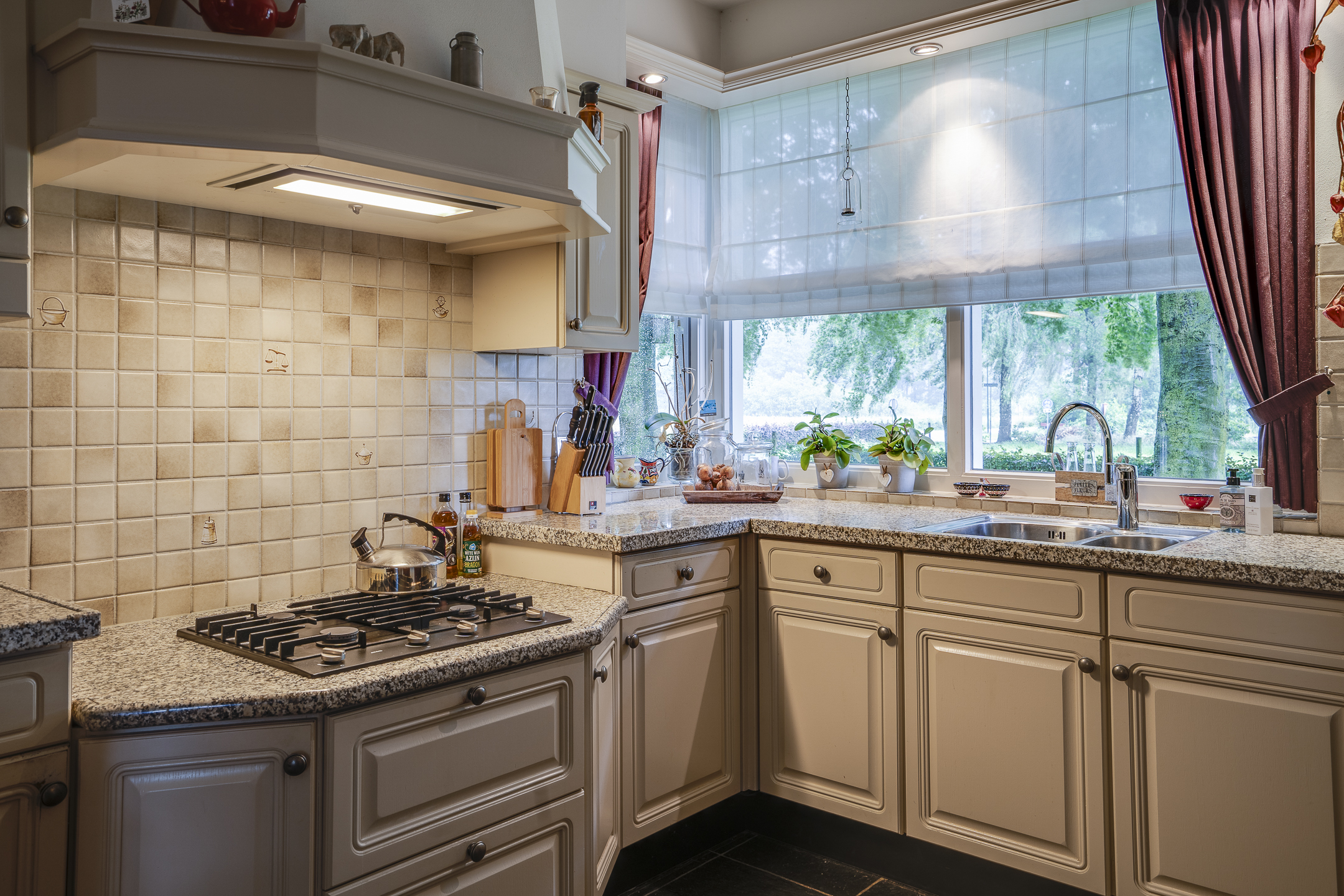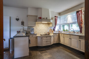 Aan de linkerzijde van de woning bevindt zich deze praktische open keuken. Deze keuken staat in gezellige verbinding met de dinerruimte van de living. Vanwege de aanwezigheid van een hoek in de keuken en de ramen welke hier aanwezig zijn heeft u een prachtig beeld over de geweldige oprijlaan van deze woning en het straatbeeld waaraan de woning gelegen is, rust en ruimte is het gevoel wat overheerst! Verder beschikt deze keuken over veel bergruimte, een inbouw provisiekast en inbouwapparatuur, te weten: