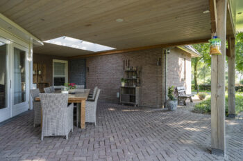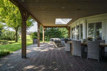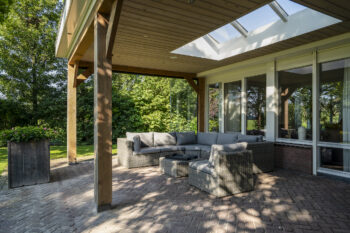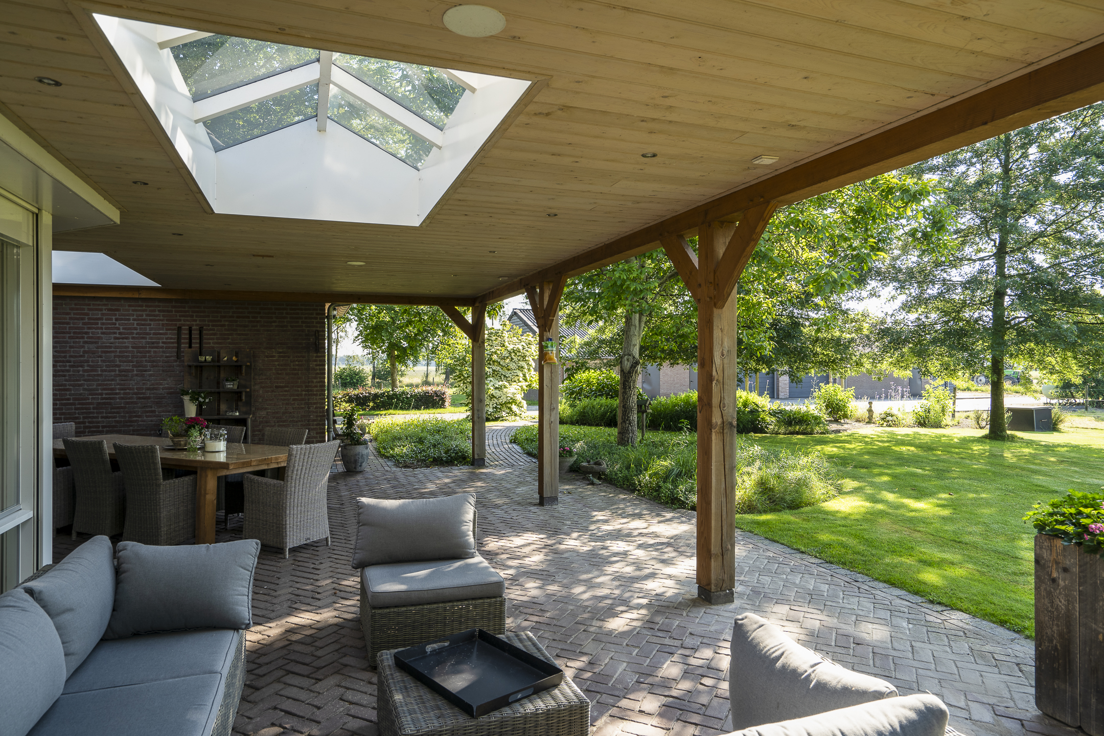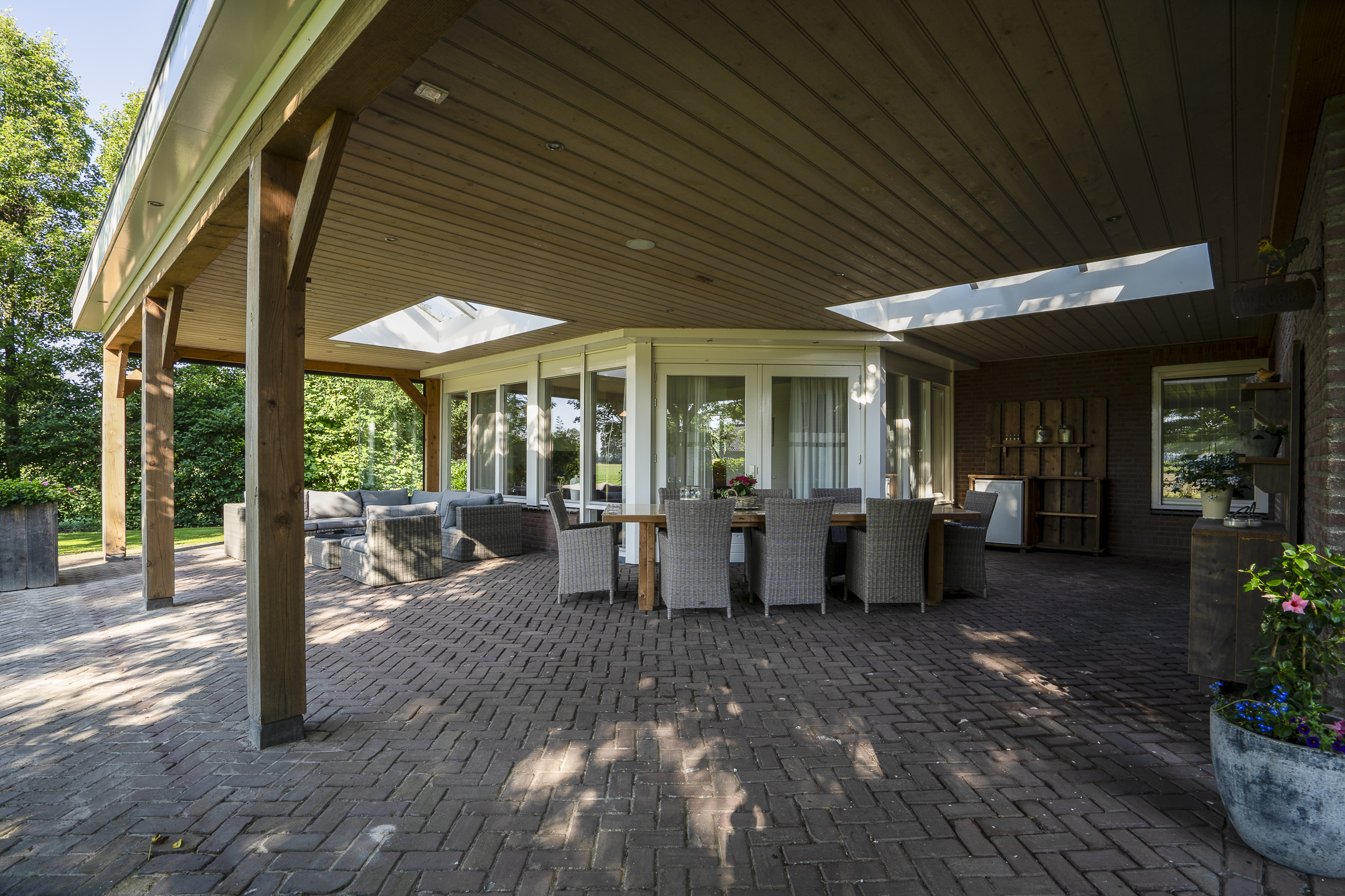 Het overdekt terras is ca. 61 m² (!) groot en is voorzien van daglichttoetreding dankzij de lichtstraat, aan de rechterzijde is dit overdekt terras ook afgesloten. Ook beschikt dit overdekt terras over geluidsspeakers, diverse elektra aansluitingen in het plafond en de mogelijkheid een TV-aansluiting te creëren.