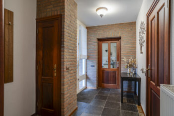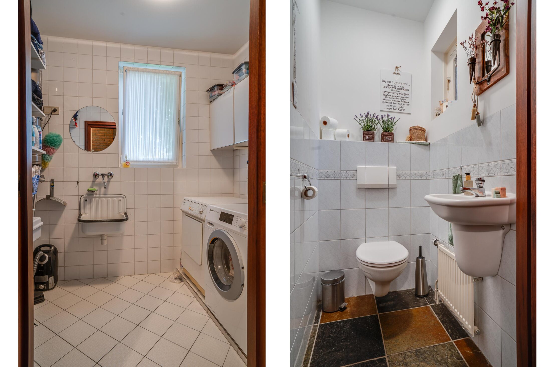 Via de open keuken bereiken we het portaal, aan dit portaal zijn gelegen de meterkast, de wasruimte/provisieruimte welke praktisch in gebruik is dankzij zijn oppervlakte, de badkamer, de separate toiletruimte en de deur richting het fraaie en grote overdekt terras.
