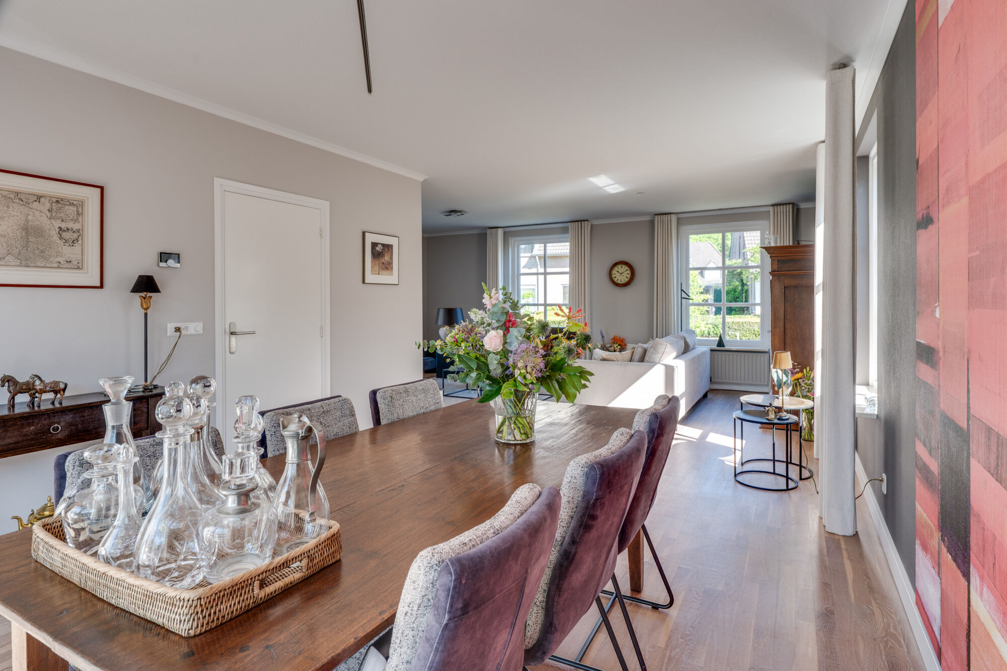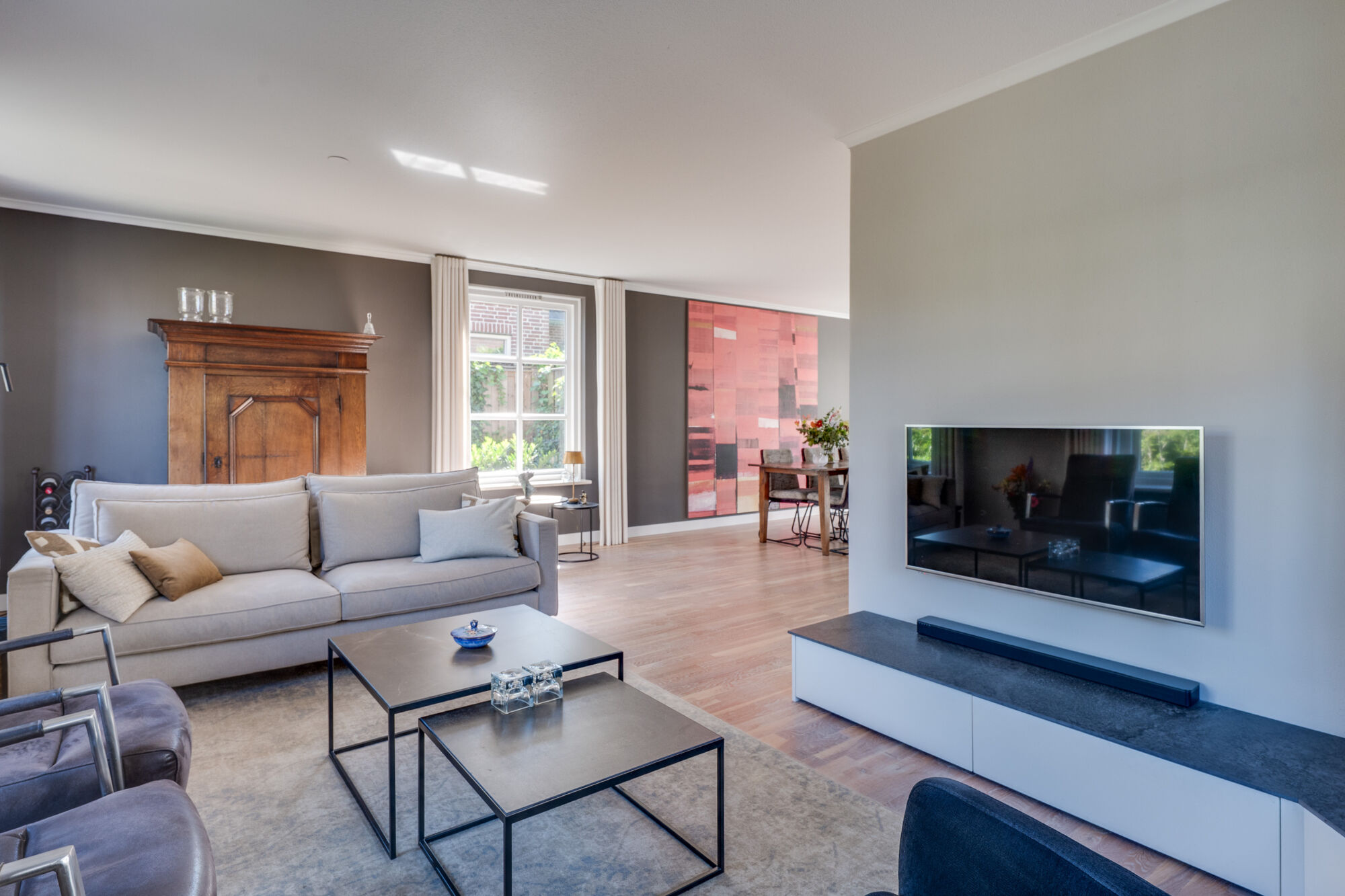 De woonkamer – met prachtige houten vloer – is zowel aan de voor- als achterzijde voorzien van grote raampartijen welke voor veel daglicht zorgen. De zithoek is aan de voorzijde van het huis gesitueerd. De achterzijde van de woonkamer voorziet in een mooie ruimte voor een grote eettafel, welke samen met de semi-open keuken een samenhangend culinair geheel vormen. De achtertuin is vanuit de achterzijde bereikbaar via een riante schuifdeur.