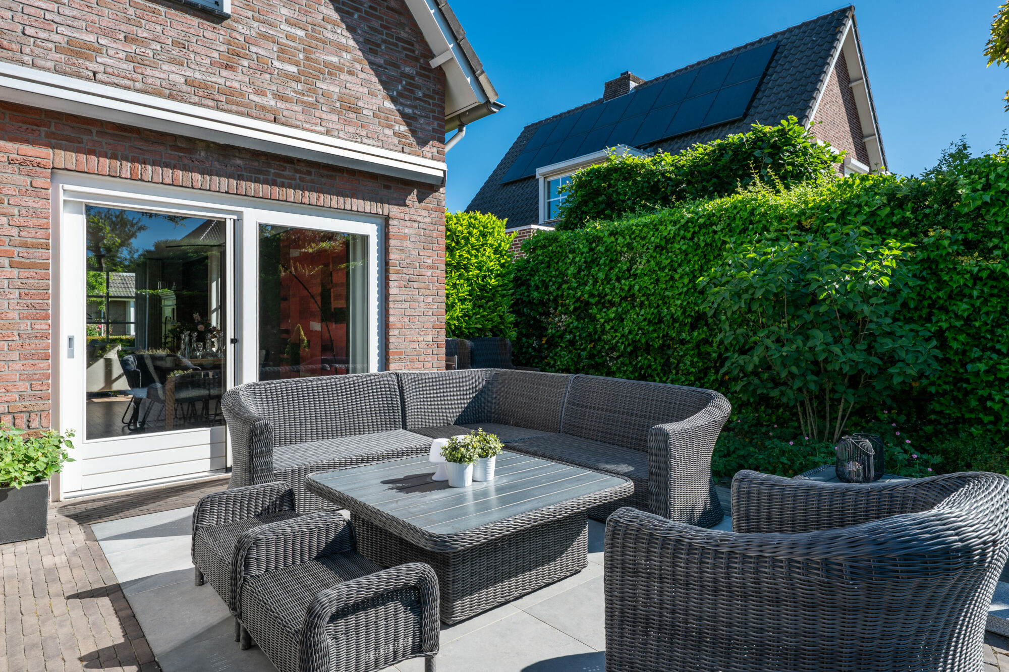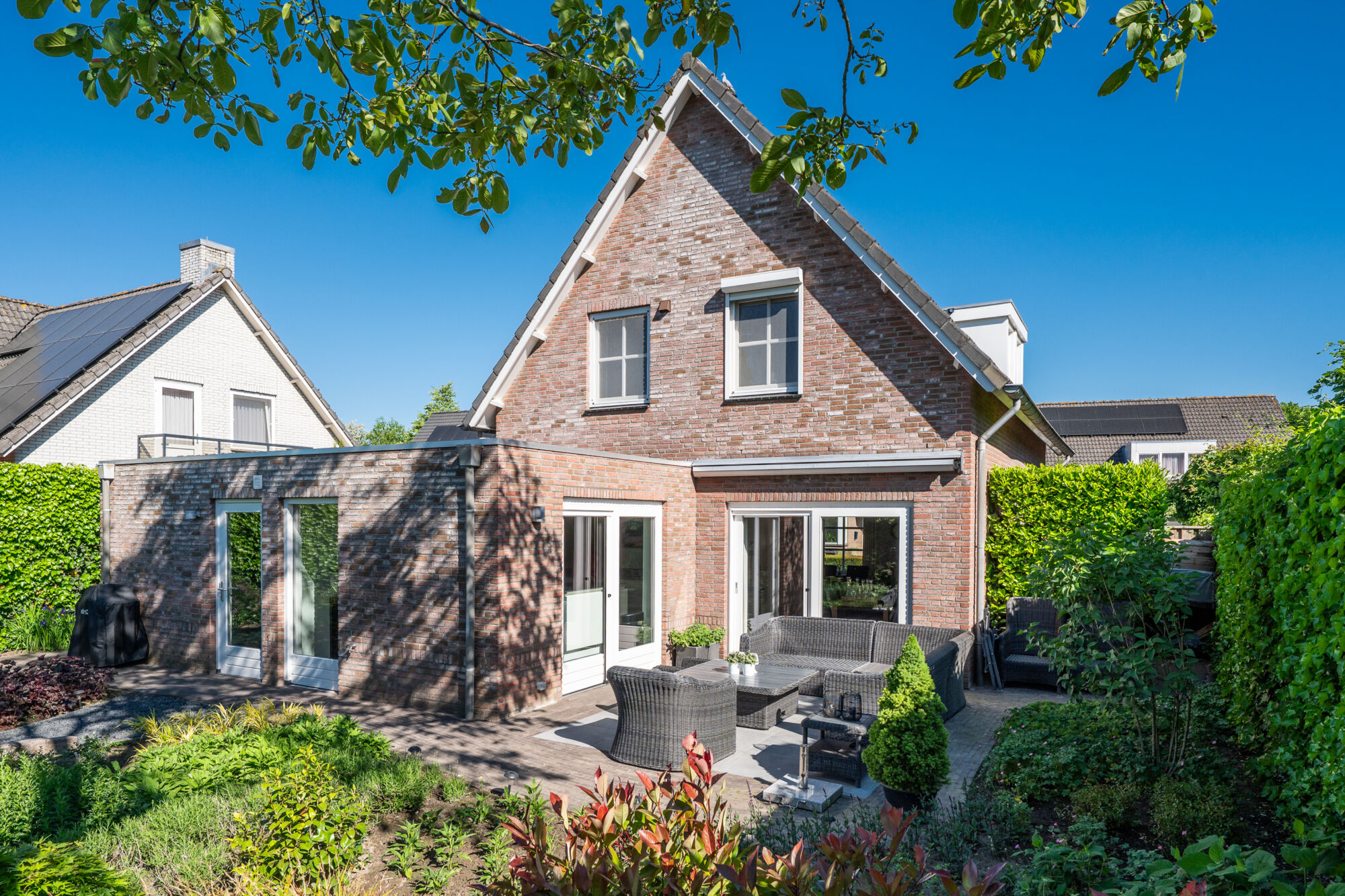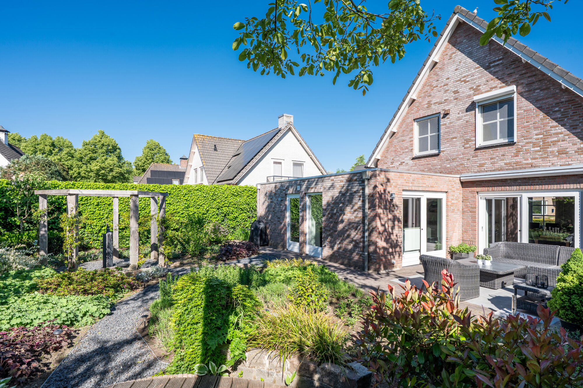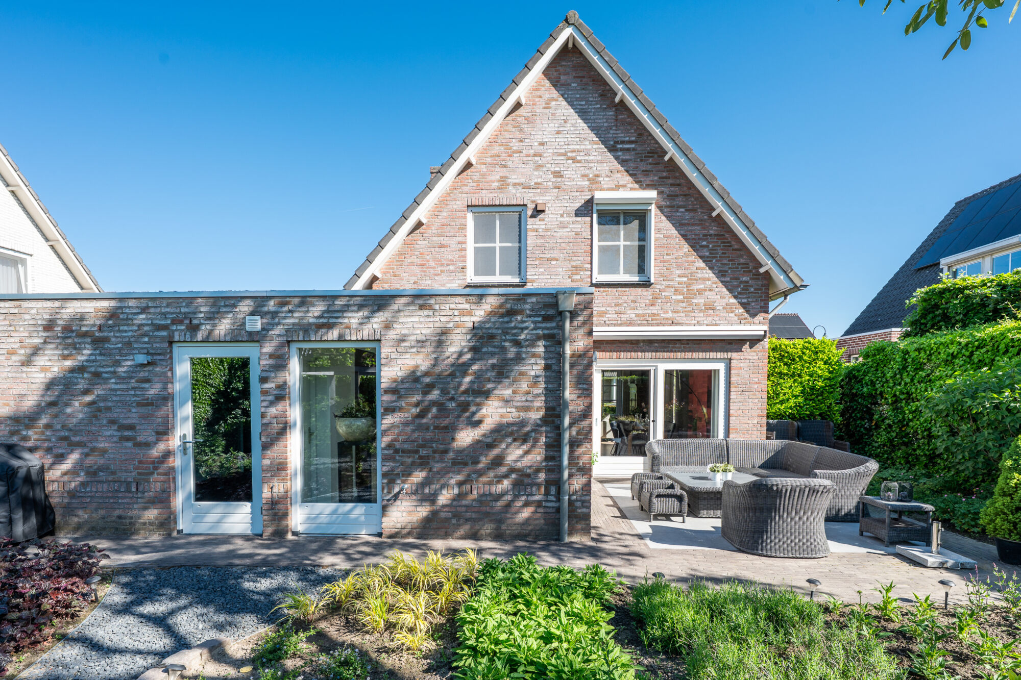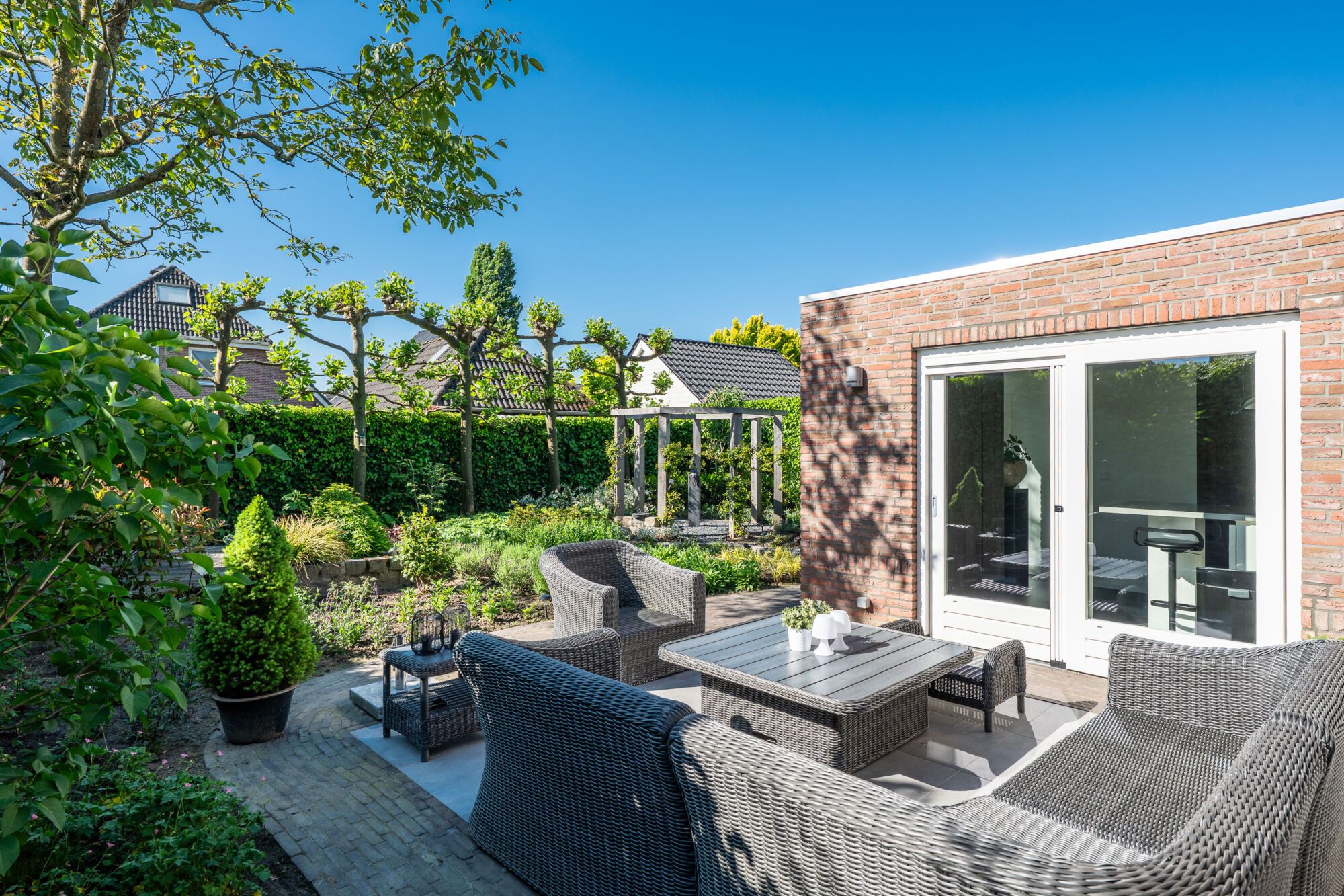 De prachtige, rijkelijk beplante en groene achtertuin geniet vanwege de zuidelijke oriëntatie te allen tijde van de zon. Dat is ook de reden dat er zowel aan de voor- als achterzijde een terras geplaatst is. Zo is het optimaal genieten van uw eigen achtertuin! Niet te vergeten hierbij is de optimale privacy door nagenoeg geen inkijk!