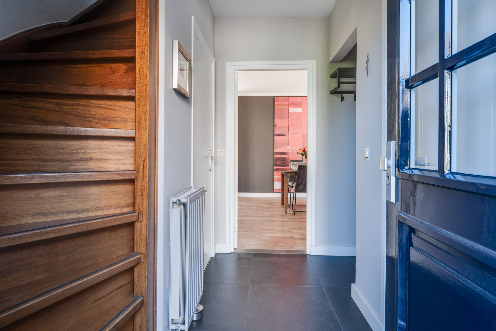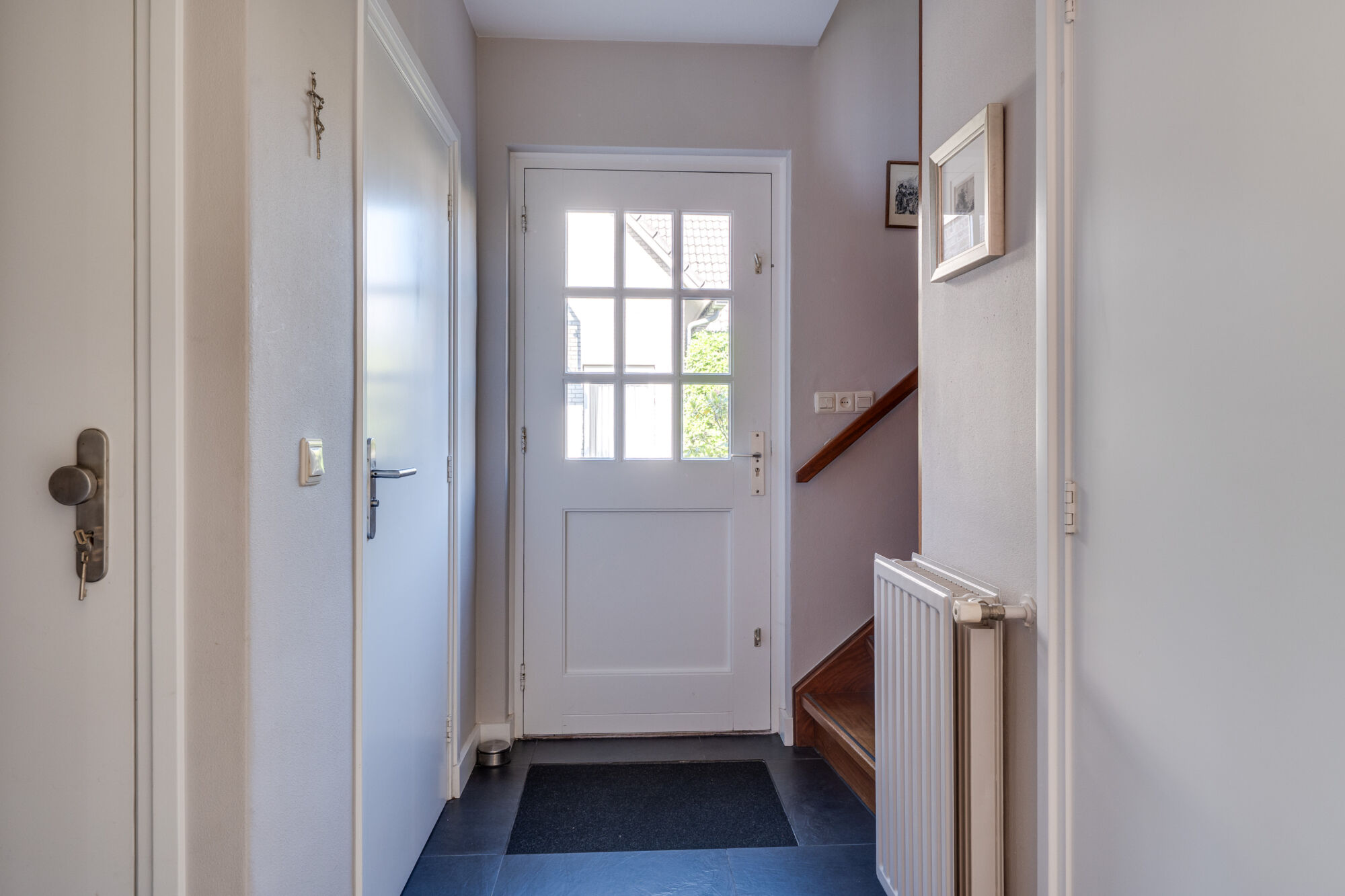 Je komt de woning binnen in een verzorgde hal. Deze hal biedt toegang tot de toiletruimte, kelderkast en woonkamer, en de trapopgang naar de eerste verdieping en de meterkast.