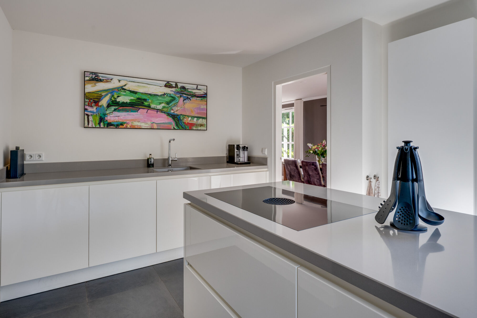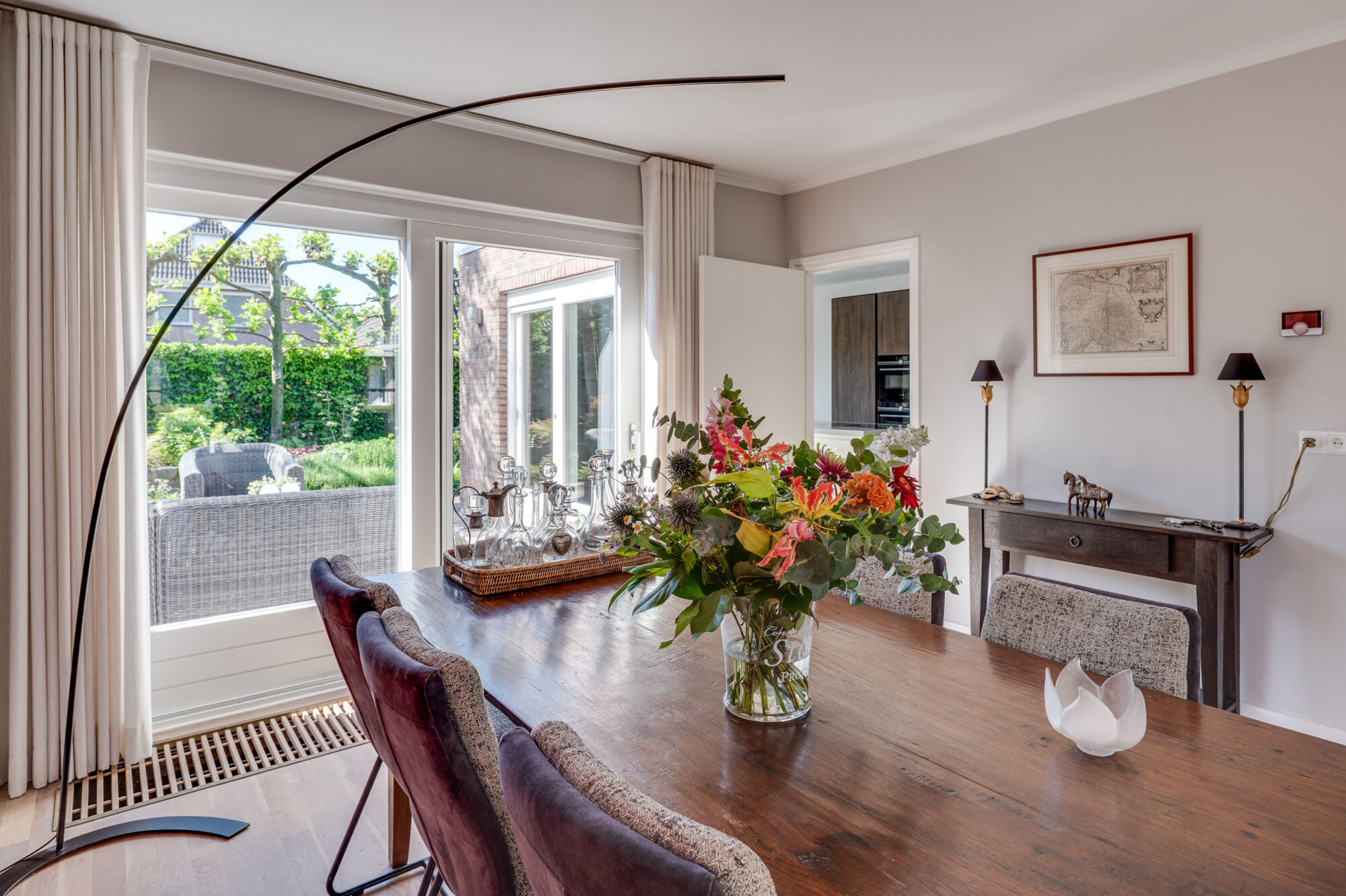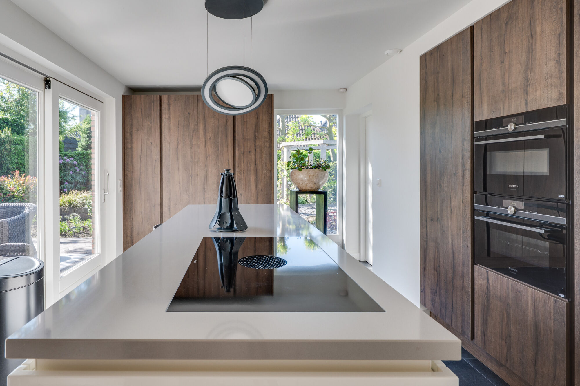 Vanuit de keuken is de tuin via een schuifdeur te bereiken.