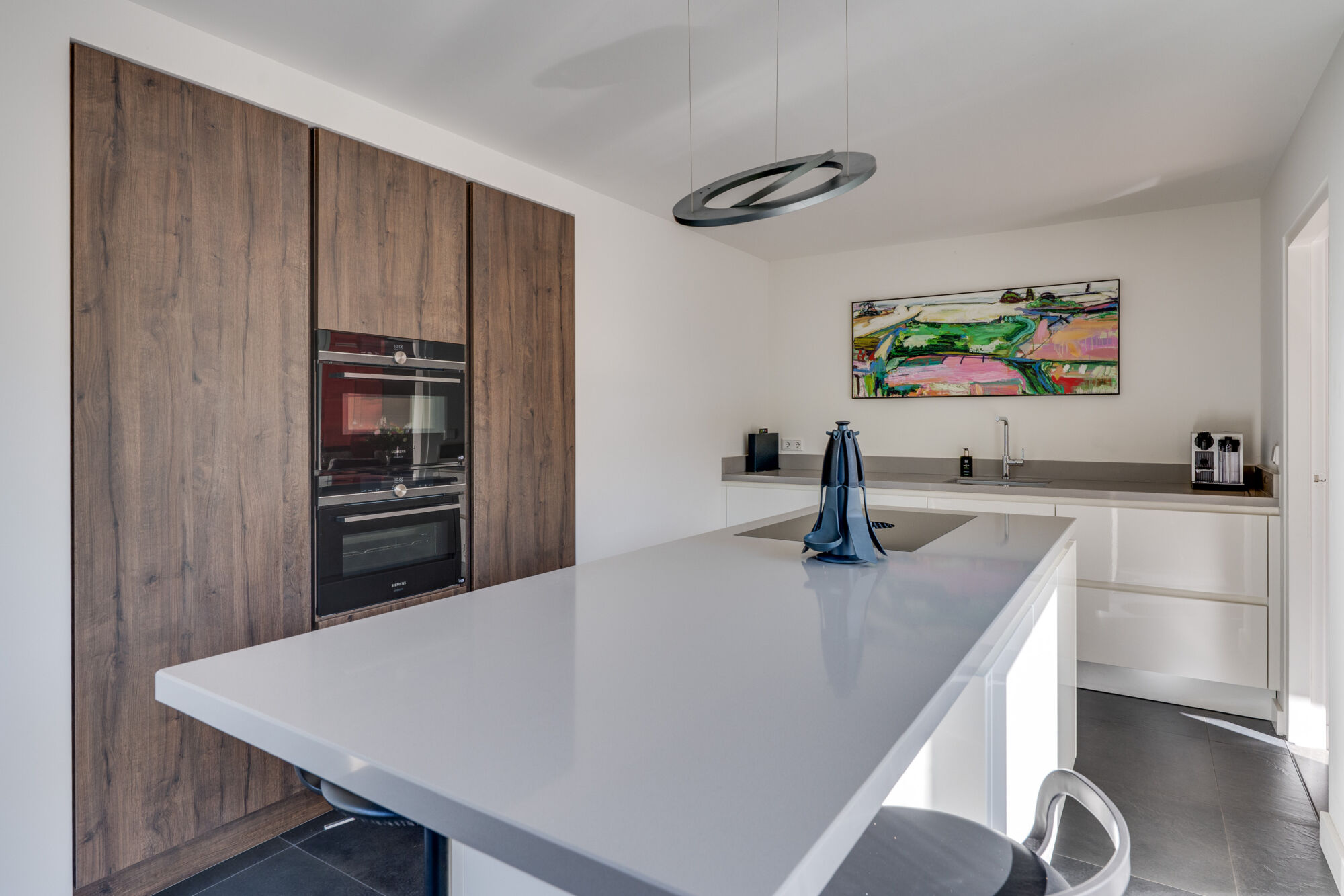De prachtige keuken is voorzien van een kookeiland en een kastenwand met ingebouwde apparatuur en voorziet dan ook meer dan genoeg ruimte om o.a. kookgerei en servies op te bergen. De keuken is in 2021 geheel vernieuwd en voorzien van hoogwaardige inbouwapparatuur, te weten: