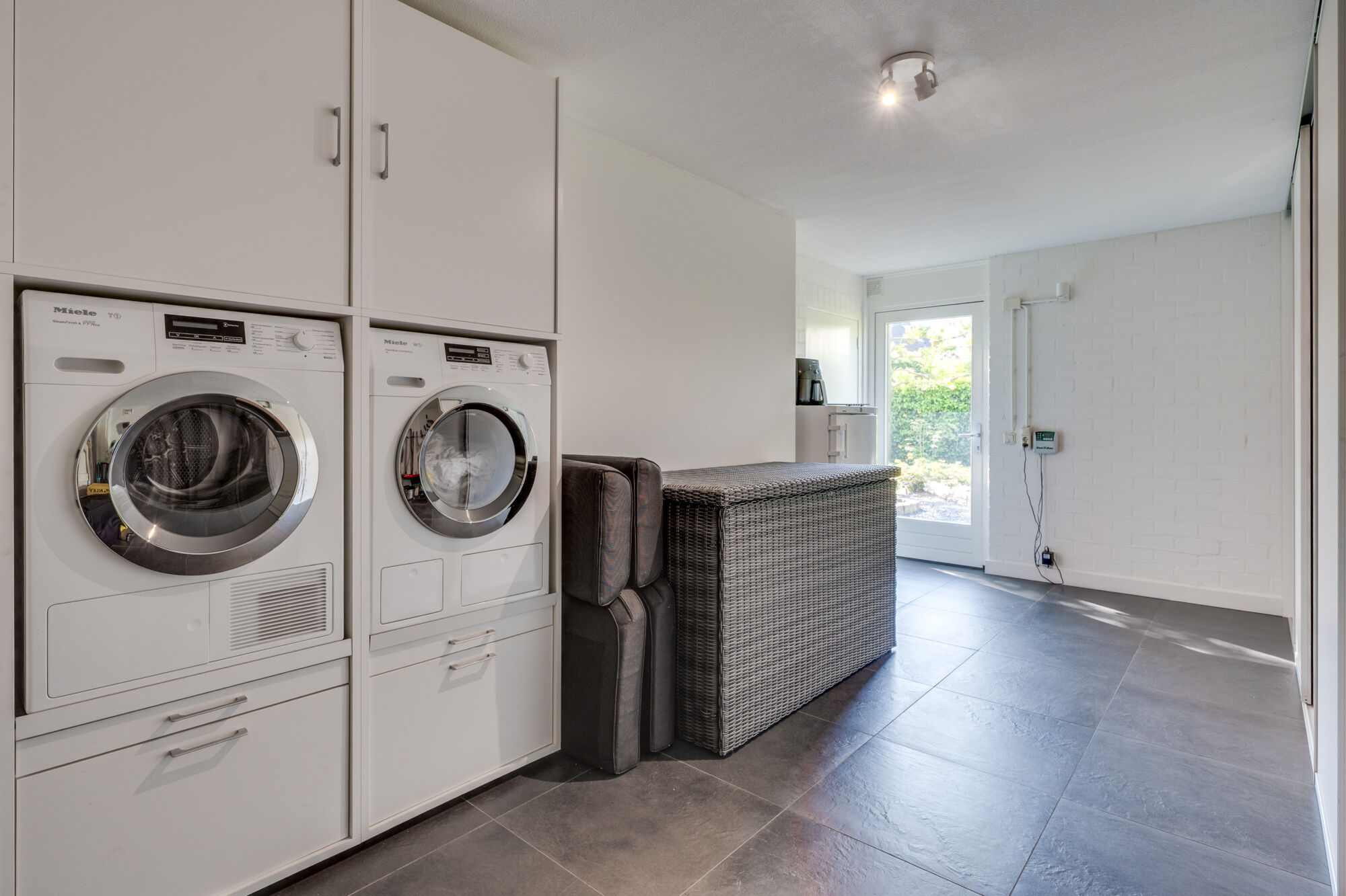 Via de keuken is er toegang tot de bijkeuken, die oorspronkelijk als garage dienstdeed. In deze ruimte is momenteel het witgoed geplaatst. De bijkeuken leent zich uitstekend voor diverse doeleinden, zoals extra opslagruimte, een hobby- of klusruimte of een speelkamer.