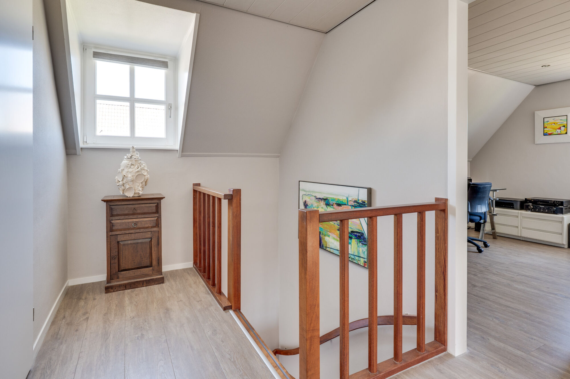 De trap naar de eerste verdieping bevindt zich in de hal van de woning en komt uit op de overloop. Vanuit deze overloop zijn drie mooie slaapkamers, de fraaie, moderne badkamer en de vaste trapopgang naar de tweede verdieping bereikbaar.