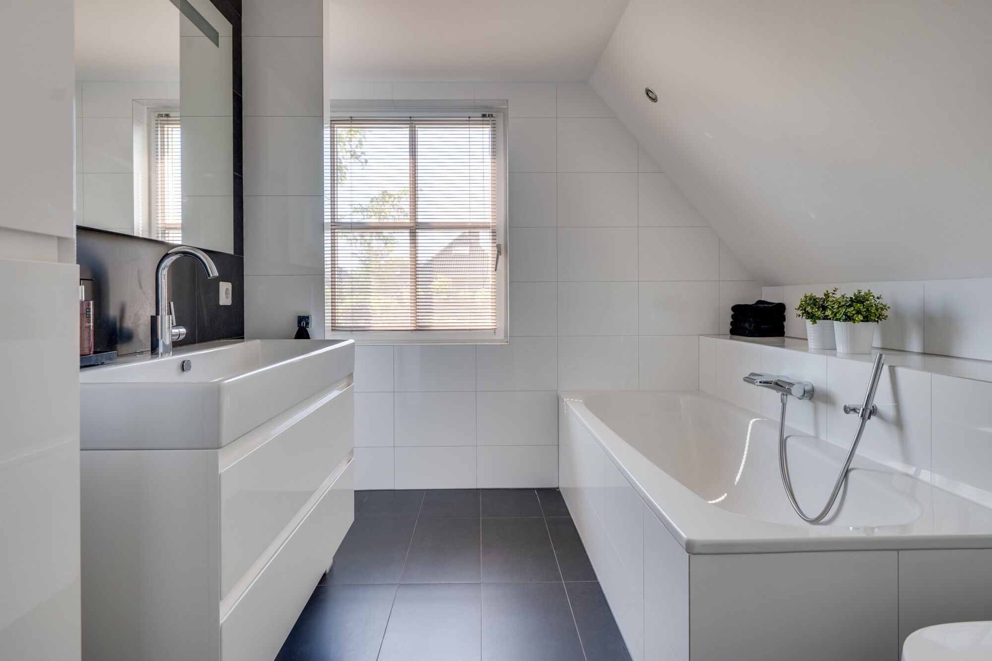 De fraaie badkamer is voorzien van een inloopdouche, een riant ligbad, een tweede toilet en een wastafelmeubel. Een groot raam voorziet de ruimte van flink veel zonlicht en biedt de mogelijkheid tot extra ventilatie. De wanden zijn volledig betegeld in witte kleur. De vloer is betegeld met prachtige, tijdloze donkere tegels. Er is mechanische