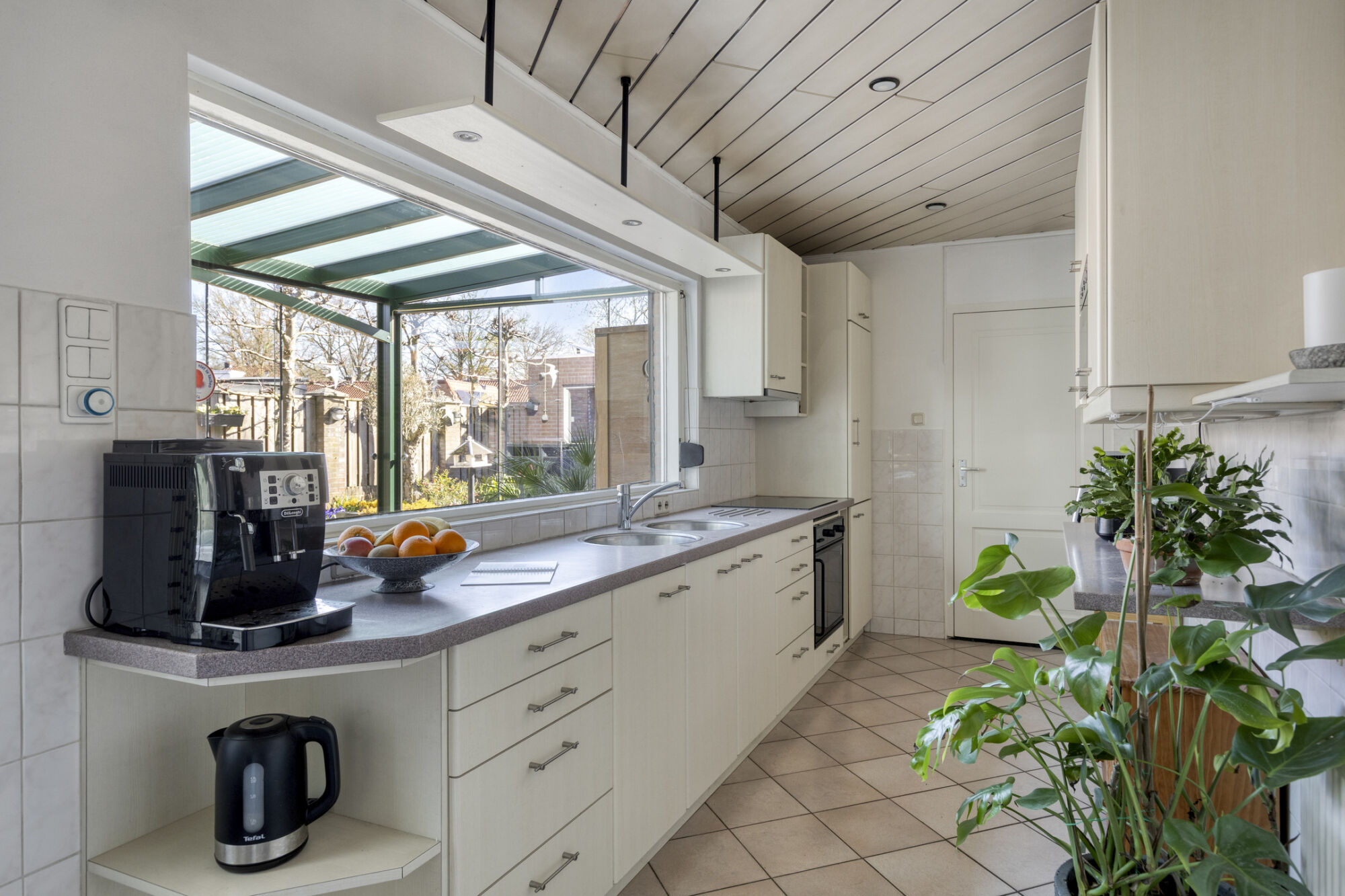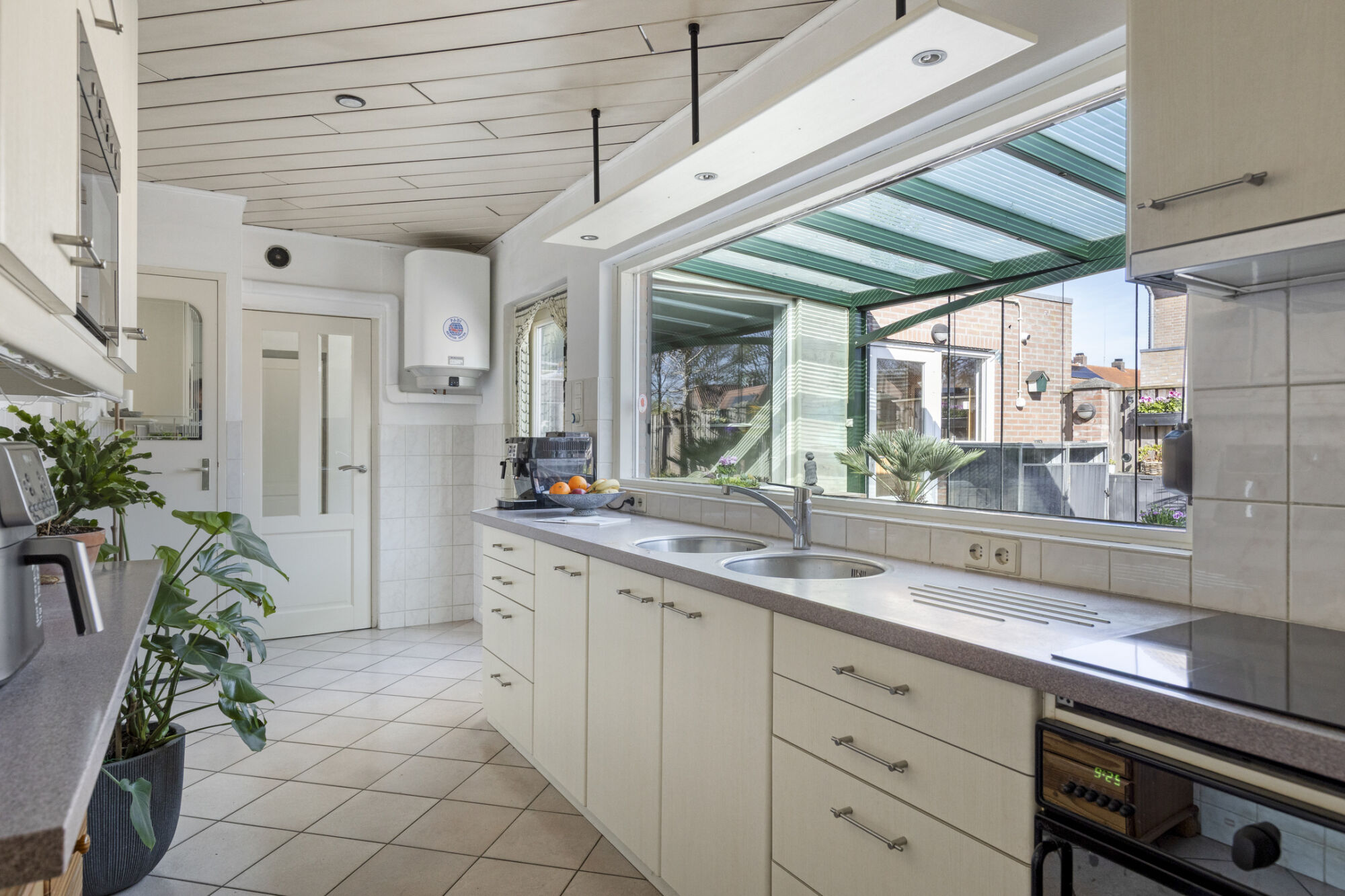 Volop werk- en bergruimte in deze keuken! De keuken bestaat uit een wandopstelling met een dubbele spoelbak, een inductiekookplaat met daarboven een in een bovenkastje geïntegreerde afzuigkap, een oven, een koelkast en een diepvries. Aan de andere zijde is een handige bar met daarboven wandkasten met een ingebouwde magnetron. Een groot raam geeft je uitzicht op de tuinkamer. De keuken wordt verwarmd door een lucht / lucht warmtepomp. In de hoek van de keuken is de elektrische boiler.
