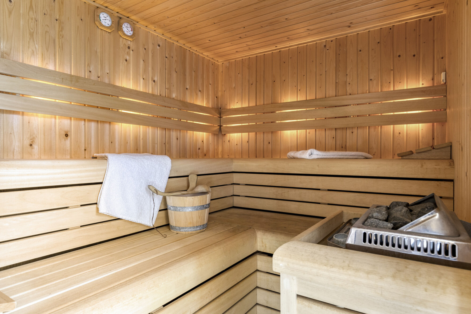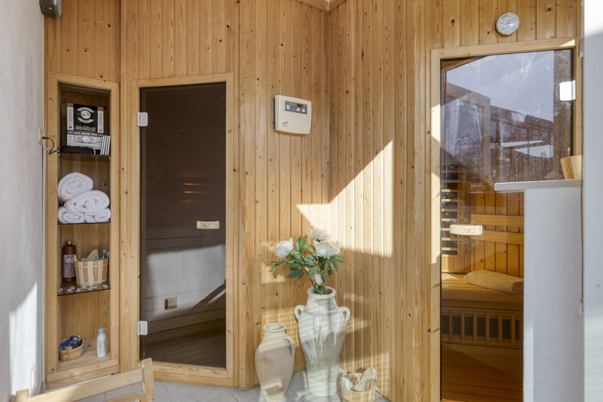 Heerlijk genieten in deze ruimte waar nu een Finse sauna en infrarood sauna zijn geplaatst. Op de vloer ligt een tegel en de wanden zijn gestuct. De sauna’s zijn ter overname.