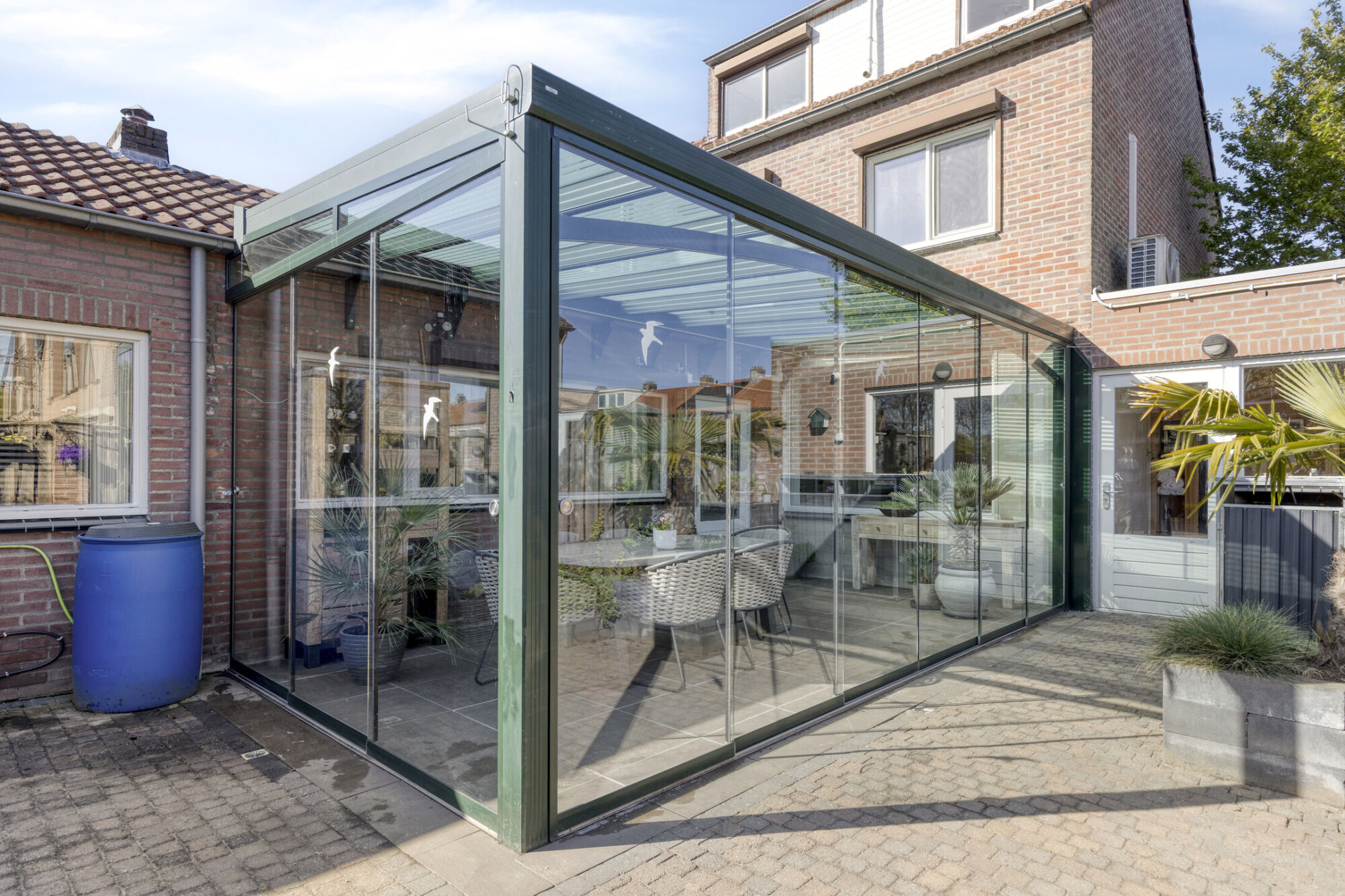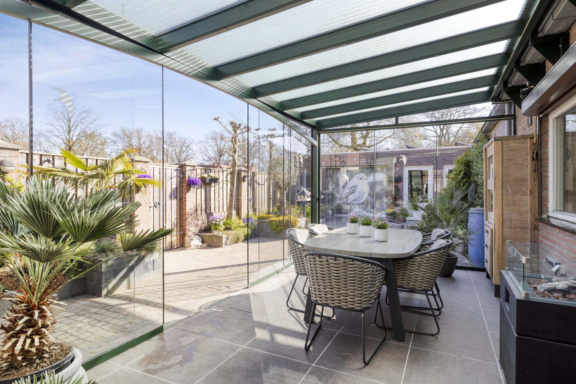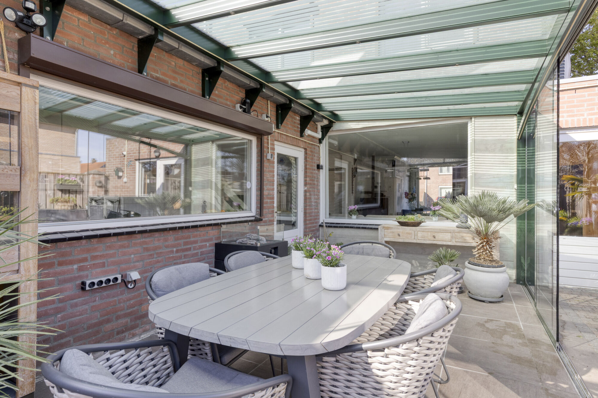 Hier kun je tot laat in de middag van de zon genieten. De tuinkamer heeft rondom een aluminium frame met glazen panelen. Zo kun je al in het voorjaar en in het najaar van de zon genieten. De panelen kunnen ook opengeschoven worden zodat je een veranda hebt. Op de vloer liggen fraaie keramische tegels.