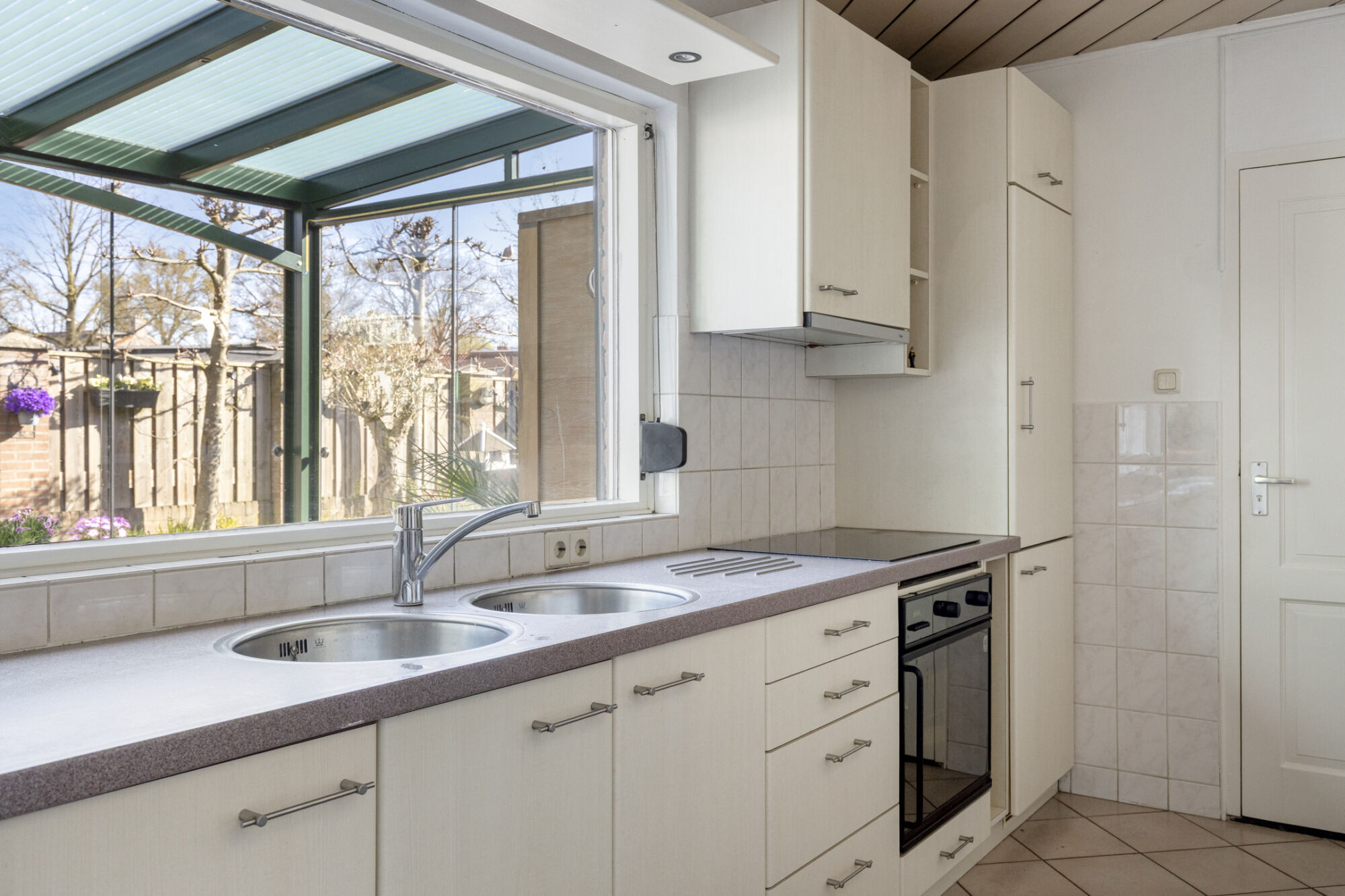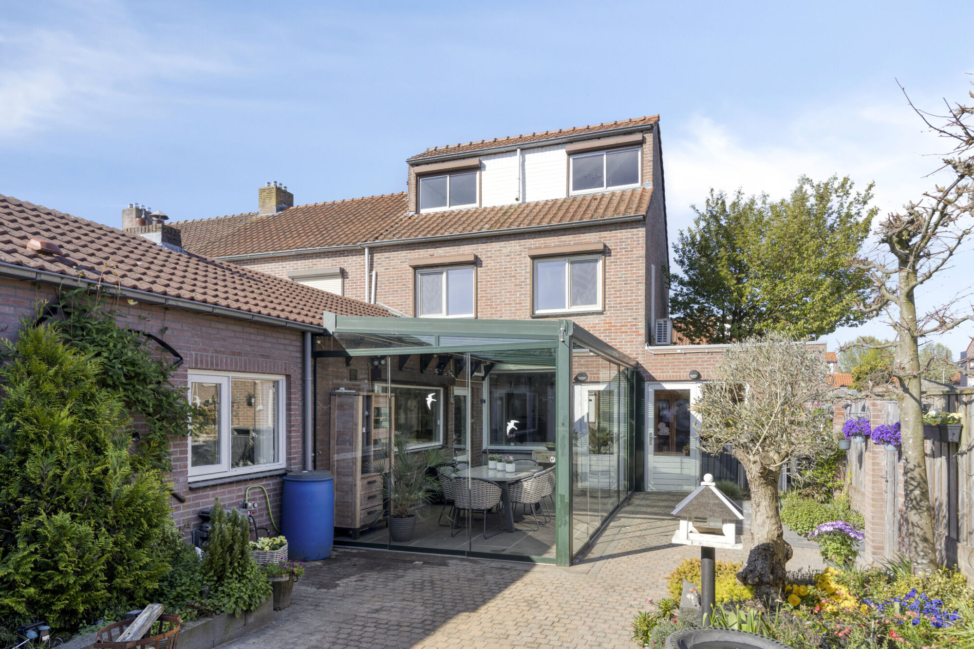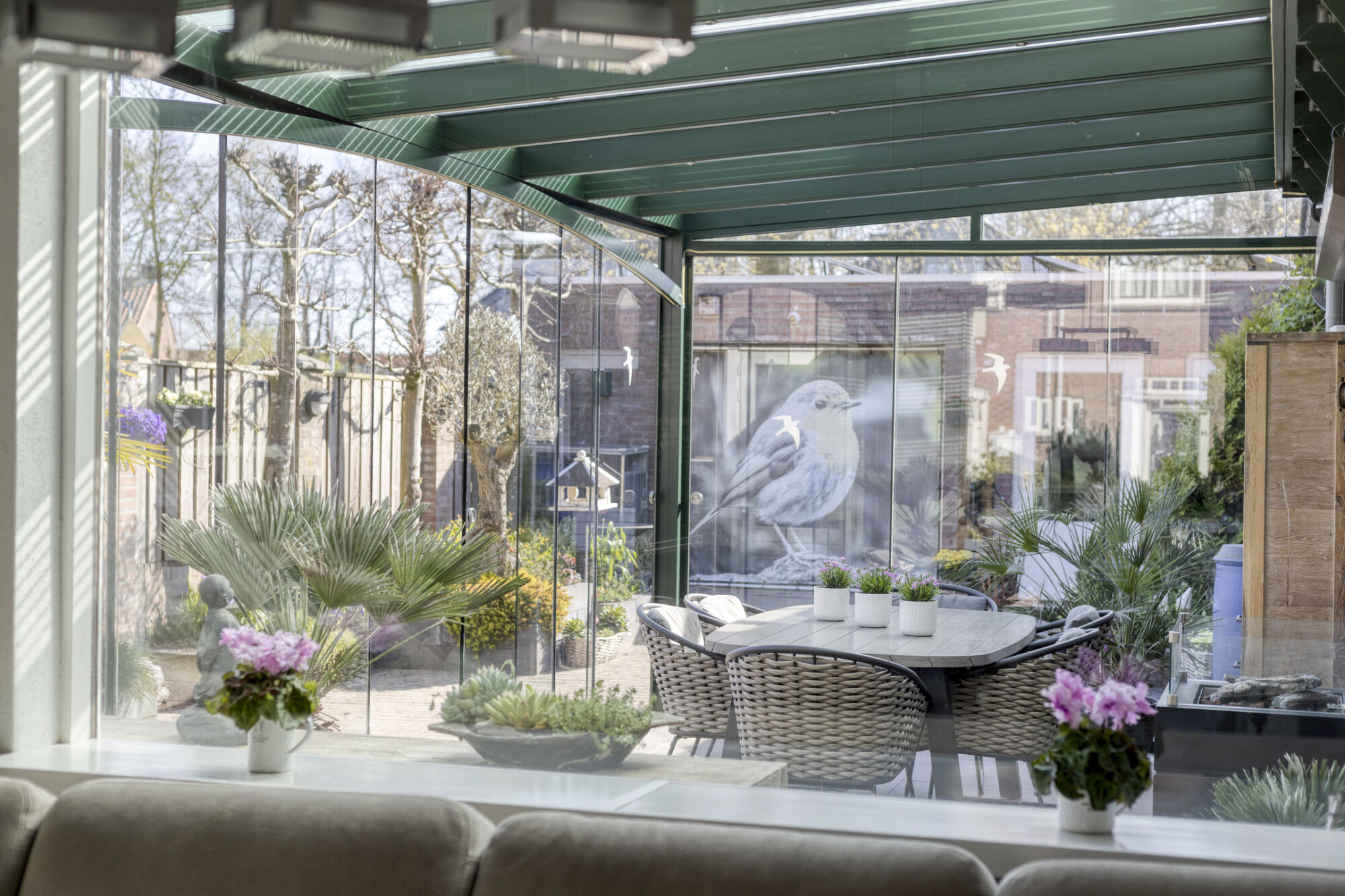 Hier kun je tot laat in de middag van de zon genieten. De tuinkamer heeft rondom een aluminium frame met glazen panelen. Zo kun je al in het voorjaar en in het najaar van de zon genieten. De panelen kunnen ook opengeschoven worden zodat je een veranda hebt. Op de vloer liggen fraaie keramische tegels.