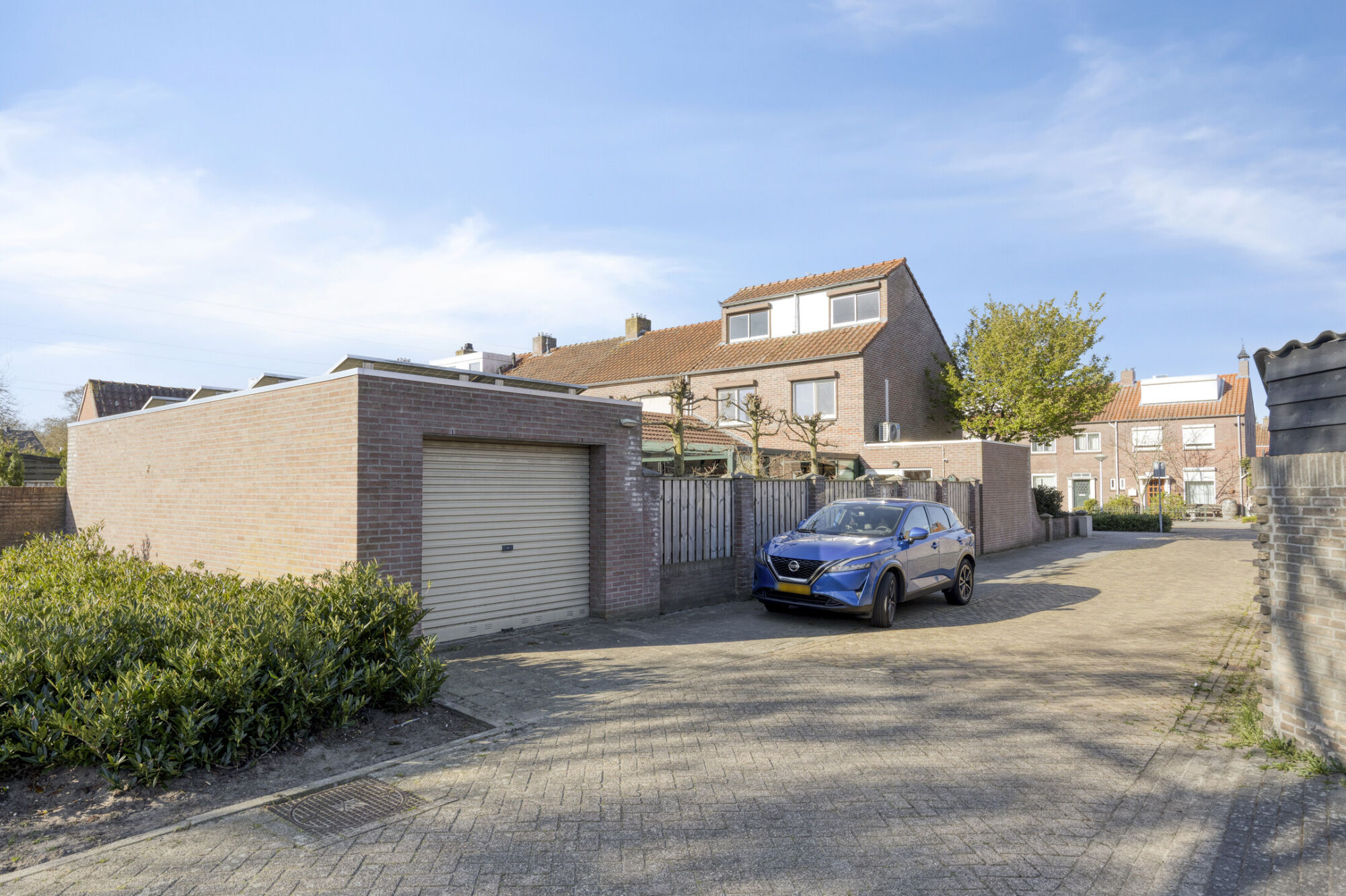Achter in de tuin is de aanpandige garage met een garagedeur naar de zijstraat en een grote deur richting de tuin zodat je gemakkelijk met grote spullen achterom kunt. Aan de zijkant van het perceel is een grote strook waar je kunt parkeren en handig je garage in manoeuvreert.