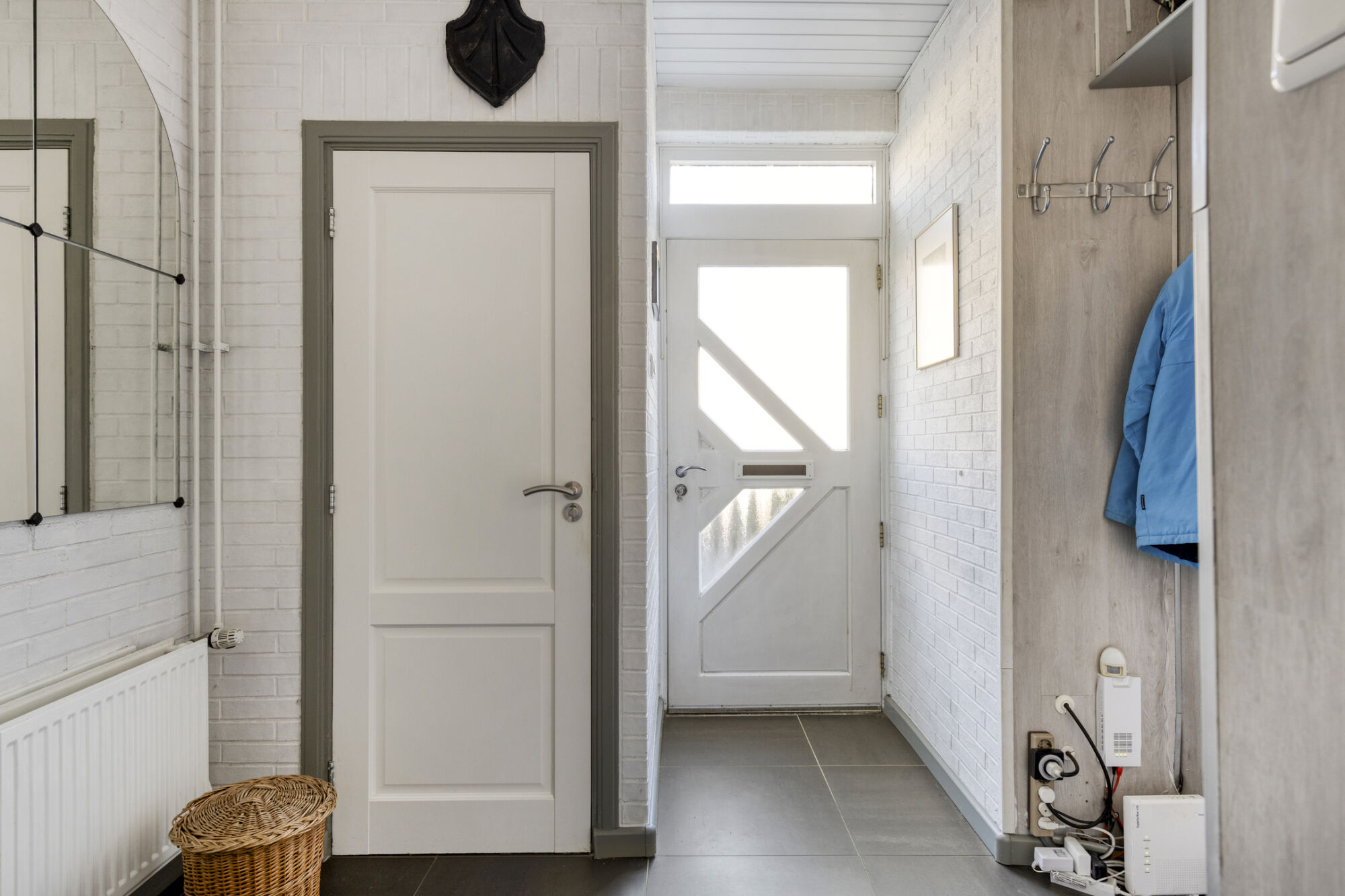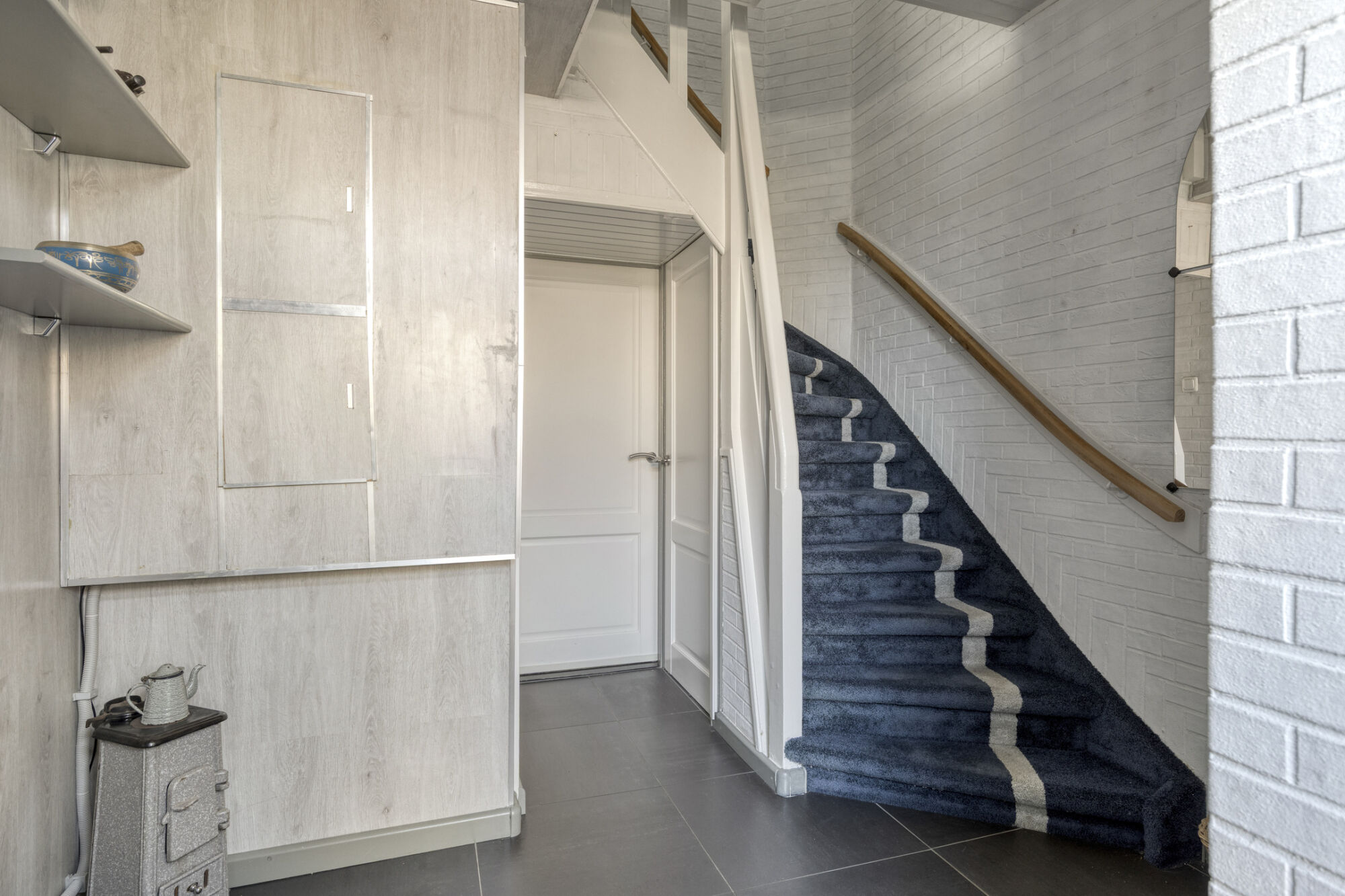 De ruime hal geeft toegang tot de garderobe, de vernieuwde meterkast, de trapopgang, de verrassend ruime kelder, de woonkamer en de moderne toiletruimte. Deze is voorzien van een hangtoilet met een fraai bijpassend fonteintje.