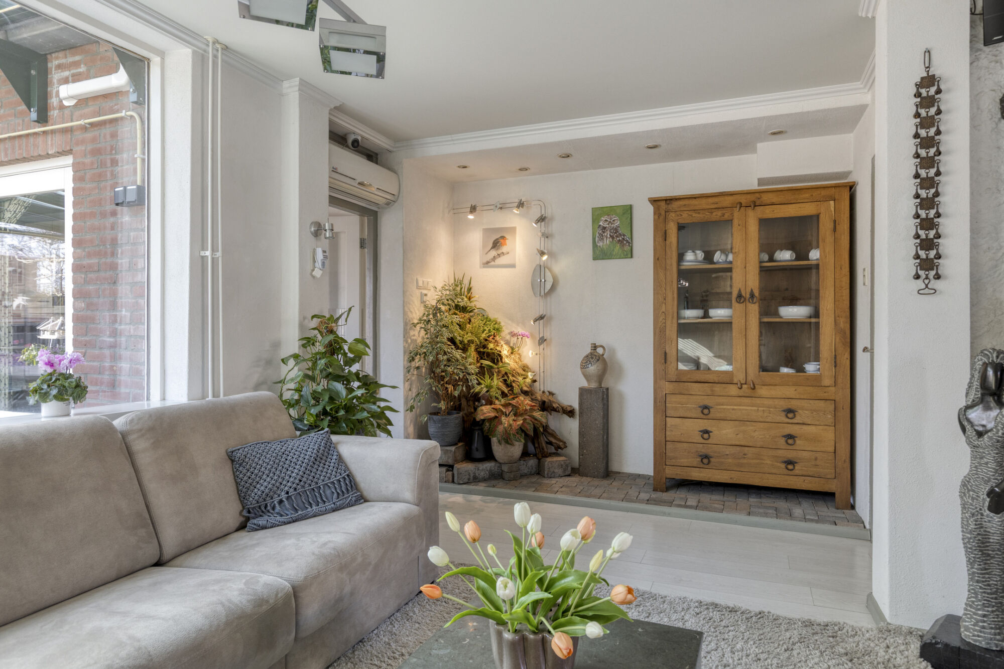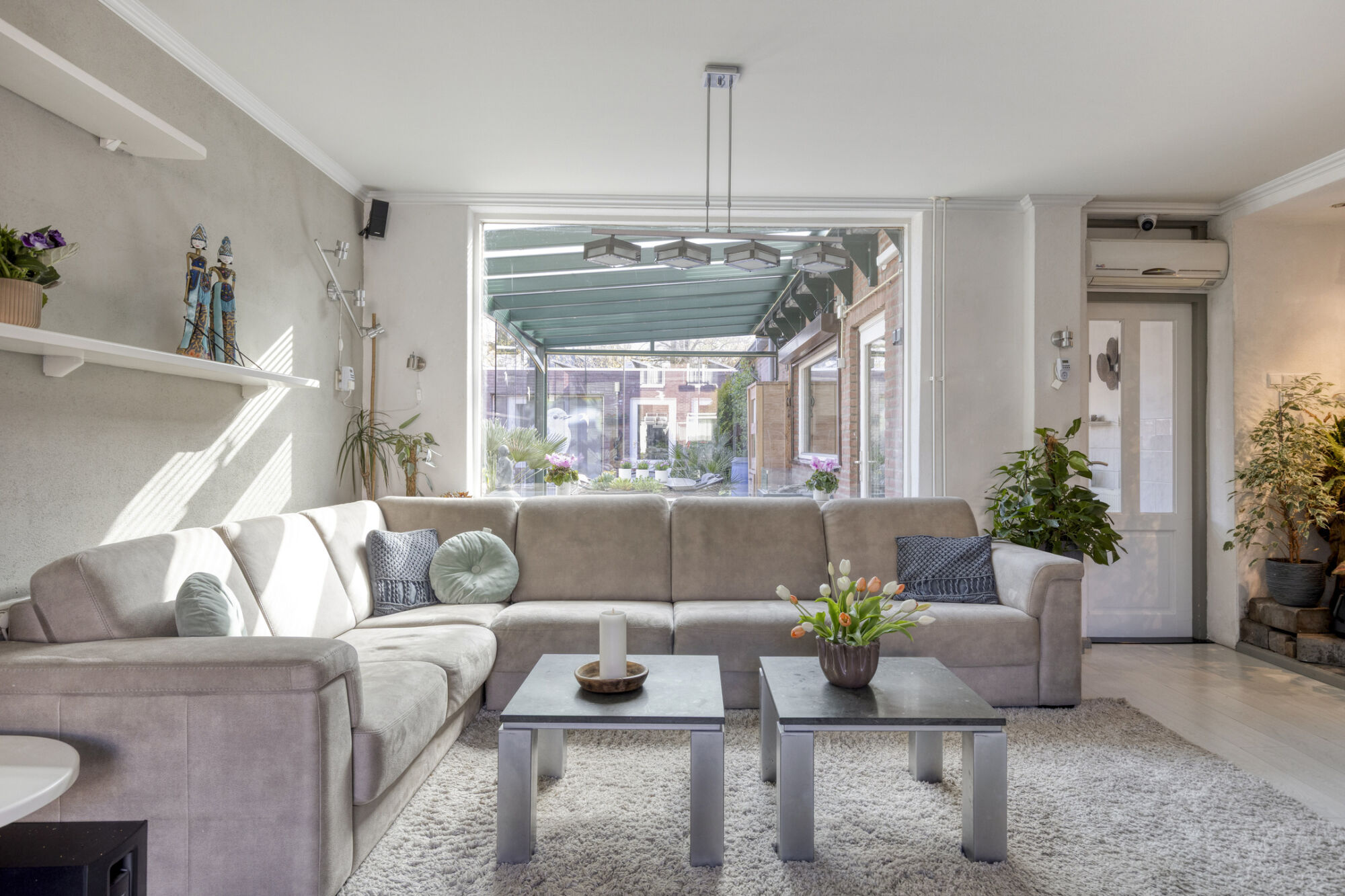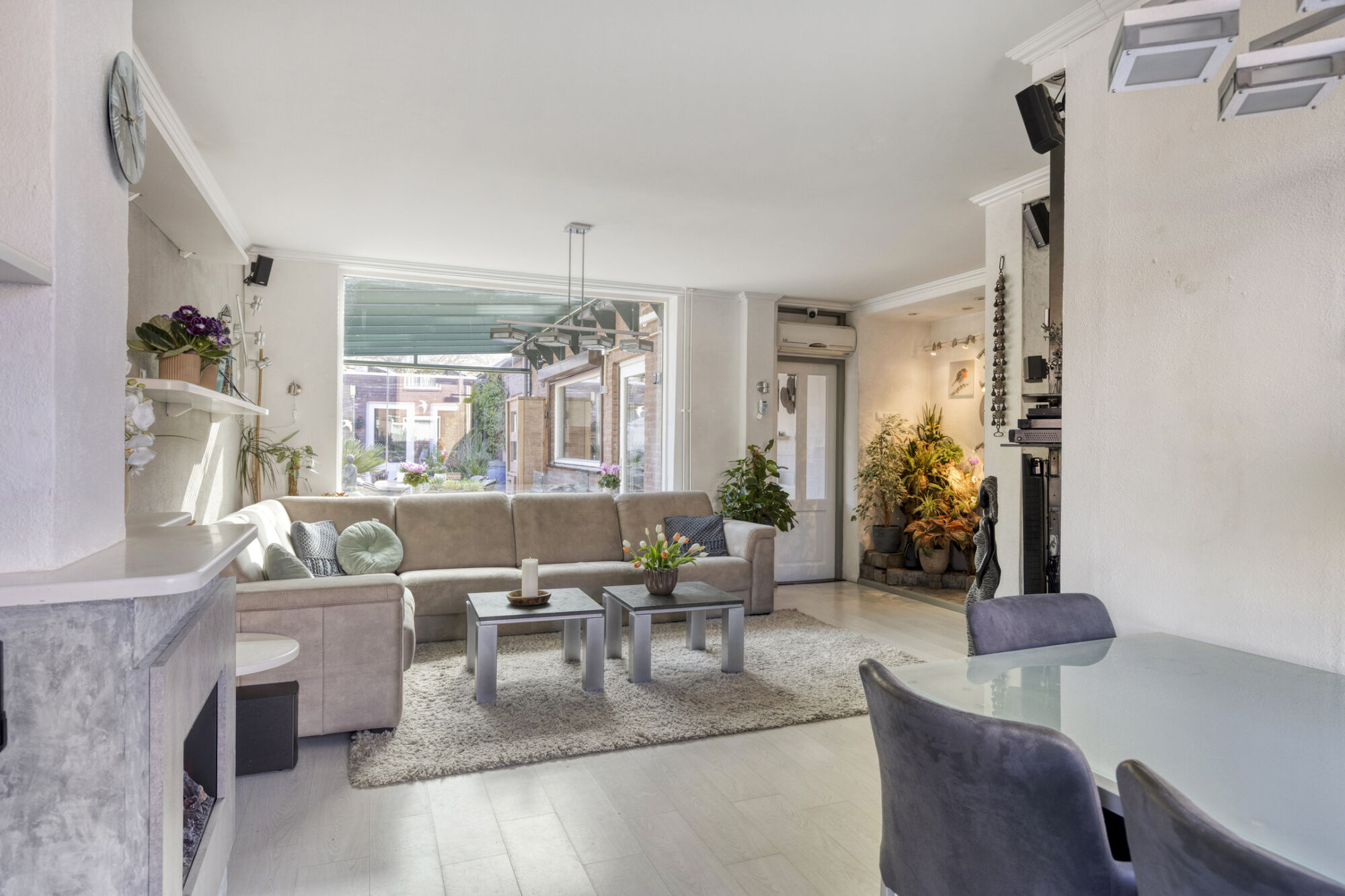 De verschillende raampartijen laten het licht rijkelijk binnenstromen in deze woonkamer. De ramen zijn voorzien van rolluiken. Op de vloer ligt een laminaat. Daarnaast wordt de ruimte verwarmd door lucht / lucht warmtepomp die ook de keuken verwarmt. Een elektrische sfeerhaard (ter overname) zorgt voor extra warmte en ambiance. Wat grover stucwerk wordt hier gecombineerd met sierpleister en een strak plafond met fraaie sierlijsten. Vanuit de woonkamer kijk je zo de tuinkamer in wat voor een ruimtelijk effect zorgt. Heel handig is de ingebouwde kast.