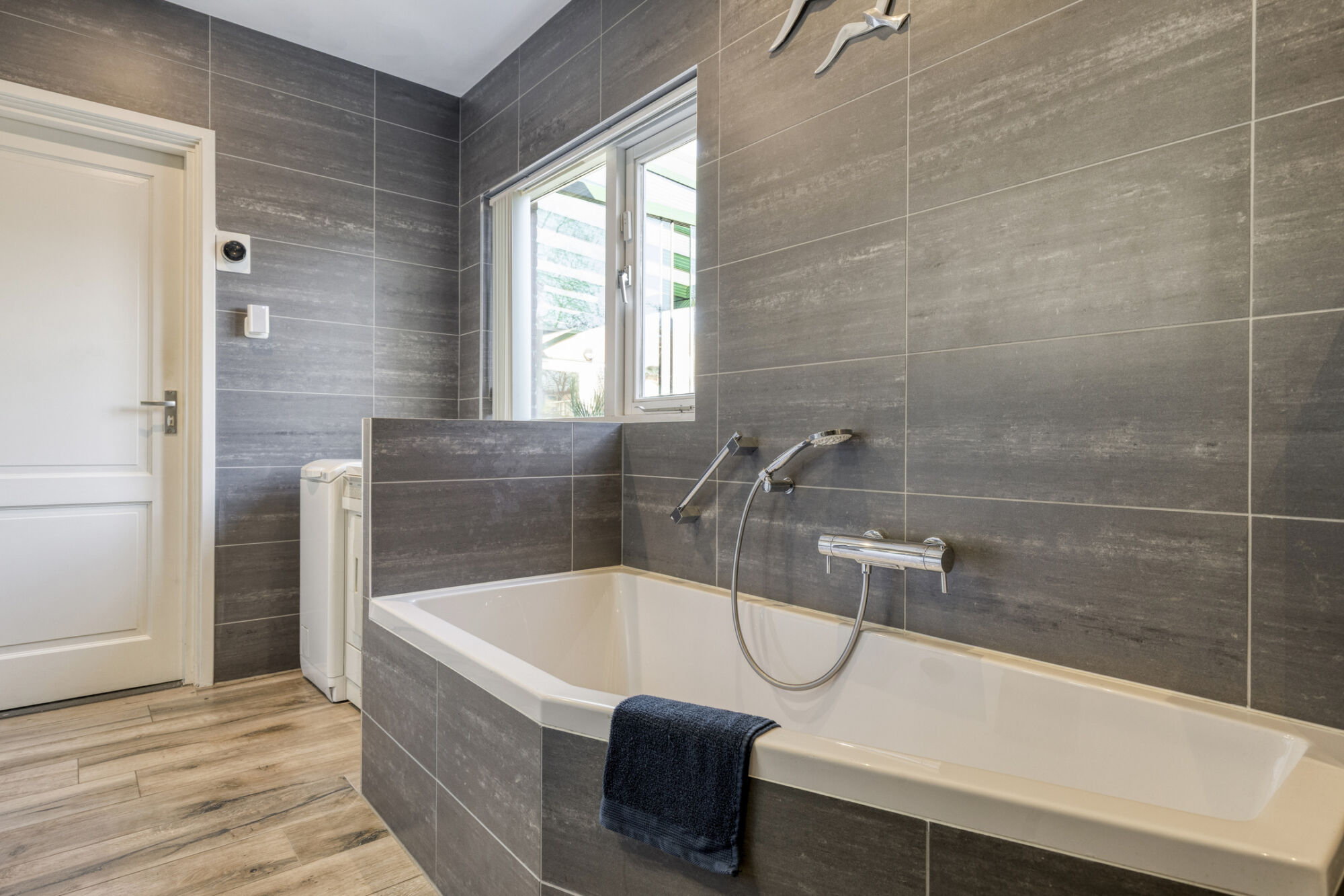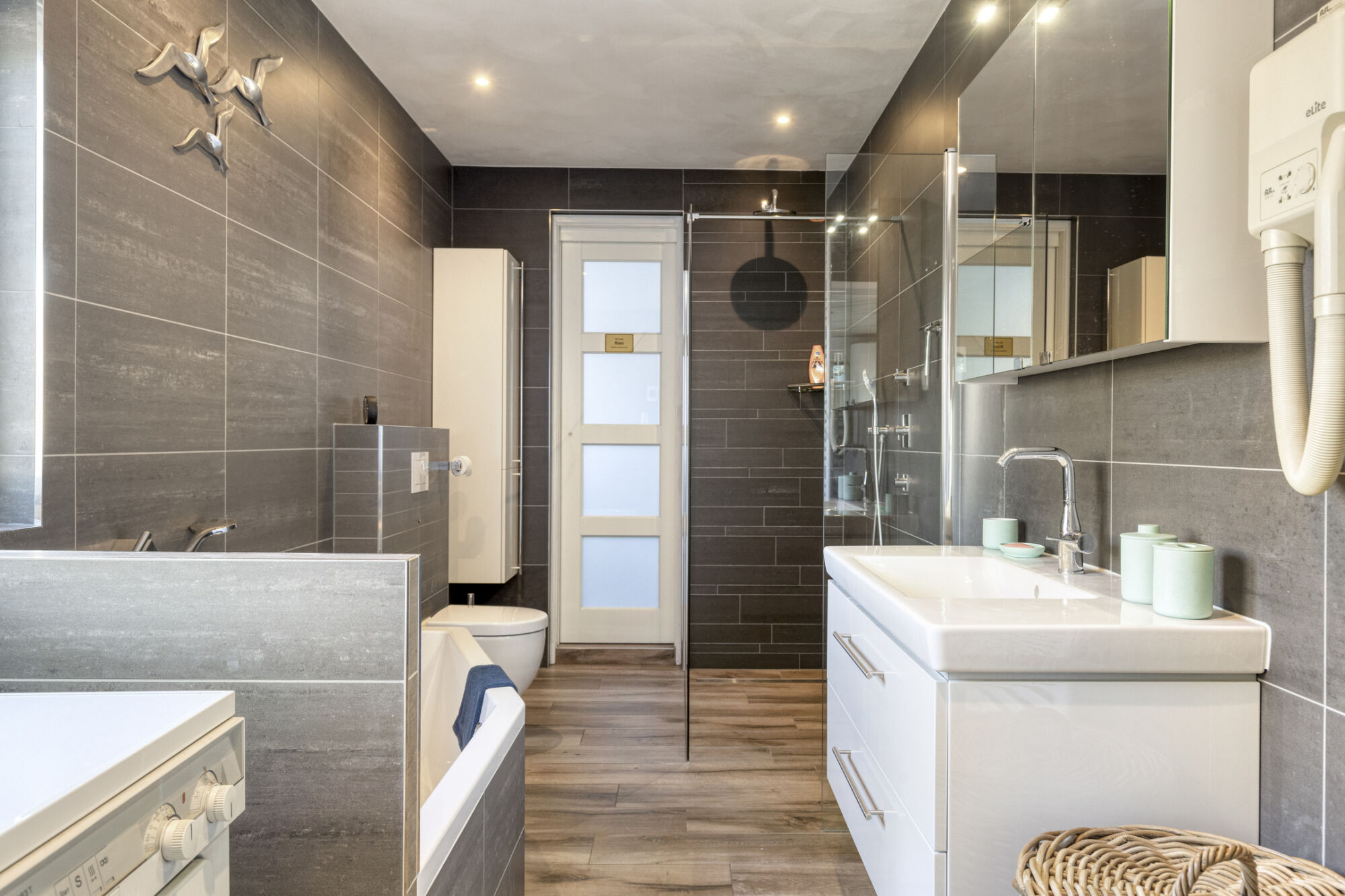 Deze ruime badkamer is van alle gemakken voorzien! Zo is er een fraai ligbad met thermostaatkraan, een wastafelmeubel met bergruimte en een spiegelkast, een wandkast, een hangtoilet en een inloopdouche met een in de wand geïntegreerde hand- en regendouche. Een designradiator zet het puntje op de i. Op de verwarmde vloer liggen fraaie houtlook tegels die gecombineerd worden met antracietkleurige wandtegels. Heel handig is dat er een aansluiting voor wasmachine en droger is zodat je niet steeds met de was naar boven hoeft. Met de thermostaat stel je eenvoudig de temperatuur van de badkamer in.