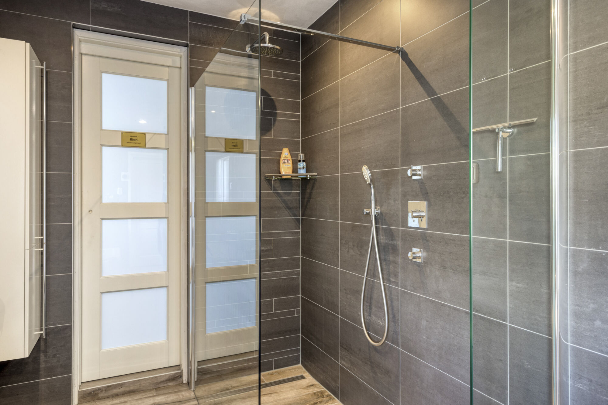 De badkamer heeft een douche met thermostaatkraan met een handdouche en een wastafel.