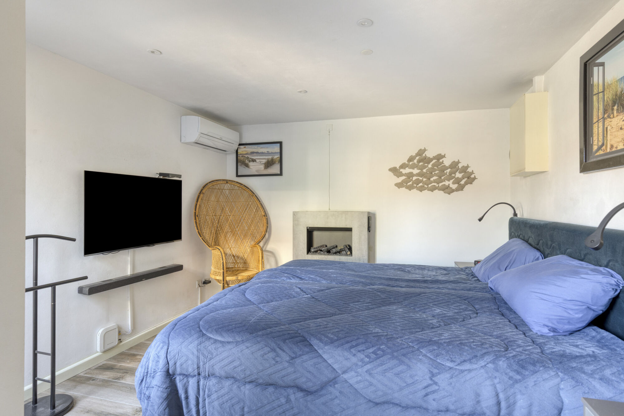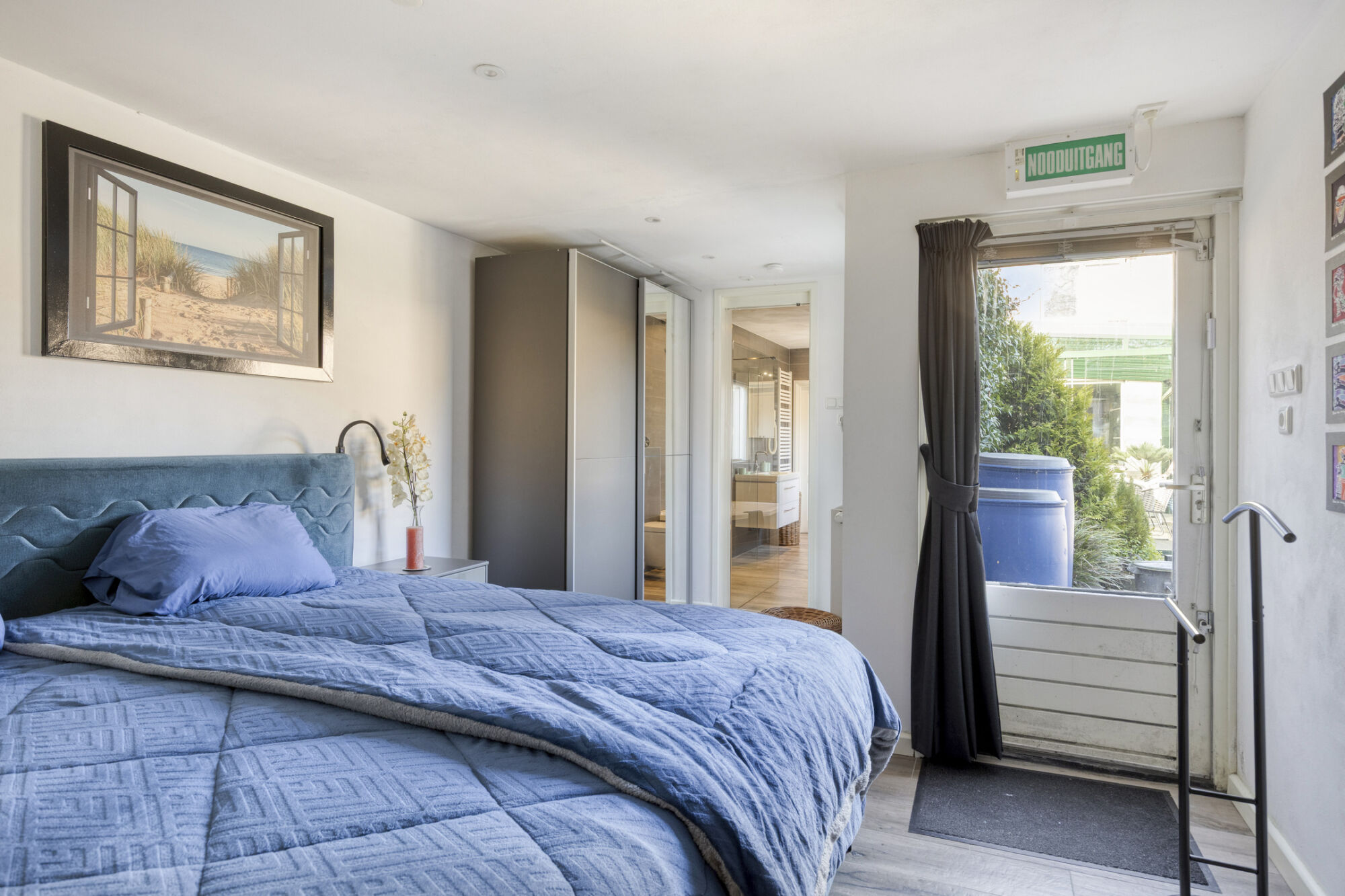 Deze ruime slaapkamer heeft een fraaie verwarmde houtlook tegelvloer, strak gestucte wanden en een strak plafond met spotverlichting. Een airco zorgt hier voor een comfortabel binnenklimaat. De kamer is meer dan ruim genoeg voor een groot tweepersoons bed en een kledingkast. Een deur geeft je toegang tot de tuin.