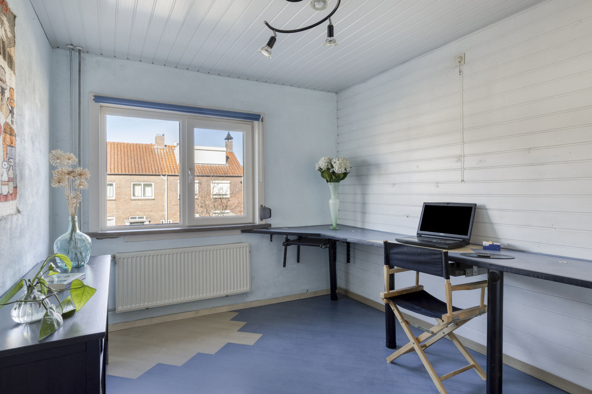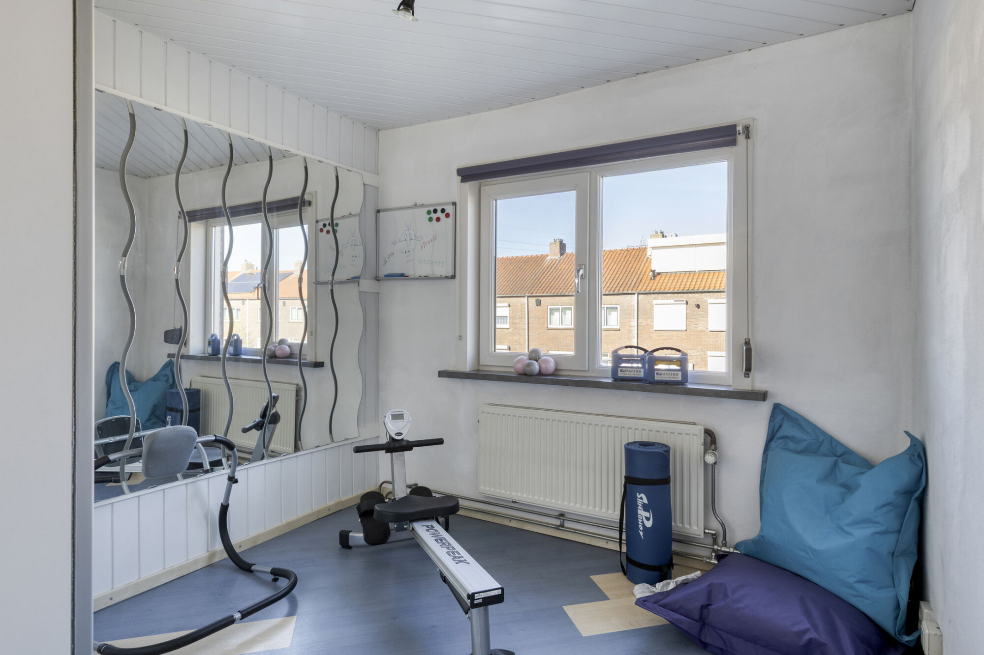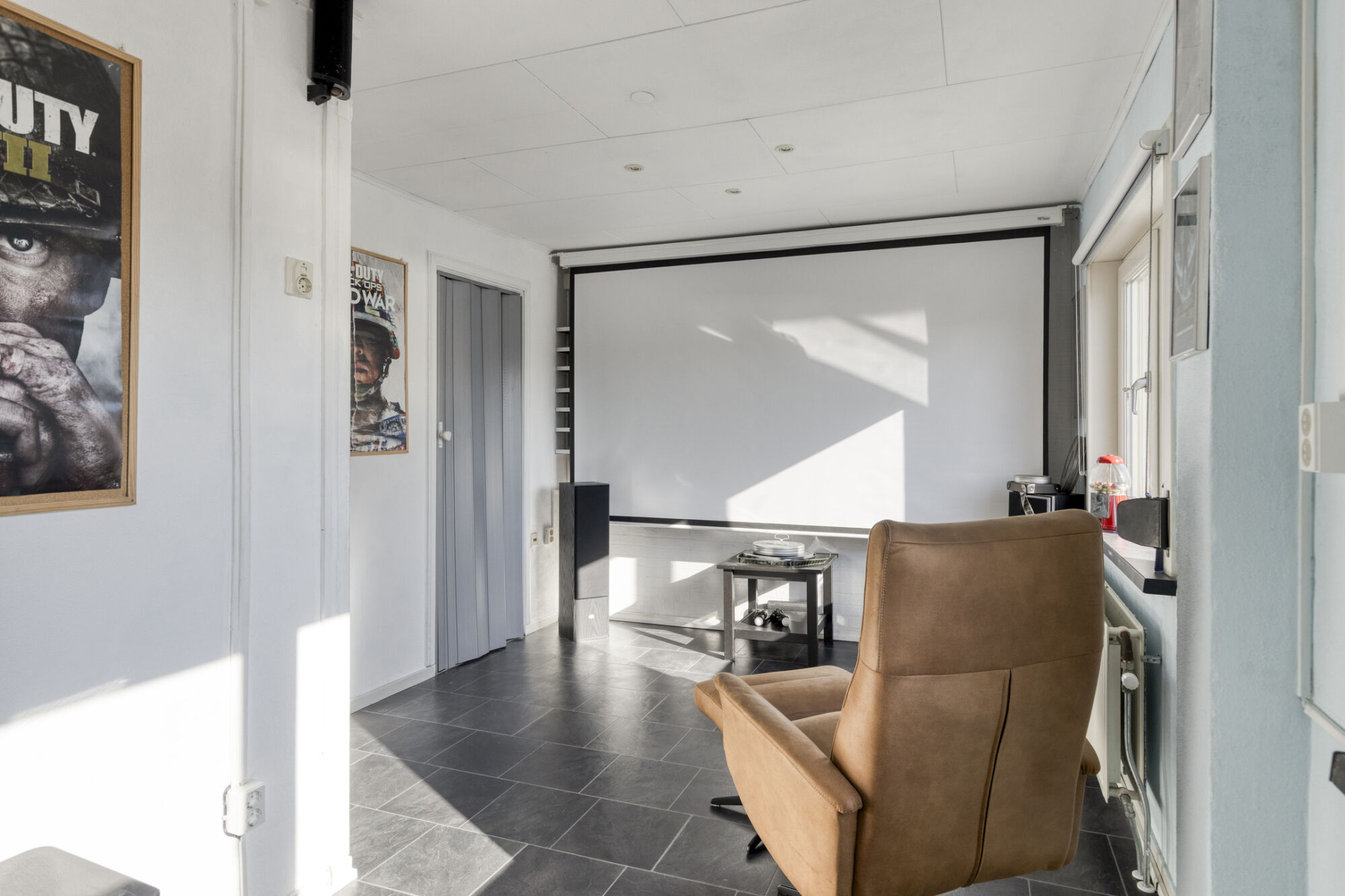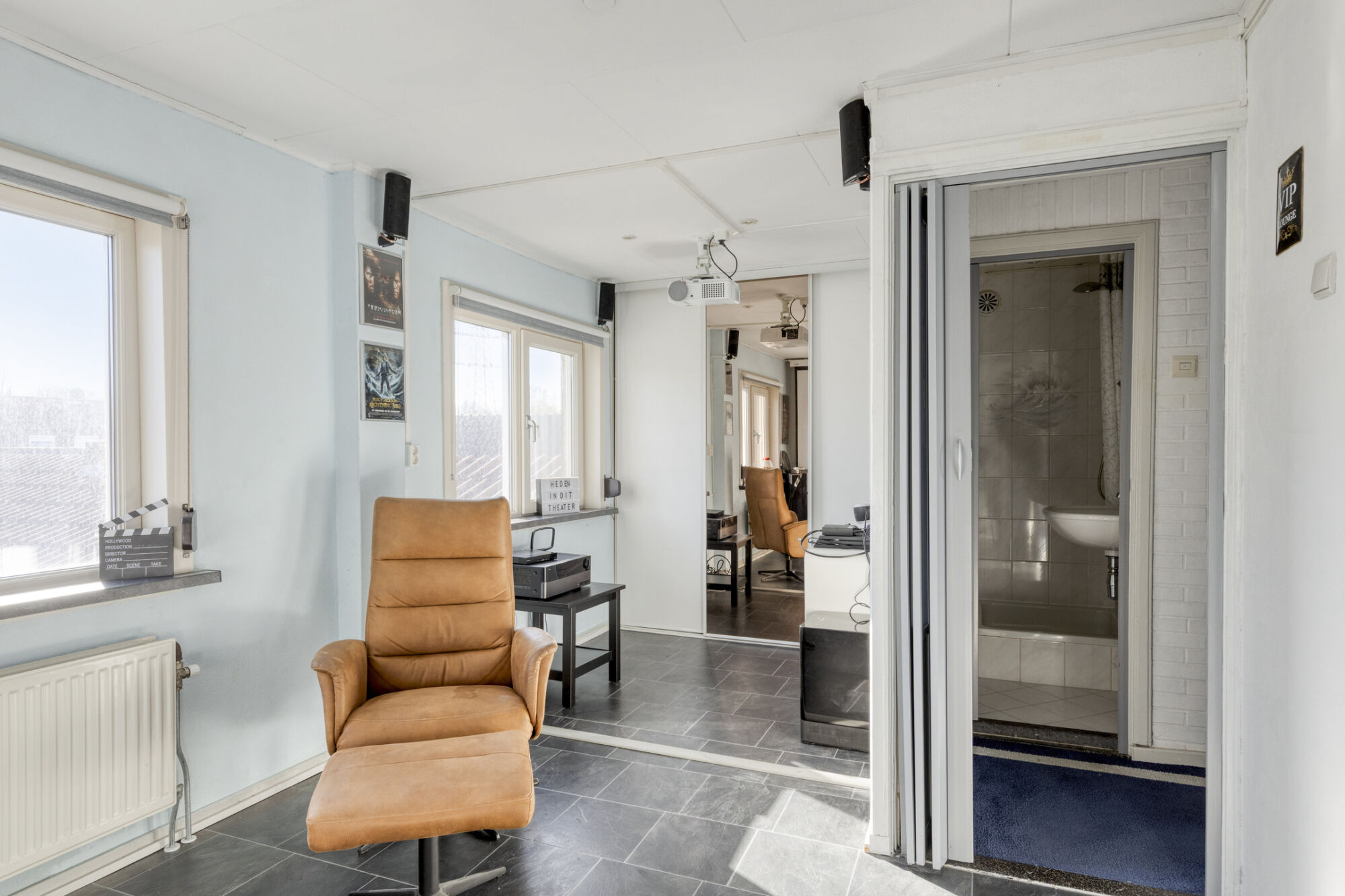 gebruik als bioscoop. De andere twee kamers zijn aan de voorzijde gelegen en nu in gebruik als sportkamer en werkkamer.