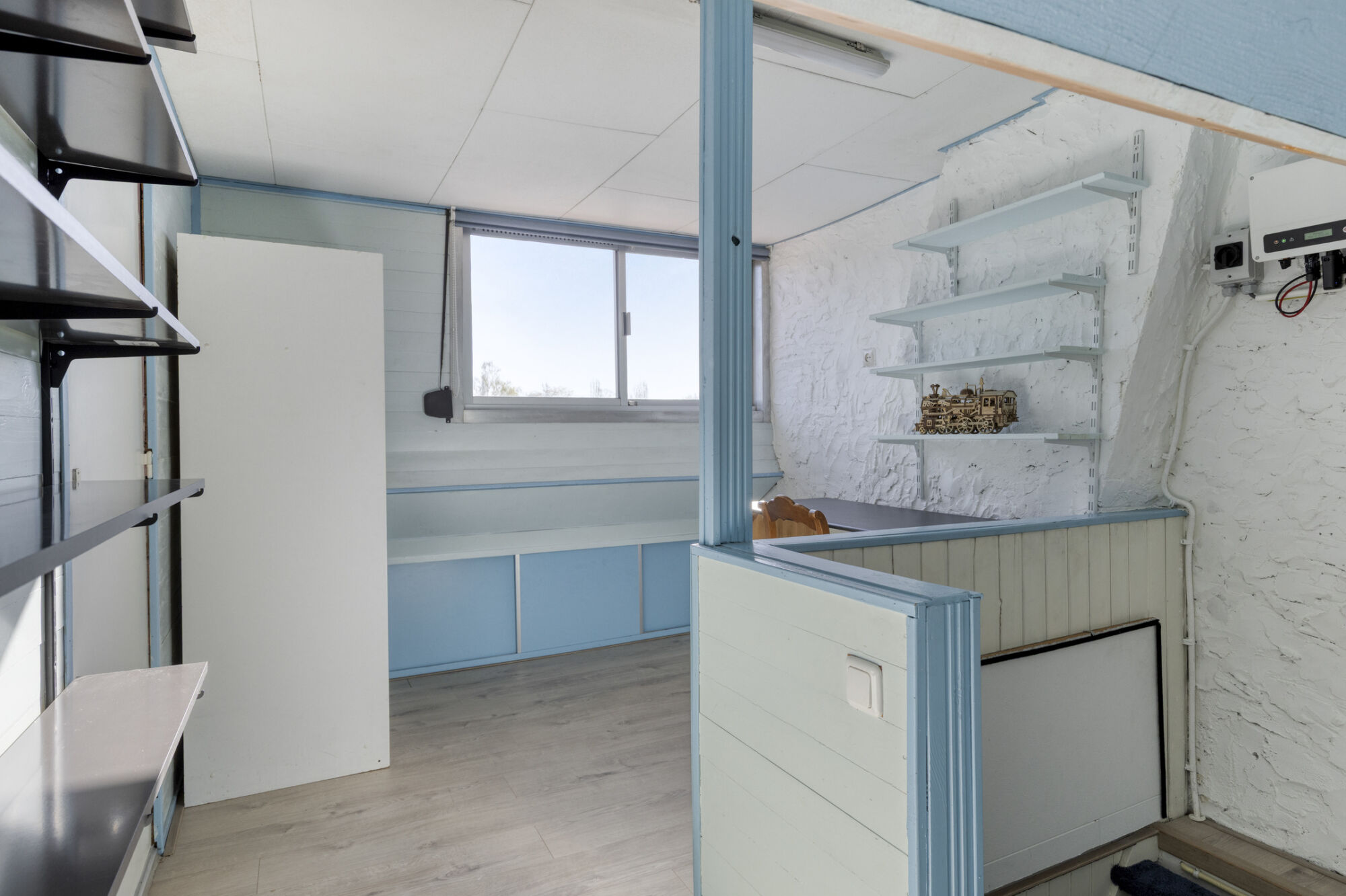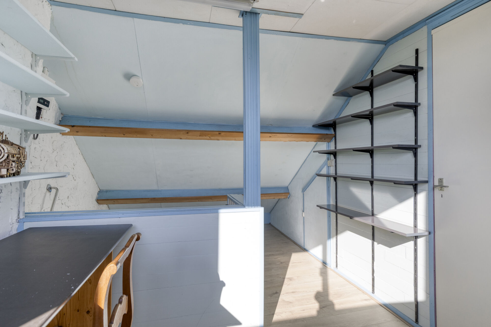 De tweede verdieping is ruim en licht vanwege de dakkapellen met ook hier rolluiken. Onder de knieschotten is volop bergruimte. Op de voorzolder hangt een van de omvormers van de zonnepanelen. Een deur leidt je naar de vijfde slaapkamer met ook hier een dakkapel.