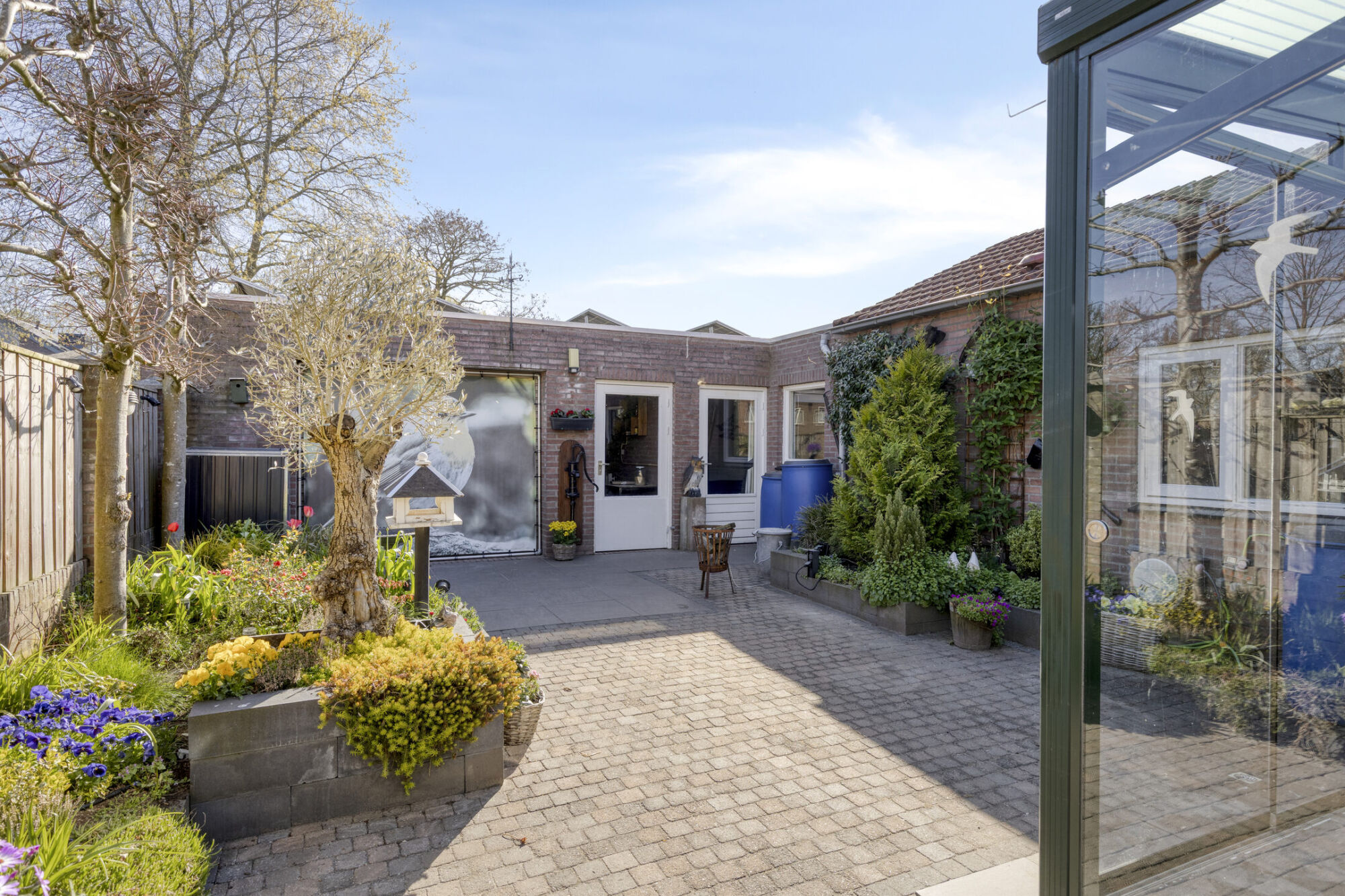 In de onderhoudsvriendelijke, privacy biedende tuin worden cobblestones gecombineerd met vaste plantenbakken met meerjarige planten, struiken en bomen. Leilindes zorgen voor extra privacy. De tuin wordt geflankeerd door een houten schutting met gemetselde penanten. Achter in de tuin is de deur naar de garage. Aan de zijkant van het perceel is de poort achterom. Je loopt zo naar het dichtstbijzijnde speeltuintje. Direct buiten de poort kun je je auto parkeren.
