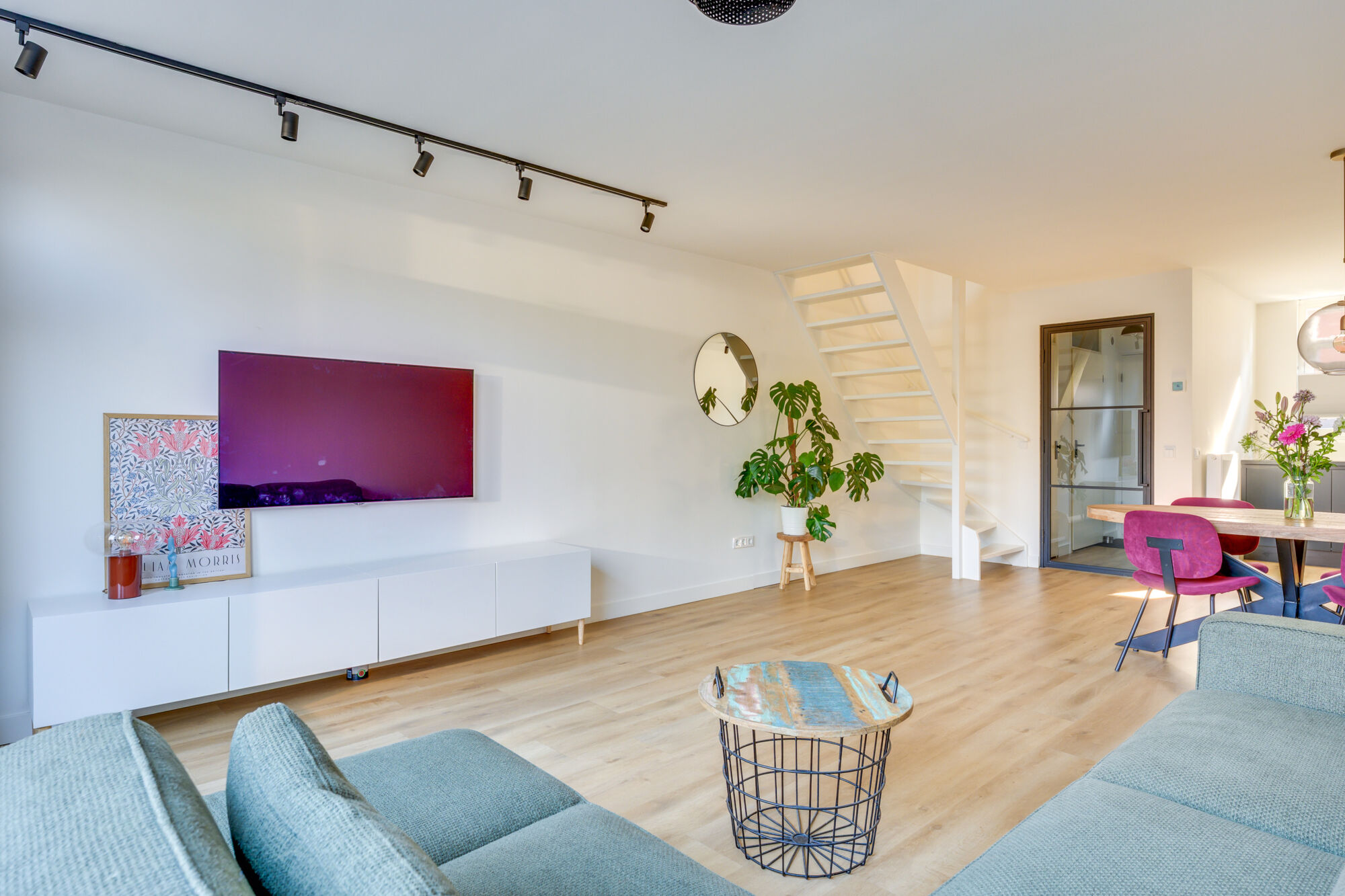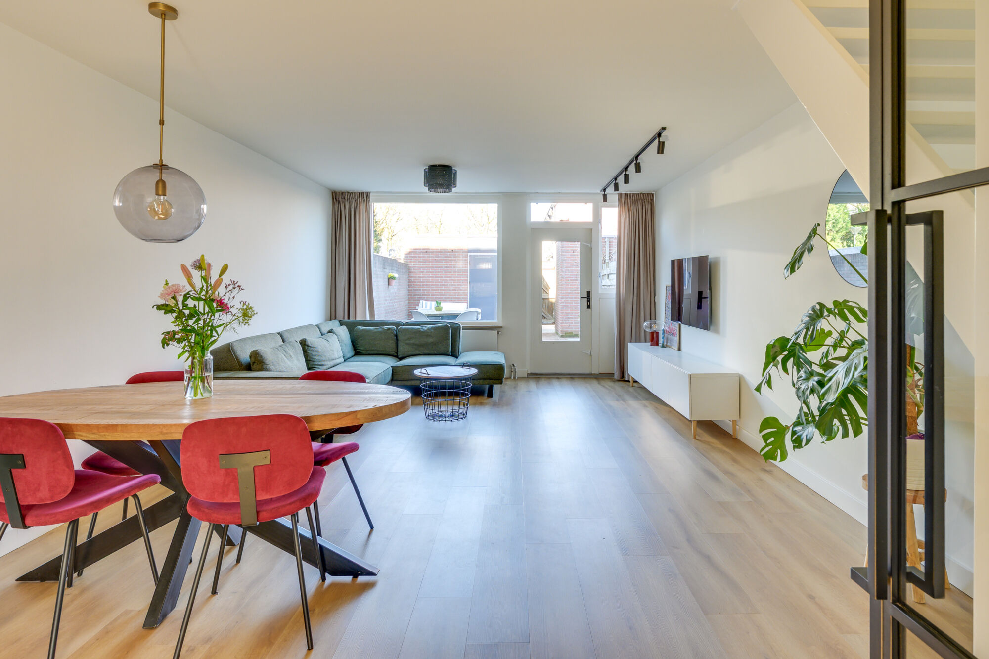 Ook in de woonkamer ervaart u de strakke afwerking, een zeer moderne woning welke met recht instapklaar te noemen is! De woonkamer is ruim van opzet, voorzien van mooi uitzicht op de achtertuin en de trapopgang richting de verdieping.